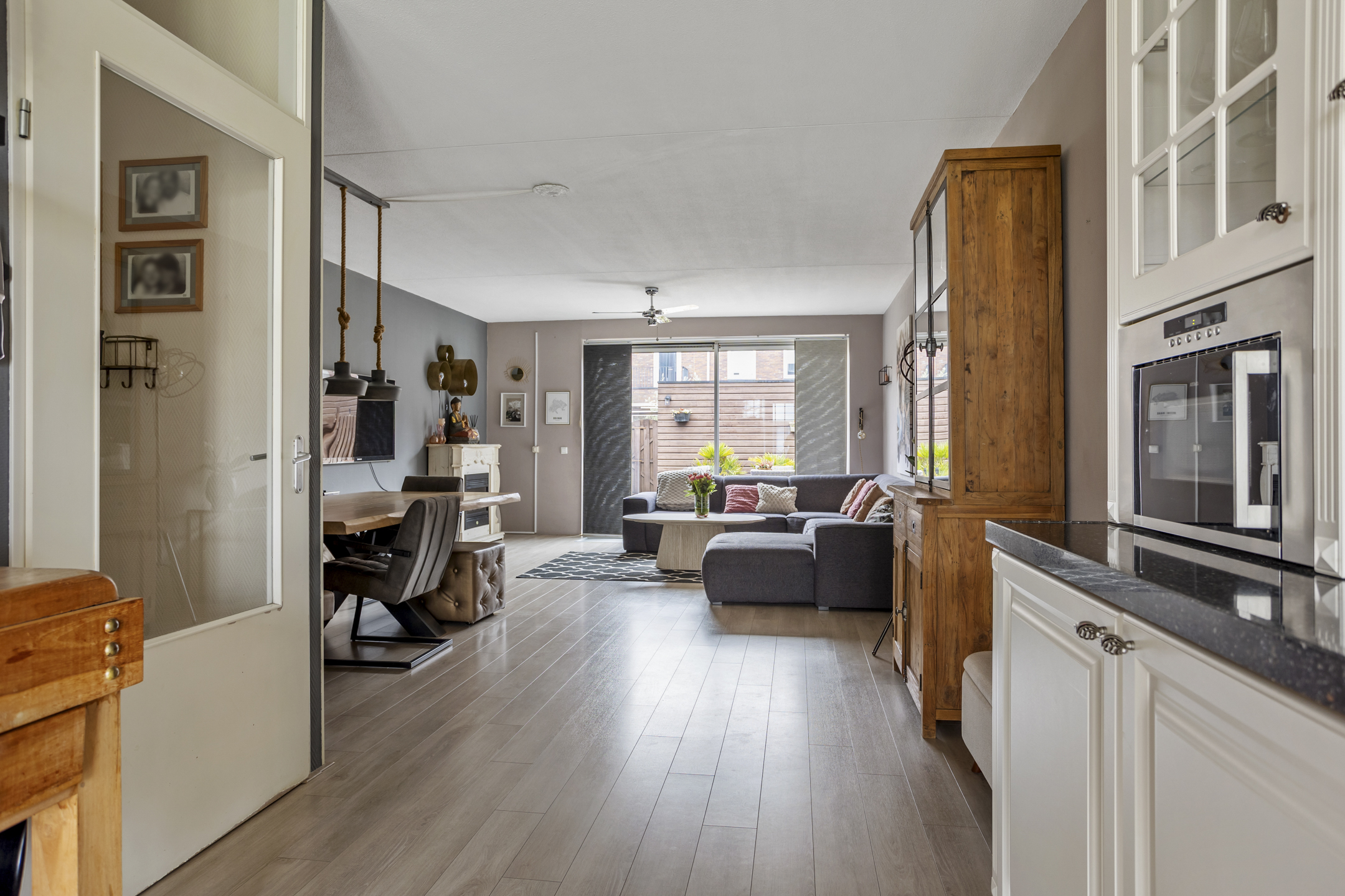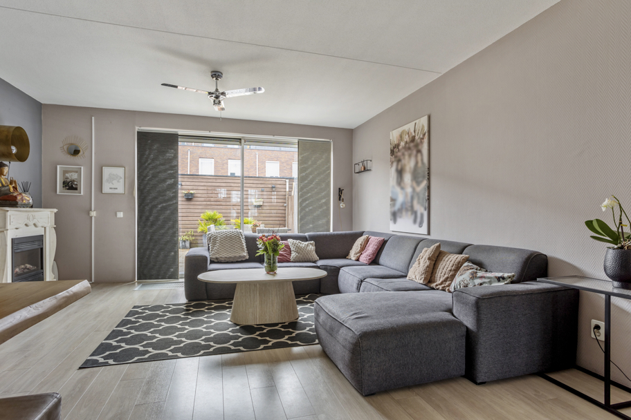 De royale, lichte en uitgebouwde woonkamer heeft een fraaie laminaatvloer, is tuingericht en geeft vele indelingsmogelijkheden. Door middel van een brede schuifpui heeft u toegang tot de zonnige, op het ZuidOosten gelegen achtertuin met achter-entree en een vergrote berging. Ideaal om uw fietsen te stallen en overige spullen op te slaan.