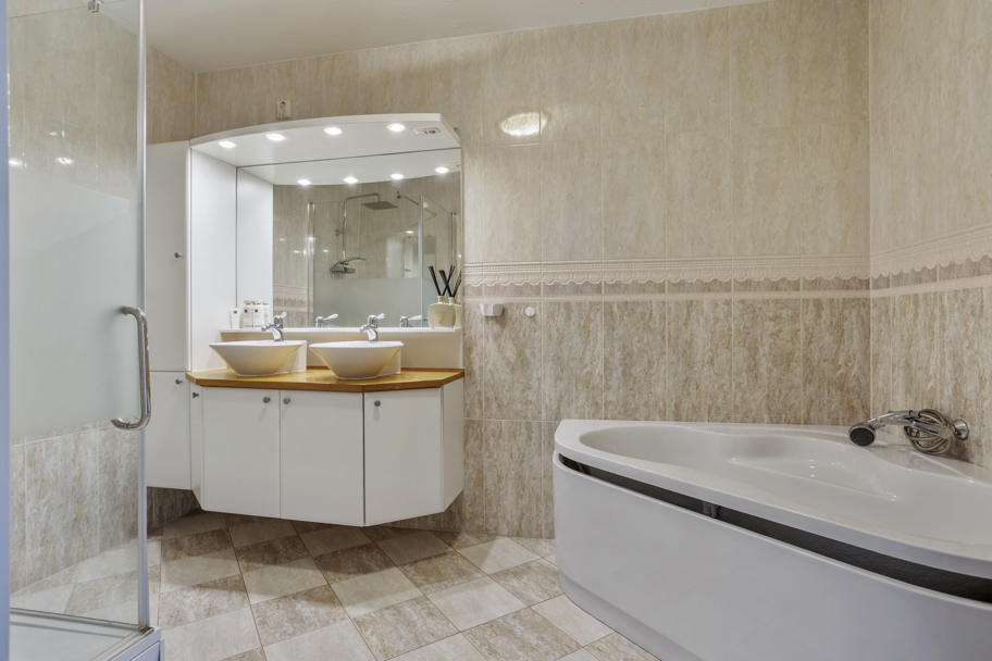 Ruime overloop met separaat toilet, voorslaapkamer over de gehele breedte van de woning met grote raampartijen tot aan de grond en 2e slaapkamer aan de achterzijde, tevens over de gehele breedte. De tussengelegen royale badkamer is geheel betegeld, heeft een douchecabine, een badkamermeubel met dubbele wastafel en een hoekbad.