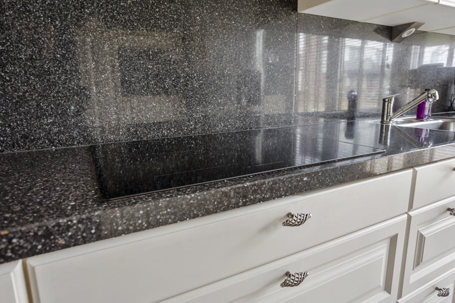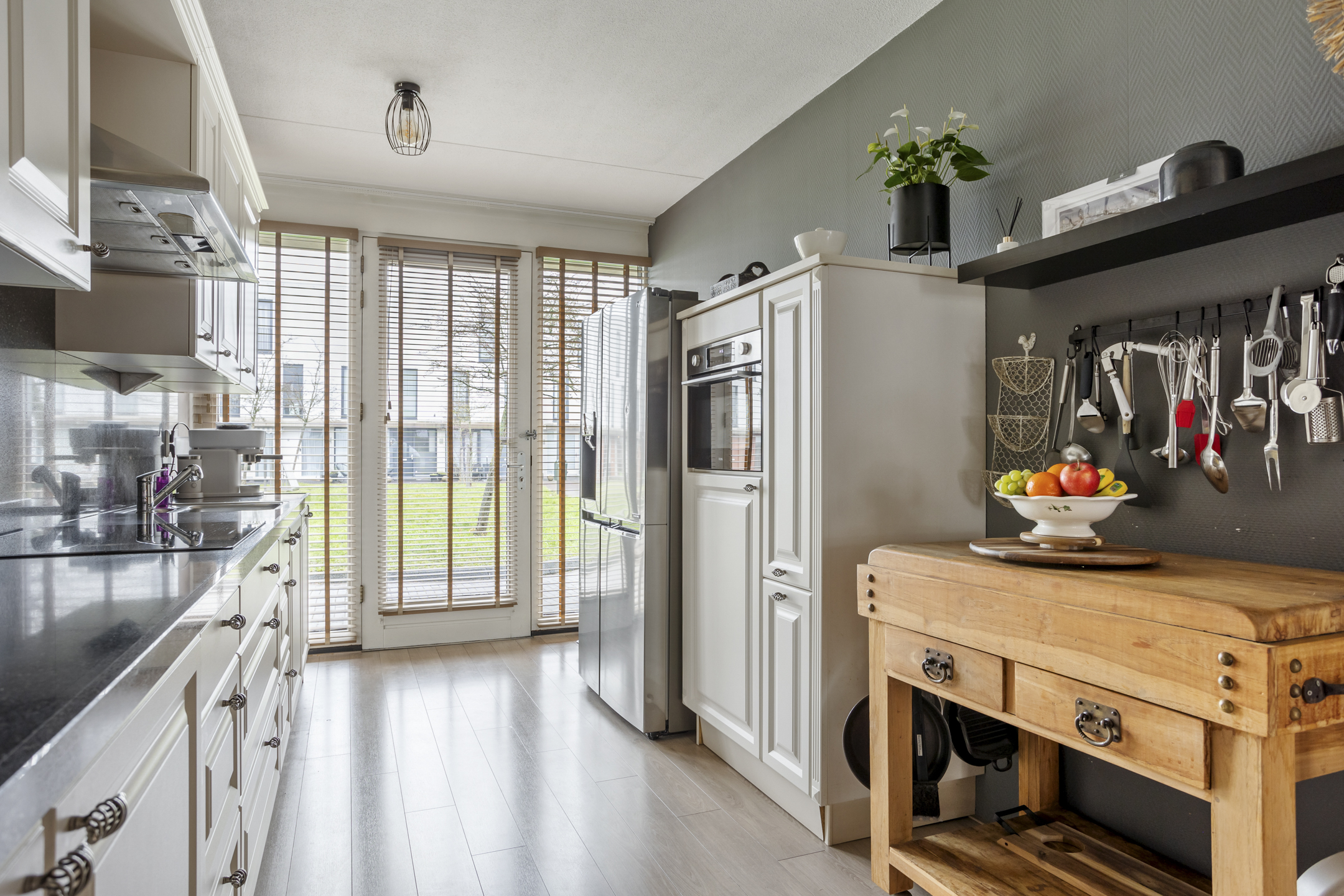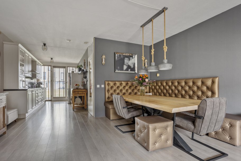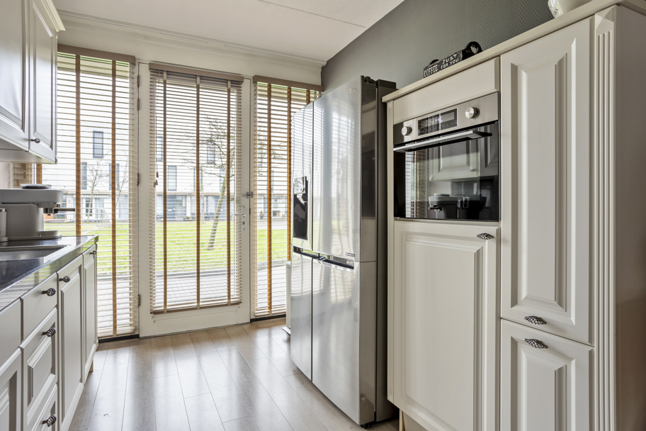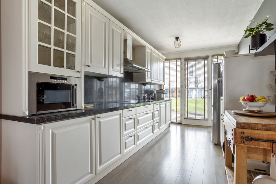 Aan de voorzijde bevindt zich de ruime en verzorgde keuken met grote raampartijen en deur naar de binnentuin. De complete keuken is aan 2-zijden uitgevoerd, heeft veel kast/bergruimte, een natuurstenen aanrechtblad en diverse inbouwapparatuur zoals inductiekookplaat, afzuigkap, magnetron, vaatwasser, en een combi-oven/magnetron.