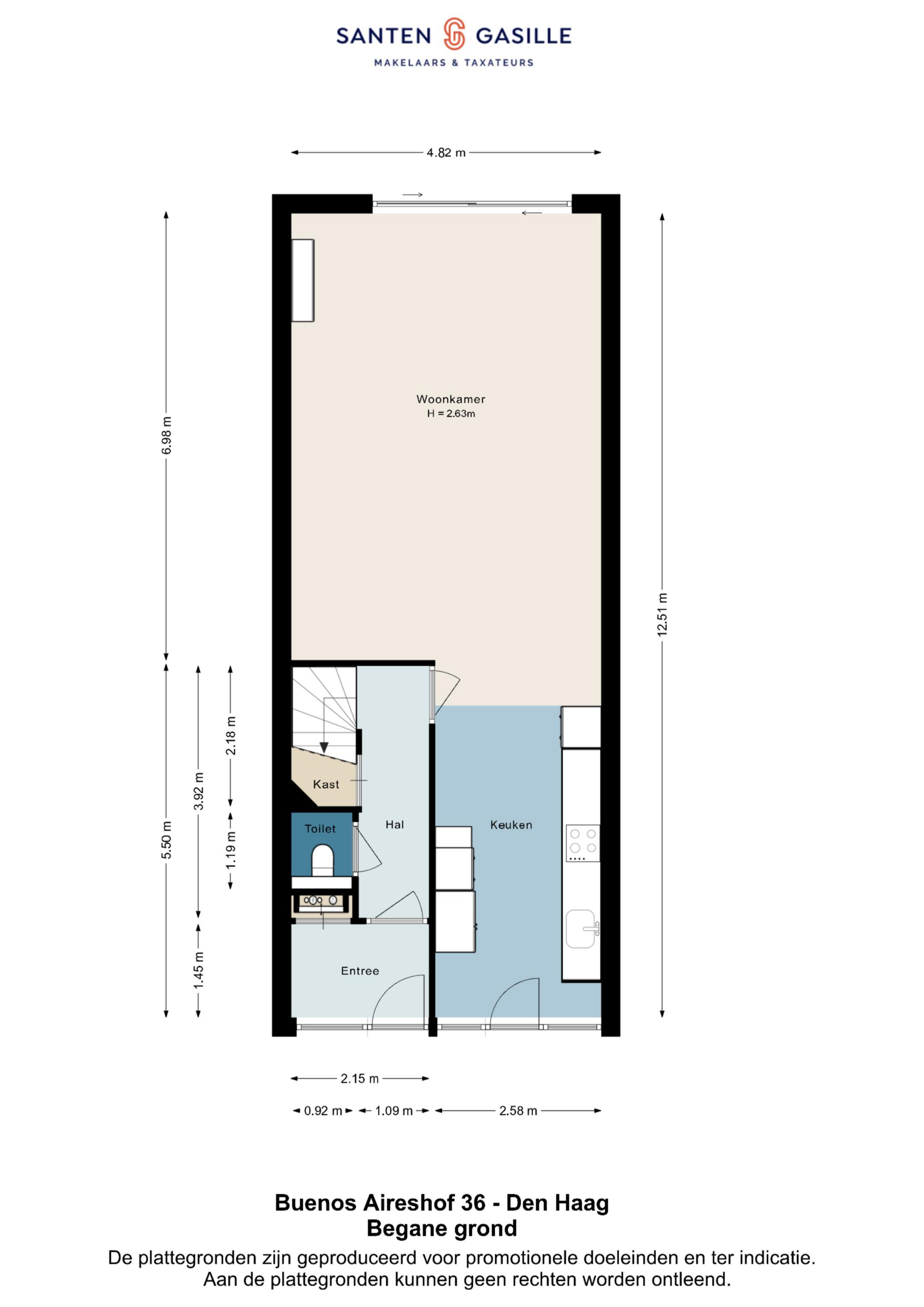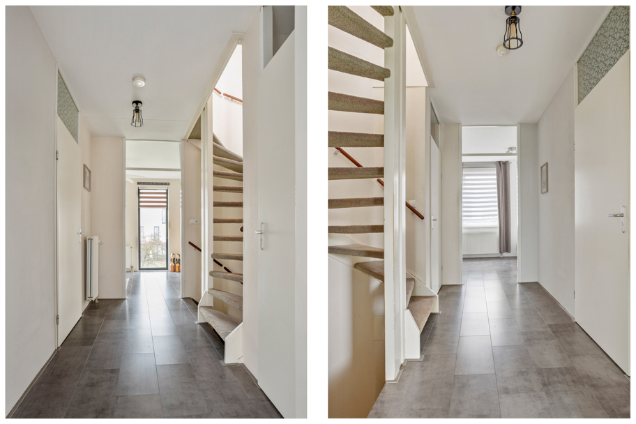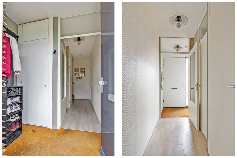 Entree, voorportaal met meterkast en toegang tot de hal. In de hal bevindt zich het moderne toilet met zwevend closet (deels vernieuwd in januari 2026), praktische trapkast, trap naar de verdieping en toegang tot de uitgebouwde woonkamer met aan de voorzijde de complete keuken.