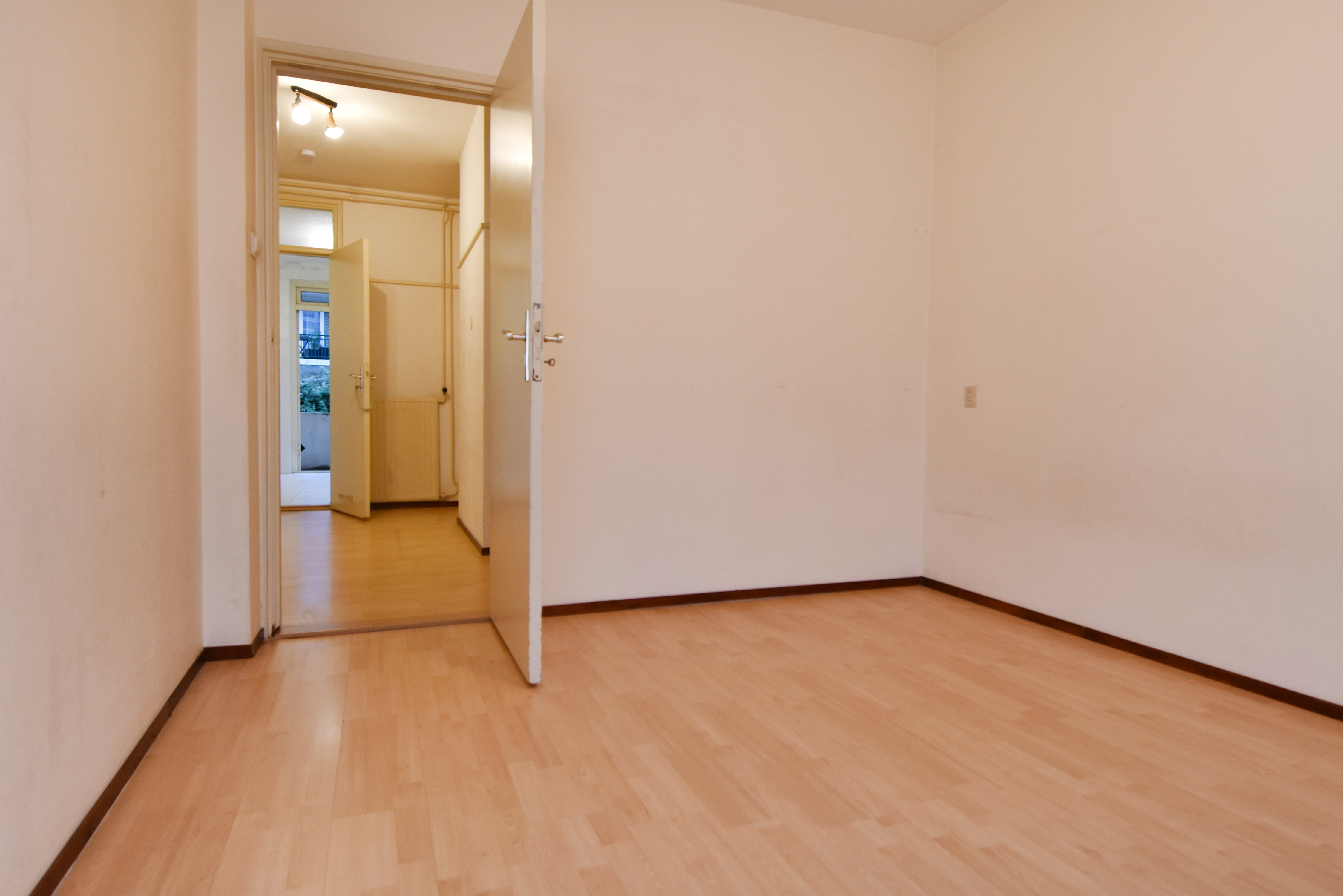 Achter de keuken ligt tevens een ruime (slaap)kamer met een vaste kast en openslaande deuren naar het balkon.