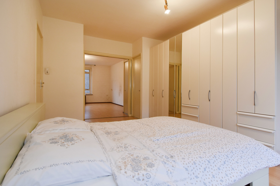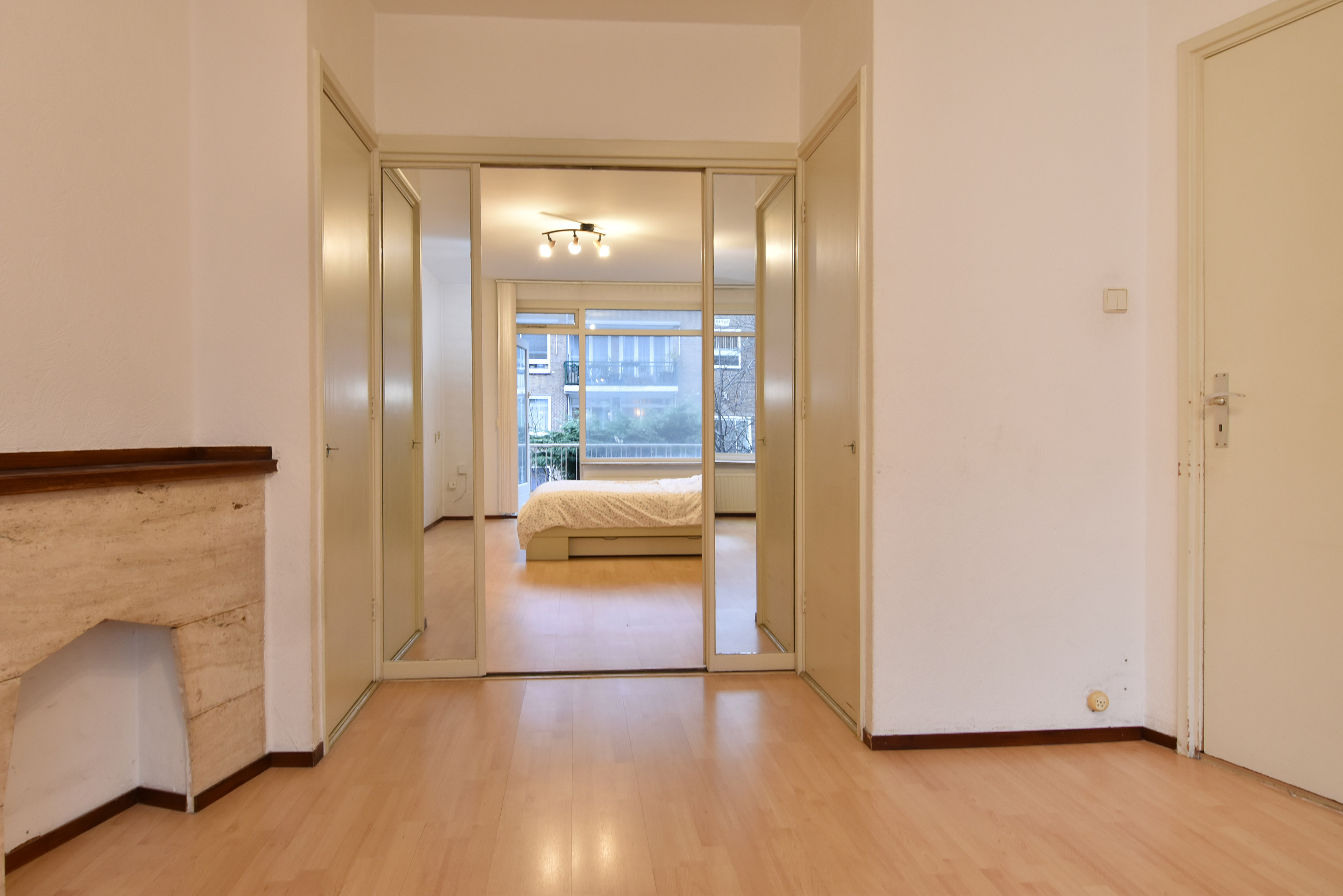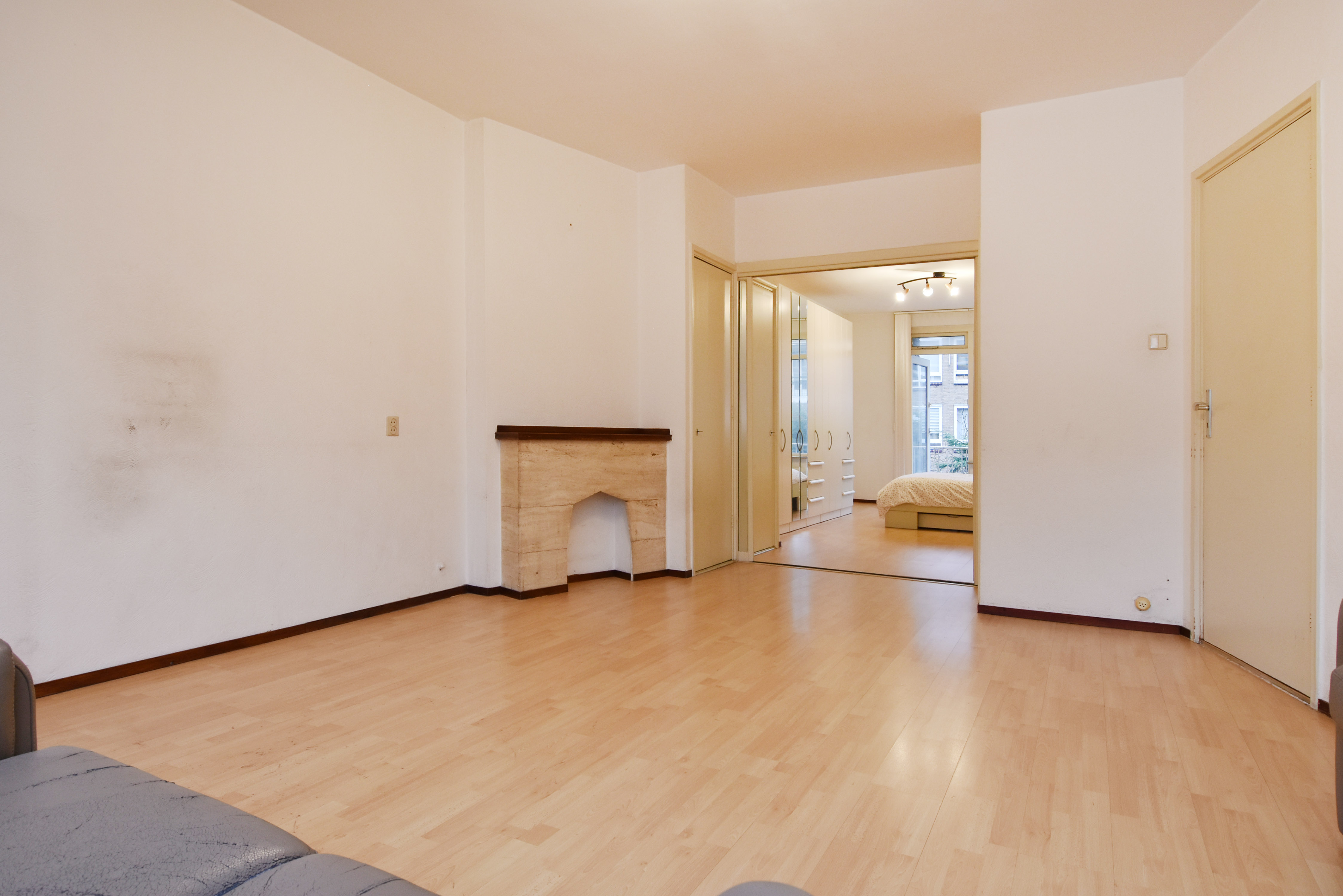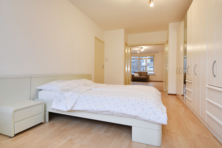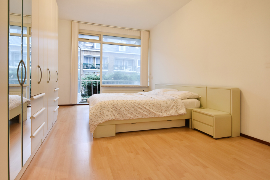 De woonkamer en suite heeft grote raampartijen aan de voorzijde en heeft vaste kasten met een separatie naar de ruime achterkamer. Deze achterkamer is nu in gebruik als slaapkamer, maar kunt u uiteraard ook gebruiken als eetkamer of werkkamer. Deze kamer is ook bereikbaar vanuit de hal en heeft toegang tot het brede balkon.
