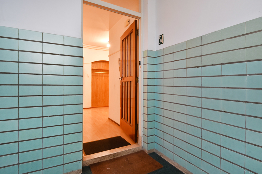 Street-level entrance with a secure, well-maintained porch featuring a doorbell panel and staircase. A short staircase leads down to the bicycle storage area and the stairs to the upper floors.