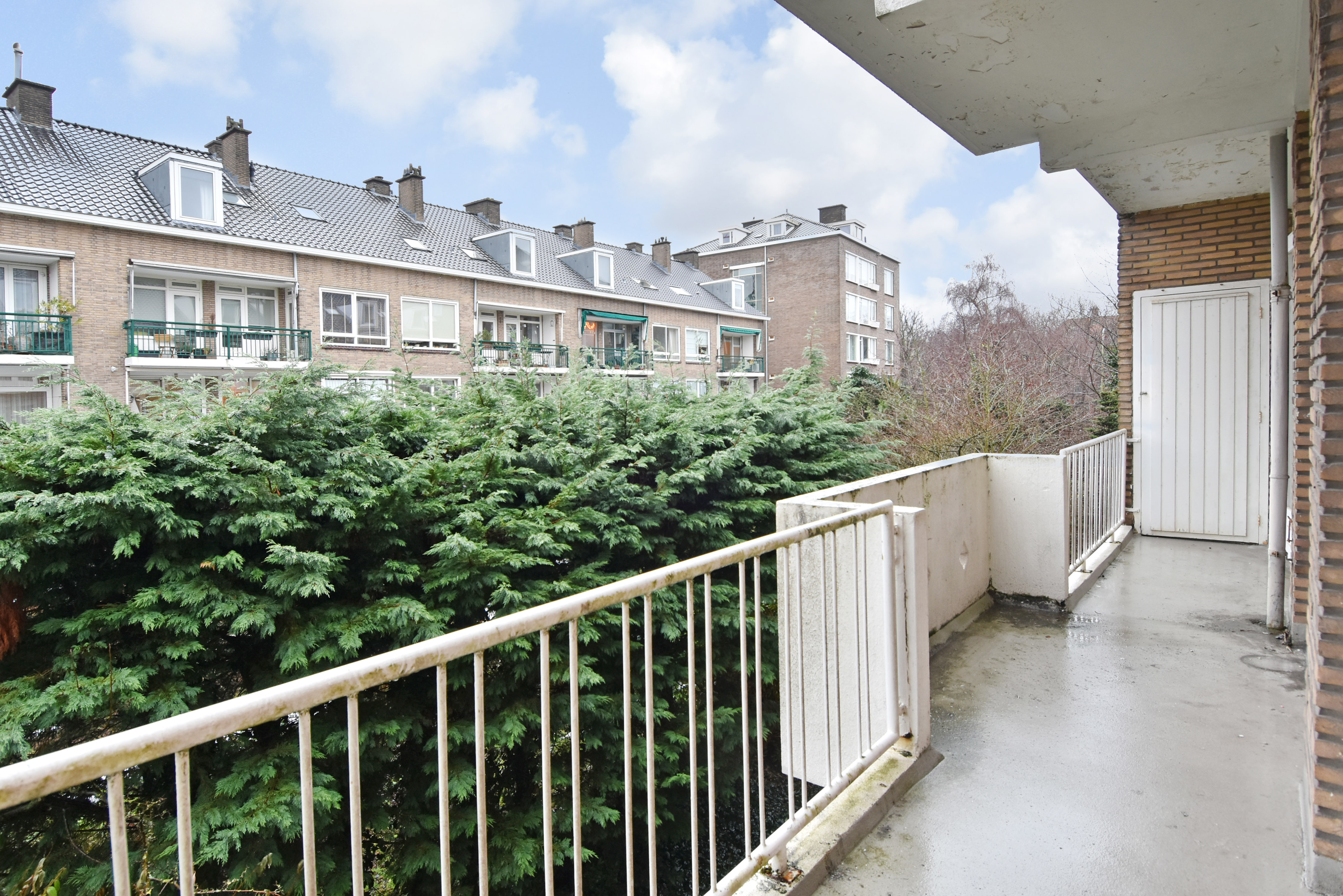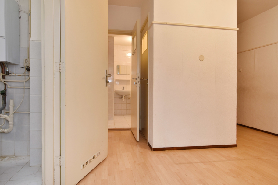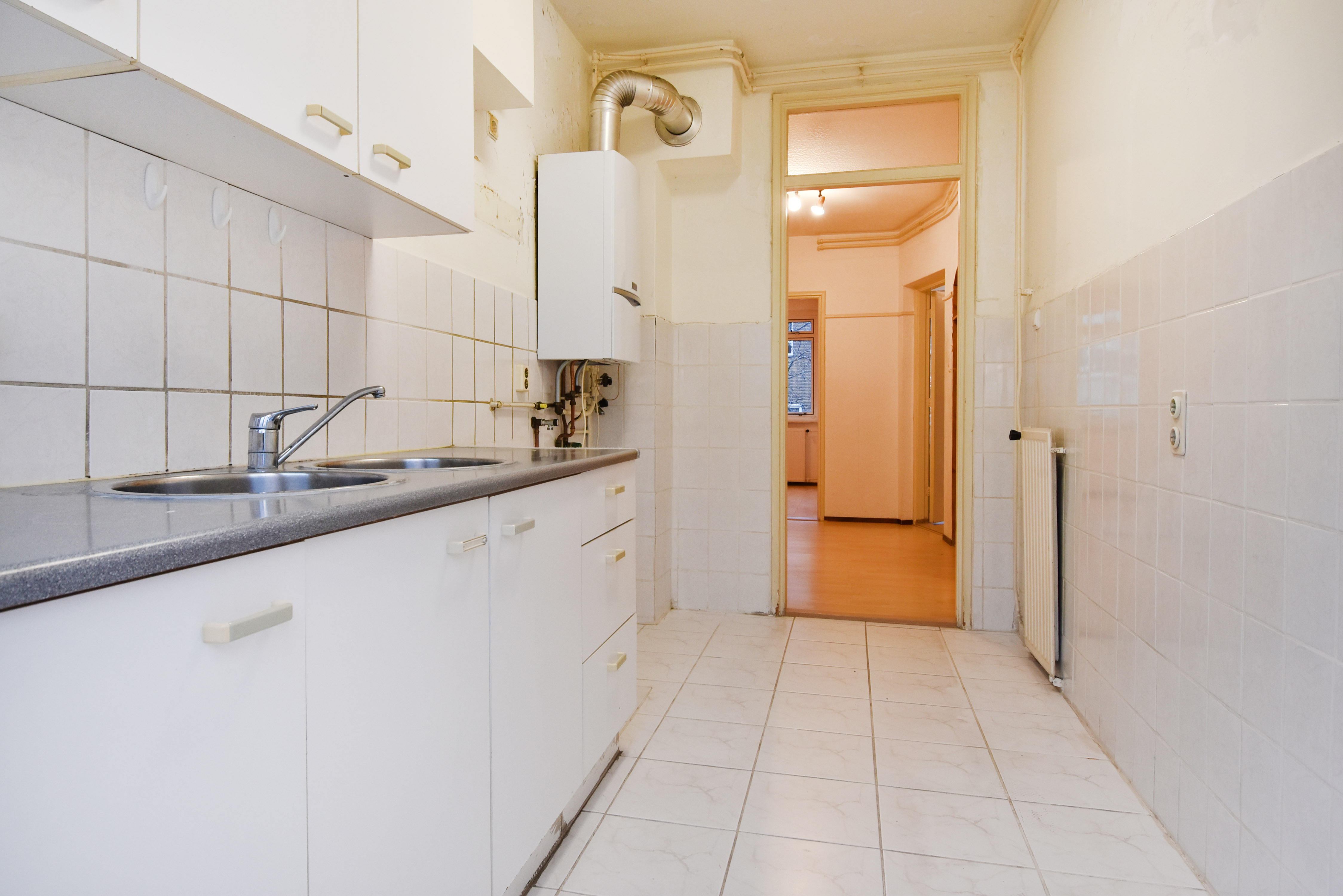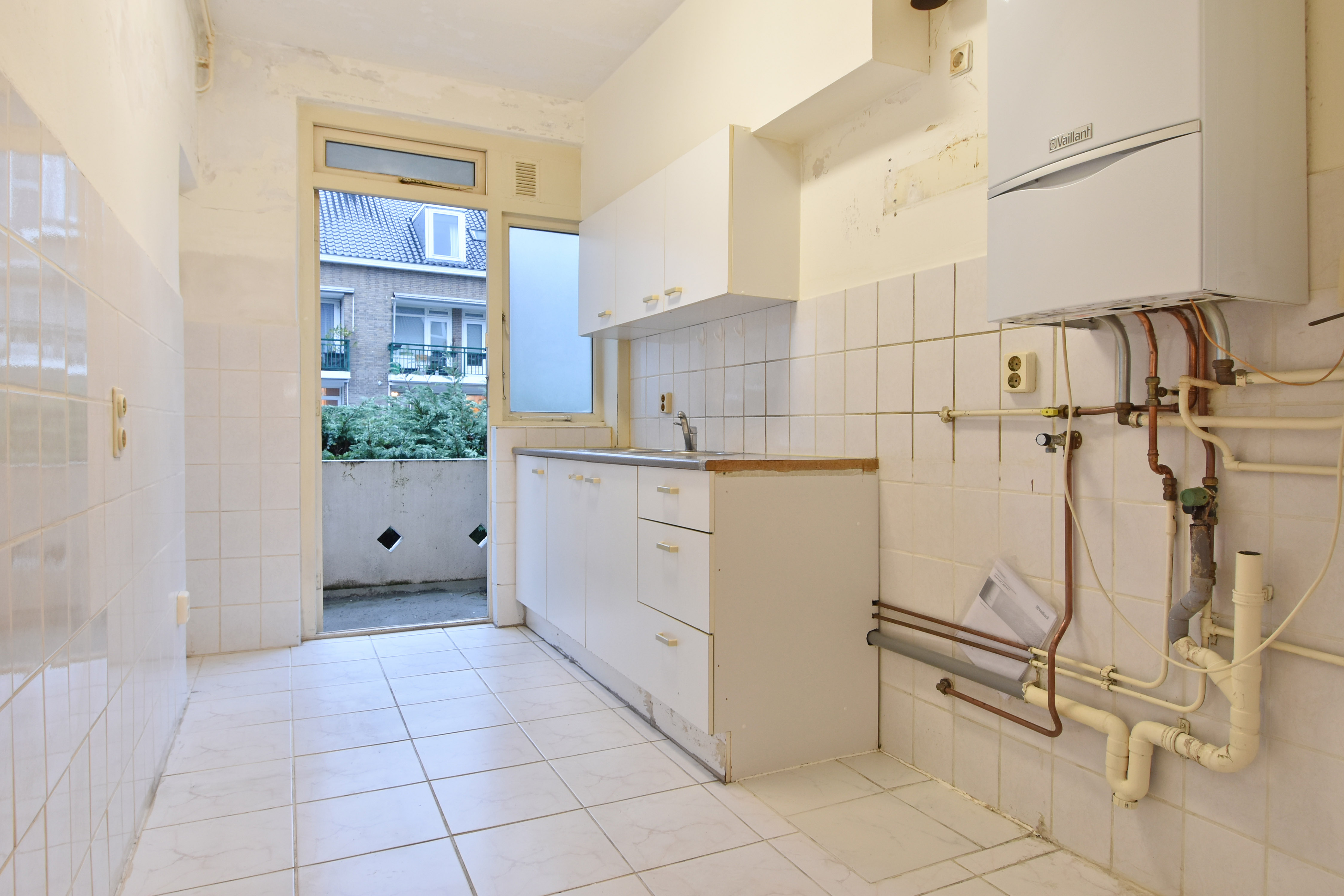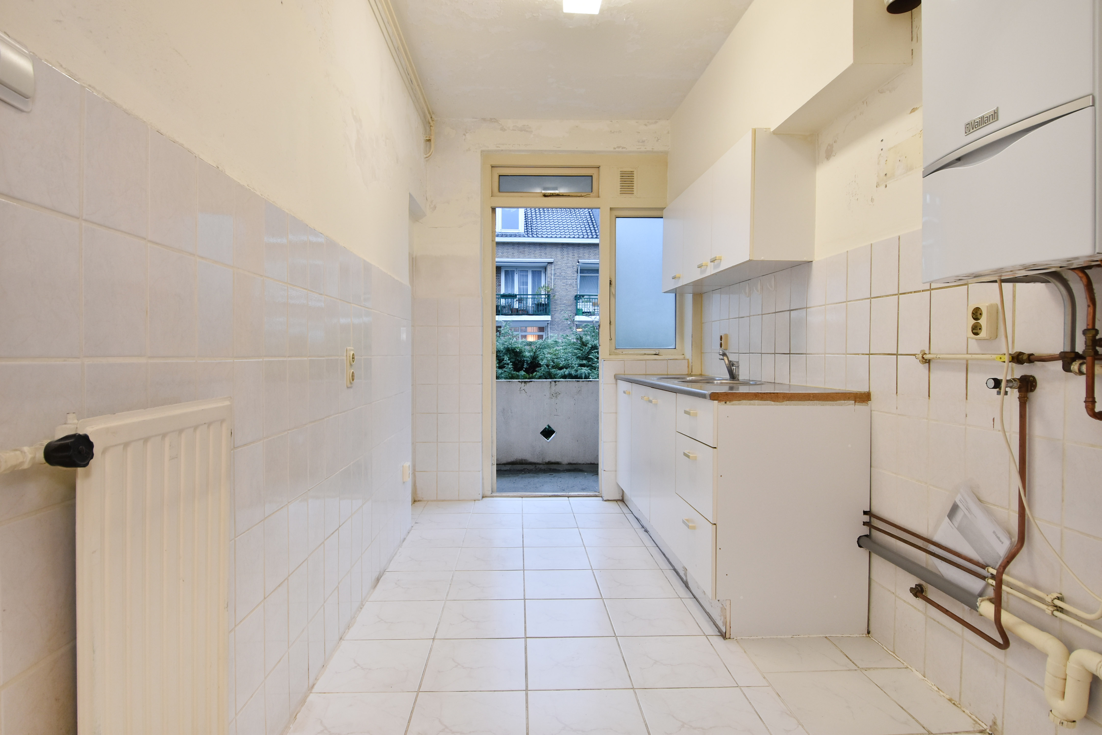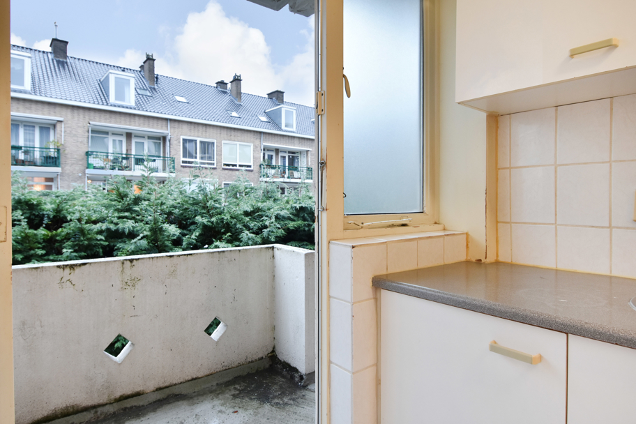 De gesloten keuken is eenvoudig en heeft aansluitingen voor de CV ketel en wasmachine. Ook via de keuken bereikt u het balkon over de gehele breedte met balkonkasten.