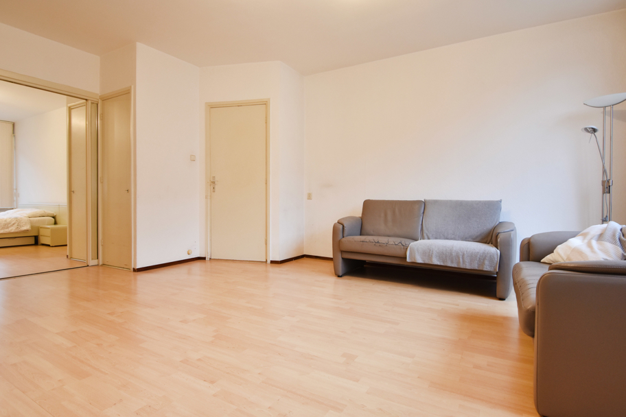 Behind the kitchen is a spacious (bed)room with a built-in wardrobe and French doors leading to the balcony.