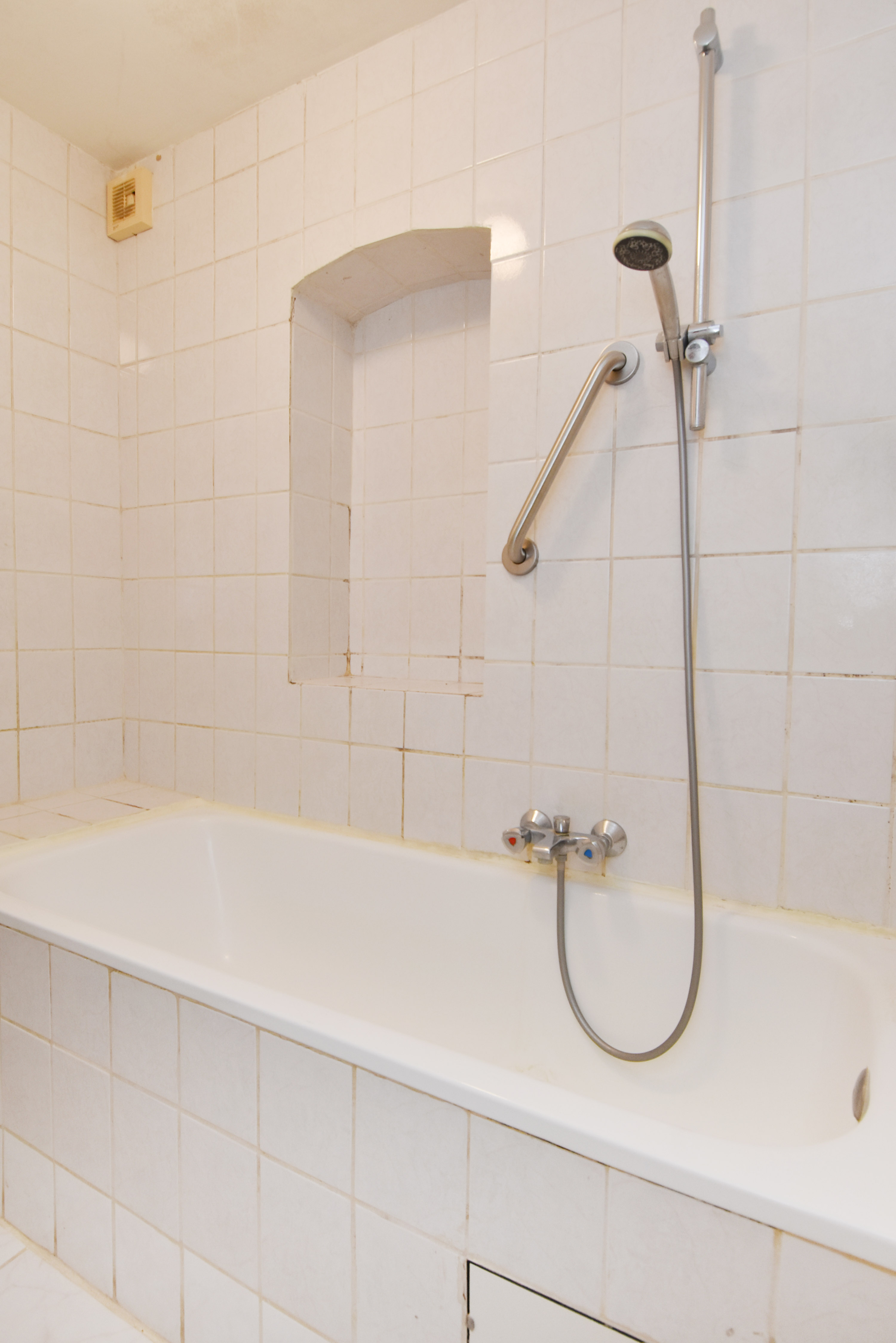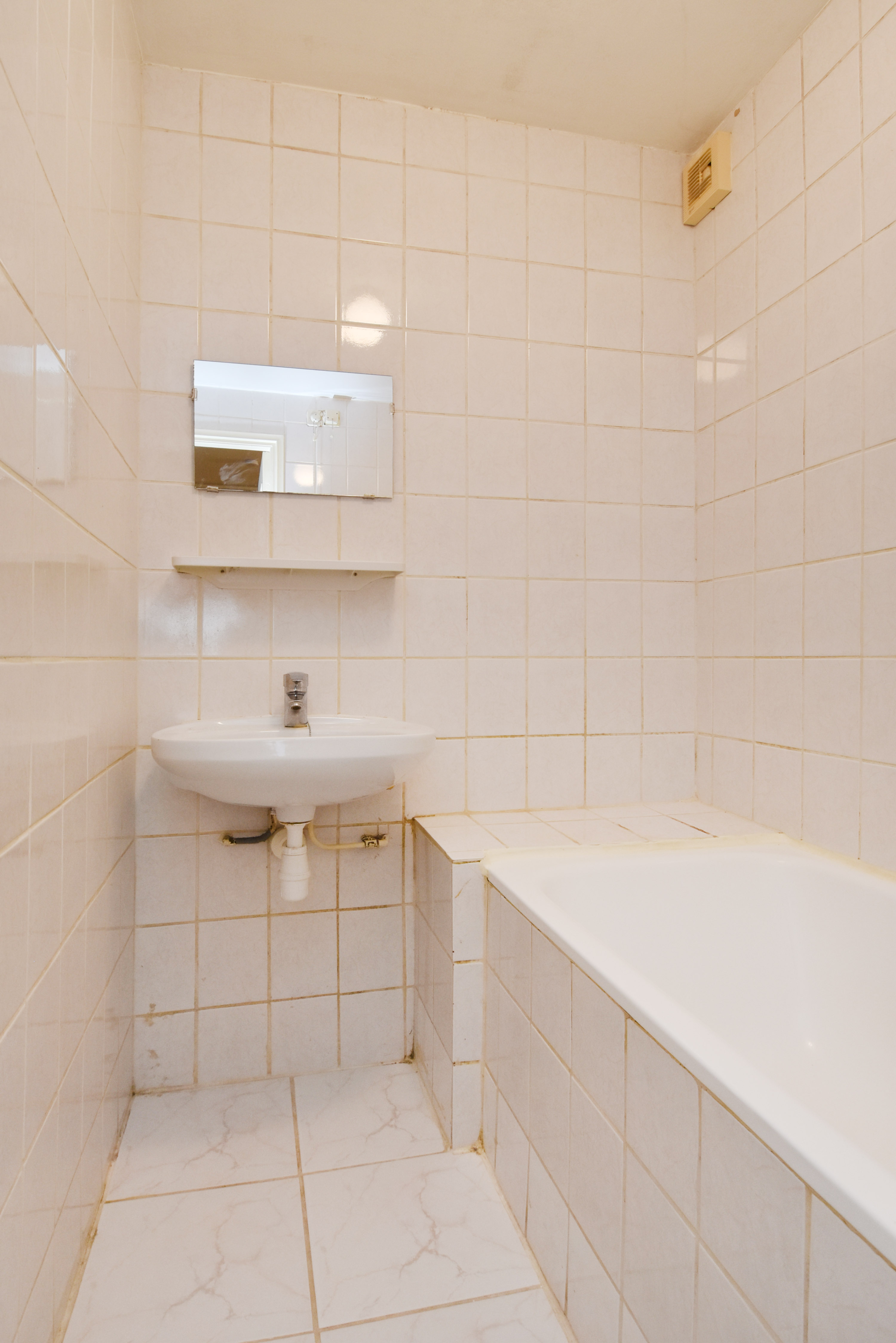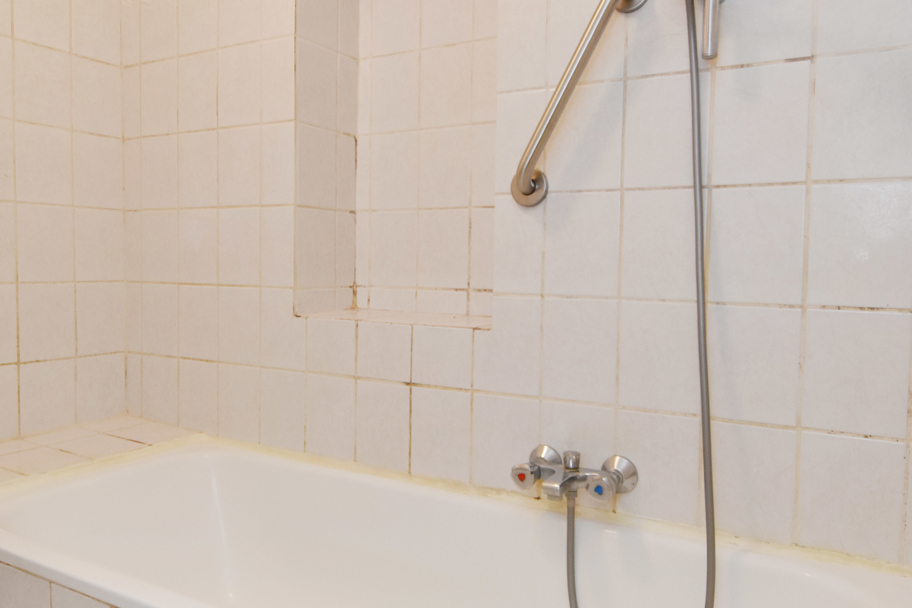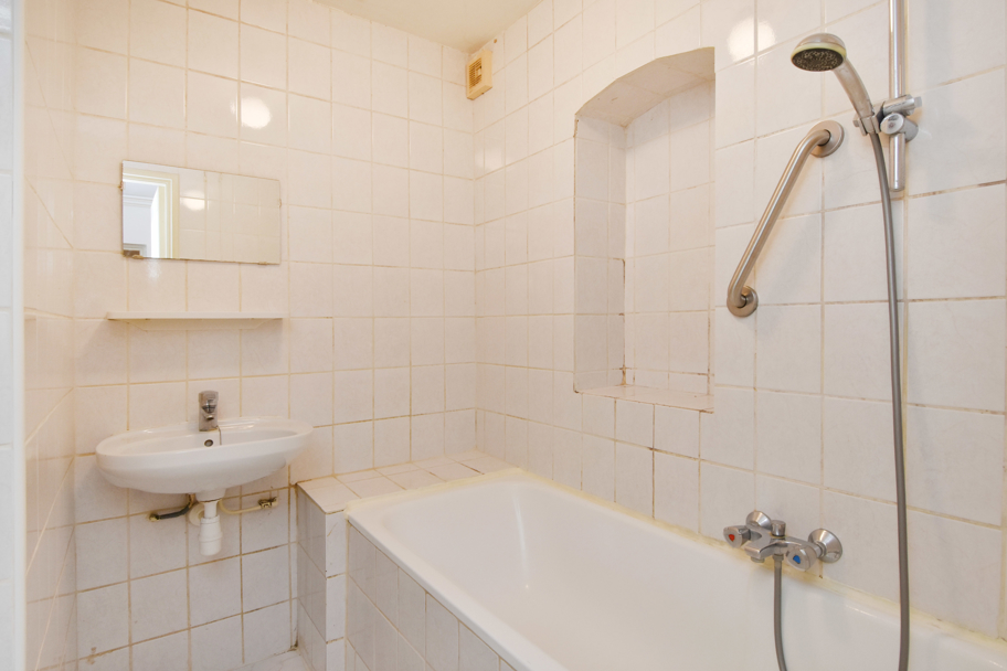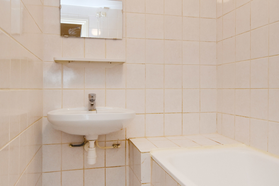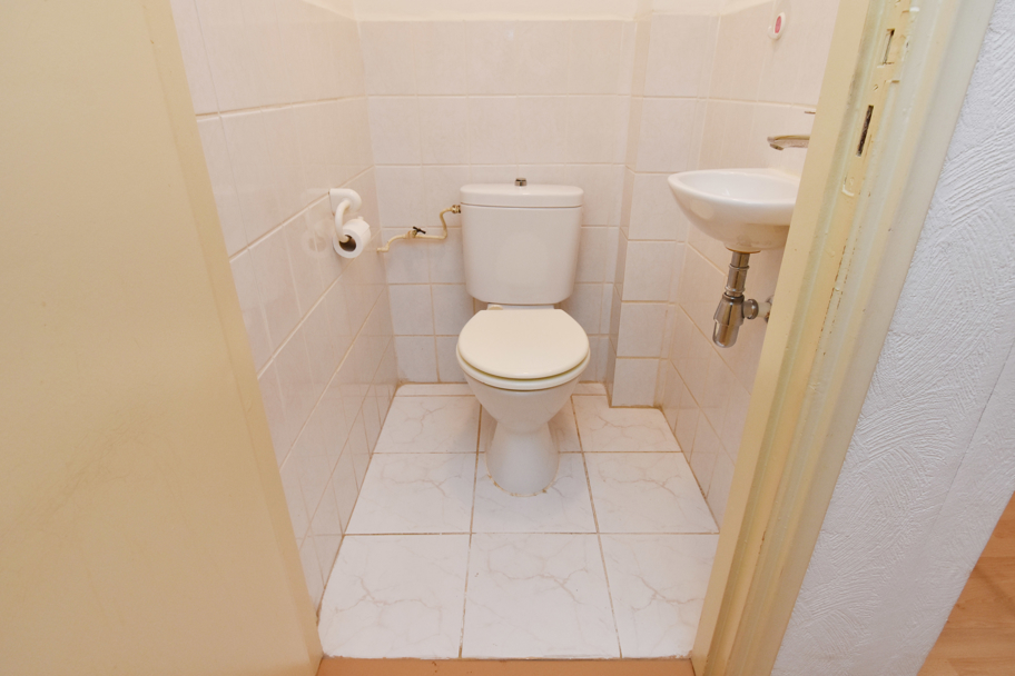 Het toilet en de tussengelegen badkamer zijn tevens eenvoudig en in witte kleurstelling. De badkamer is voorzien van een vaste wastafel en een ligbad.
