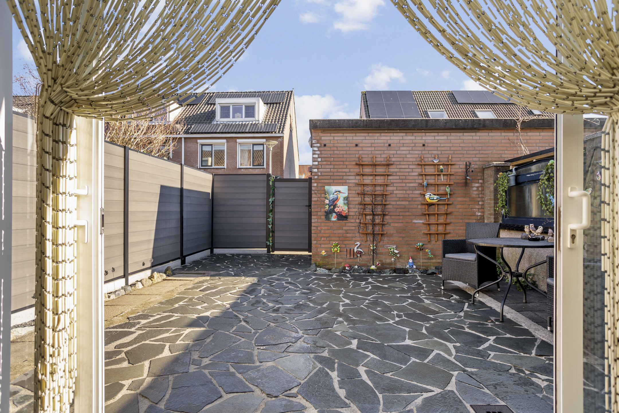 * Achtertuin met stenen berging en een achterom