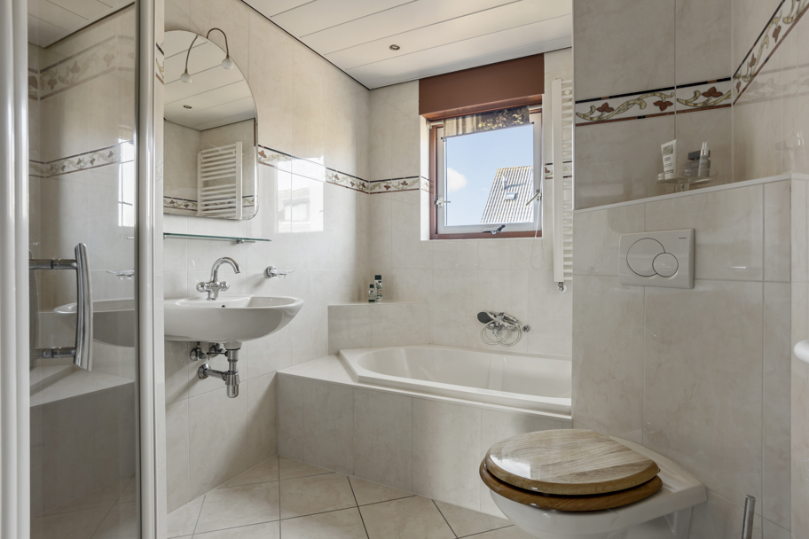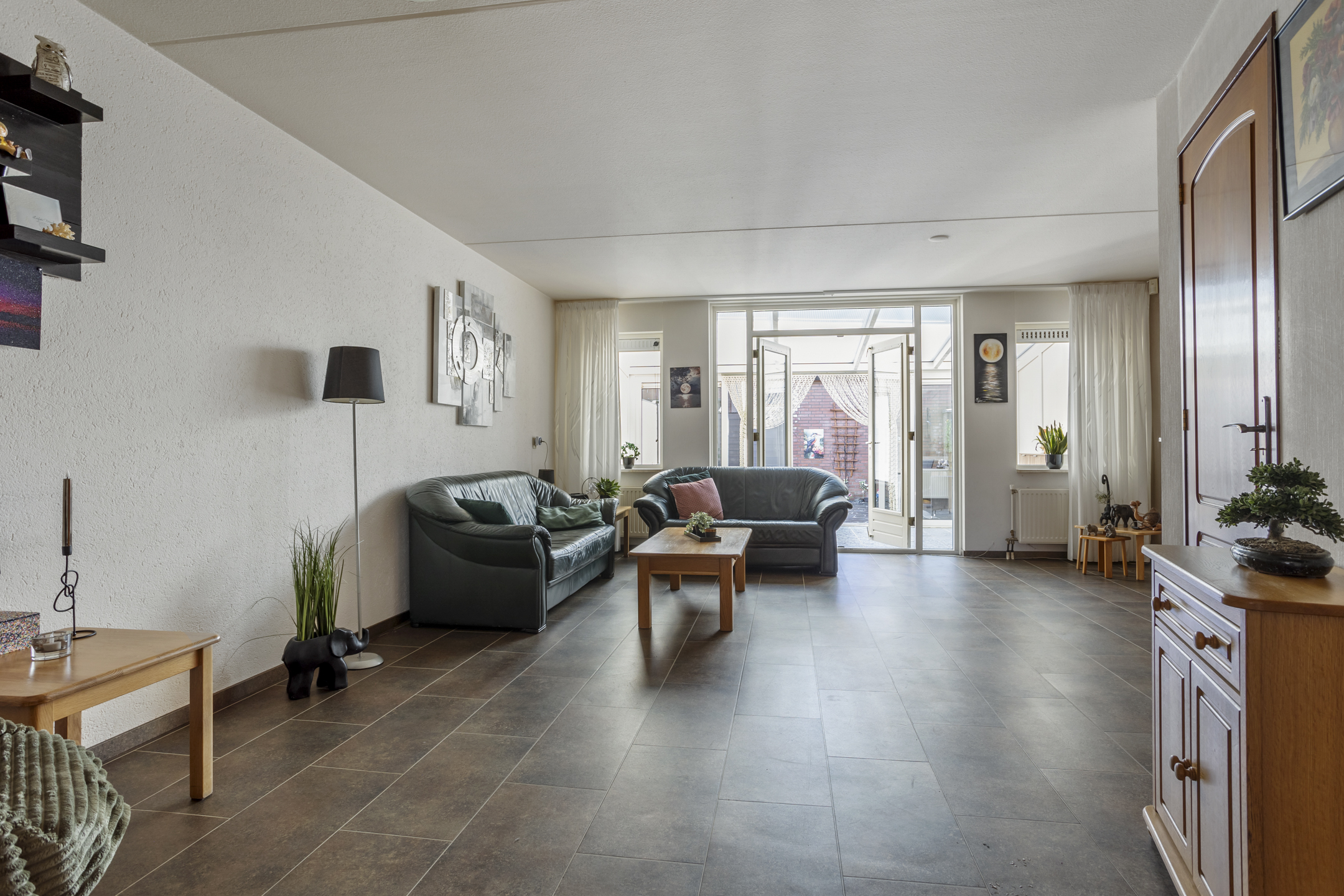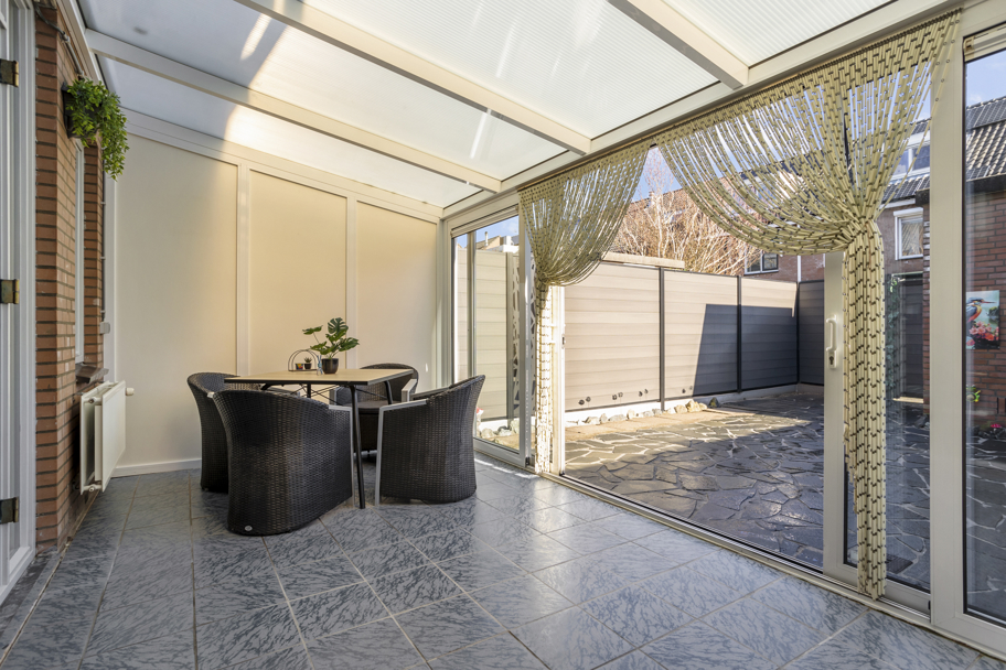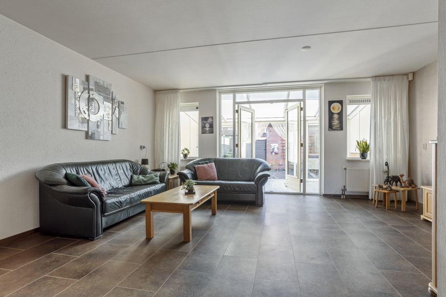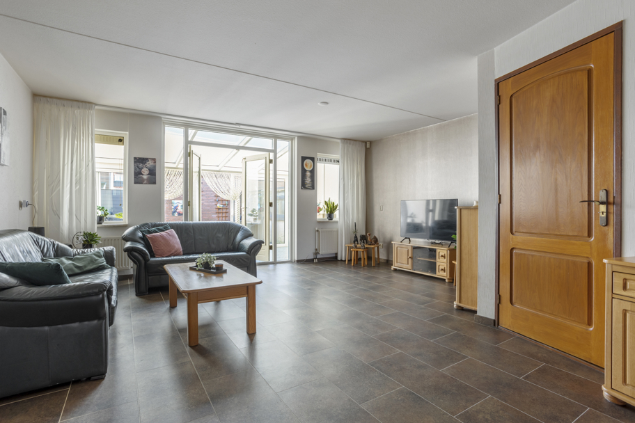 De woonkamer is ruim opgezet en beschikt over een zeer royale provisiekast, ideaal voor extra voorraad en bergruimte. Middels openslaande deuren bereikt u de aangebouwde serre, die zorgt voor een heerlijke verlenging van de leefruimte en een mooie overgang naar de zonnige achtertuin.