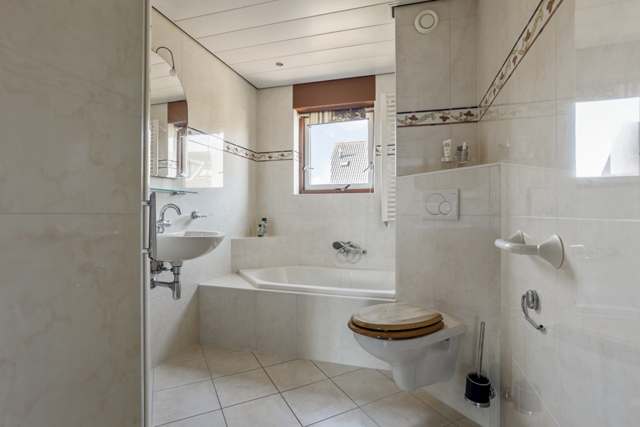 Op de eerste verdieping bevinden zich drie slaapkamers: twee aan de achterzijde en één aan de voorzijde van de woning. De badkamer ligt aan de voorzijde en is compleet uitgevoerd met een douche, ligbad, toilet en een designradiator.