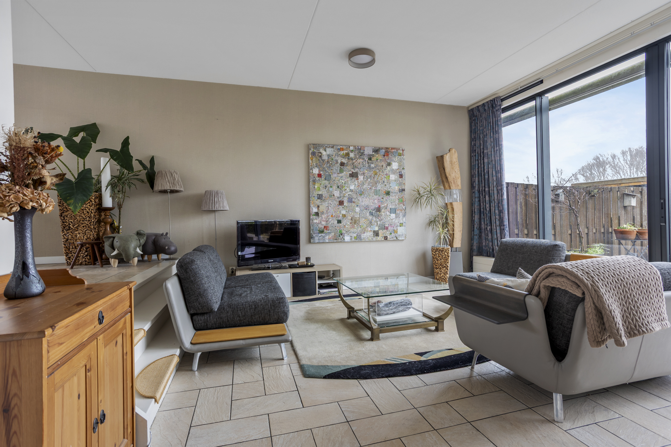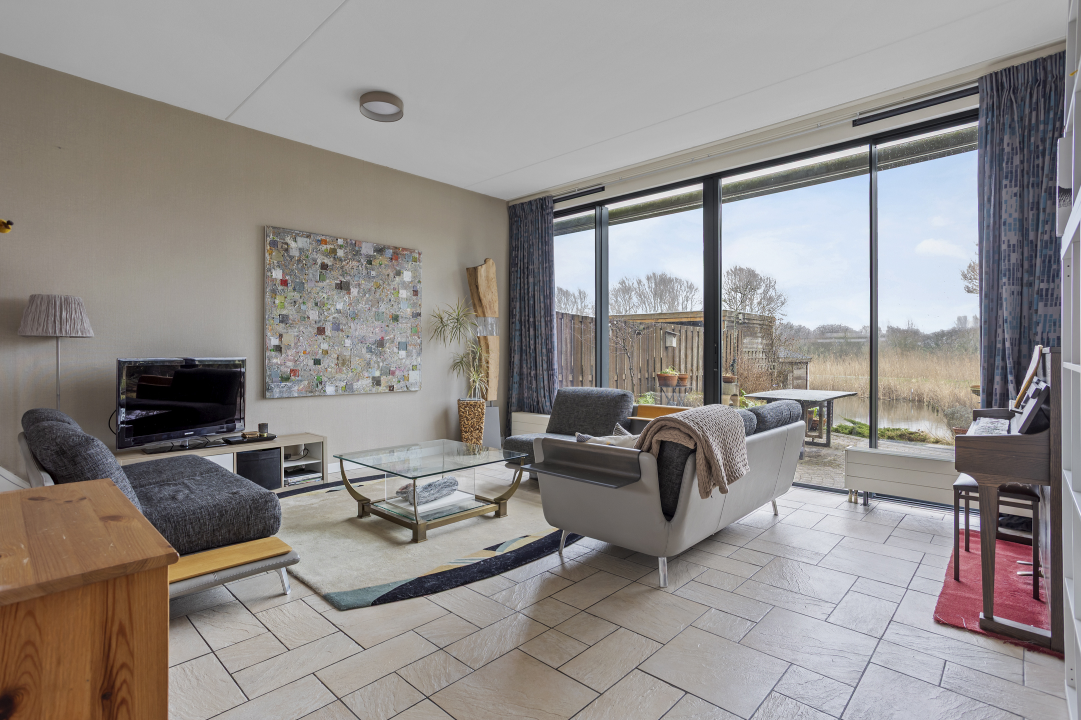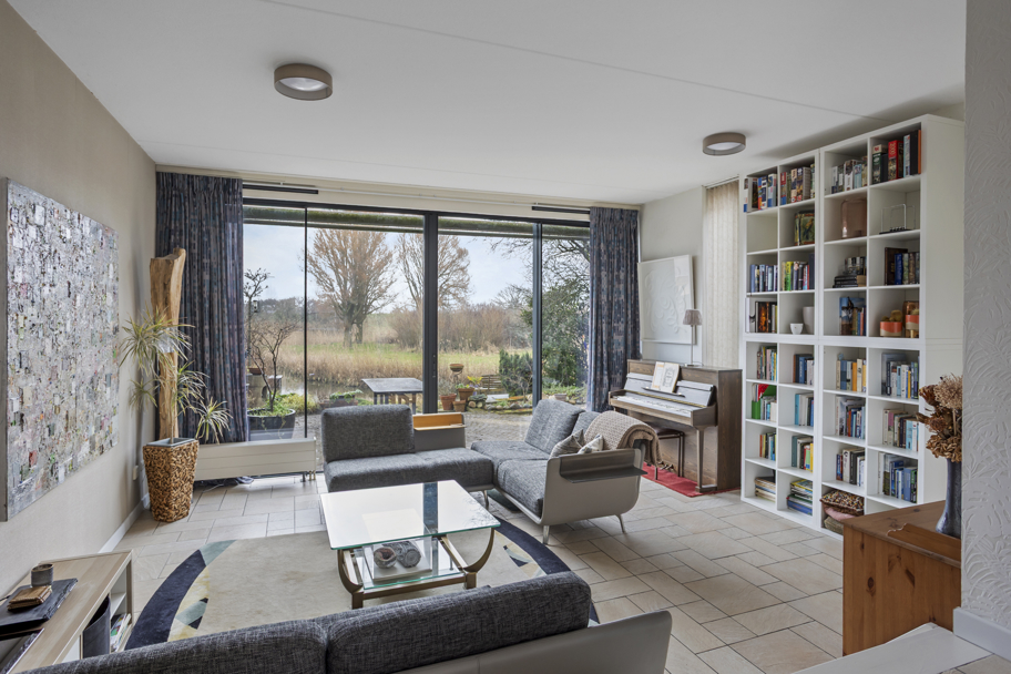 De lichte woonkamer beschikt over vloerverwarming en een groot raamkozijn, bijna over de gehele breedte, met schuifpui (vernieuwd in 2024). Deze raampartij zorgt voor een prachtige lichtinval en een vrij en groen uitzicht over de achtertuin, het water en de ecologische zone. Aan de achterzijde is volop privacy en rust.