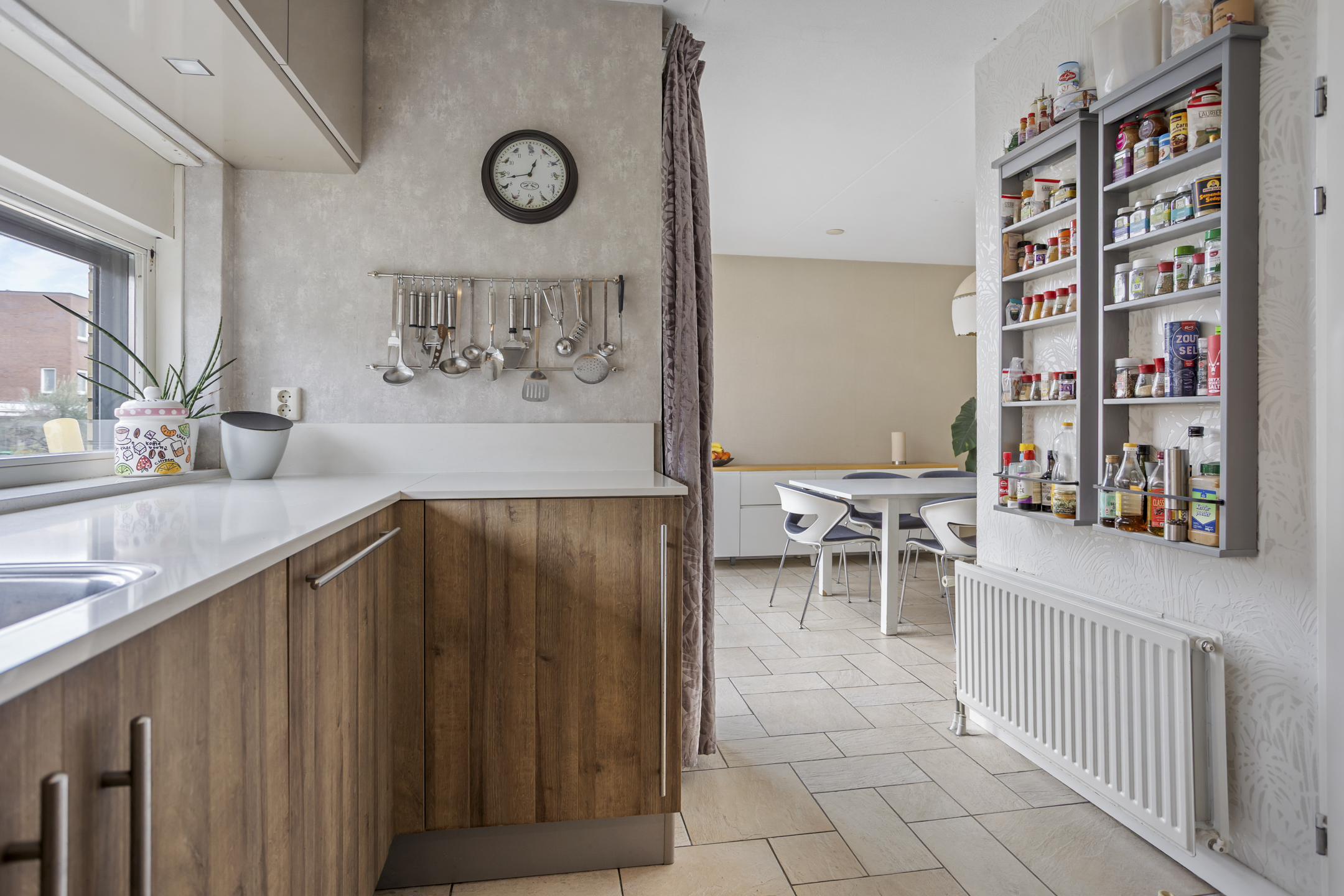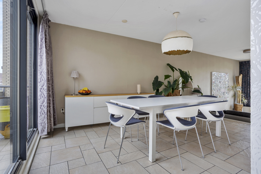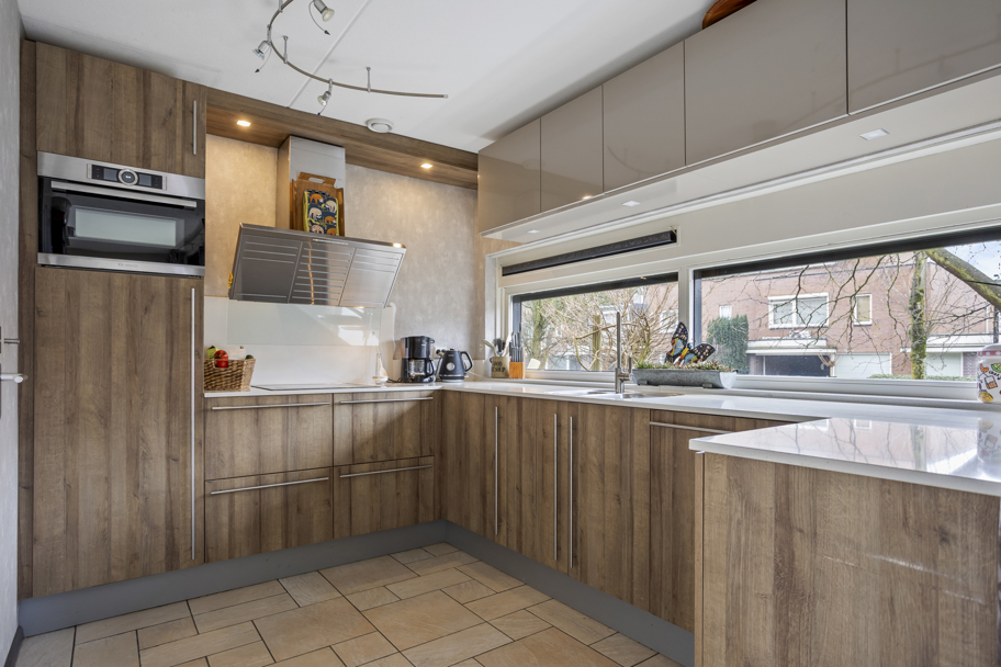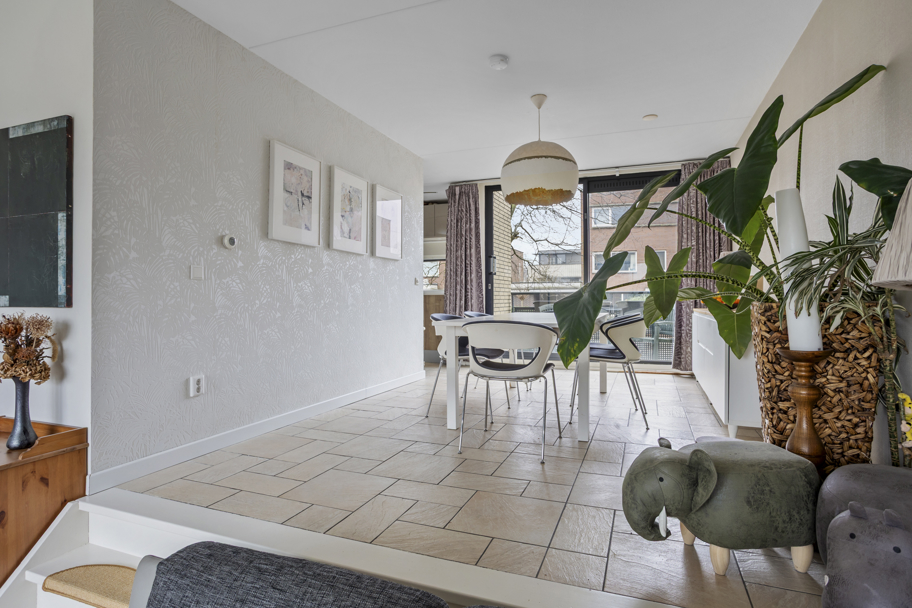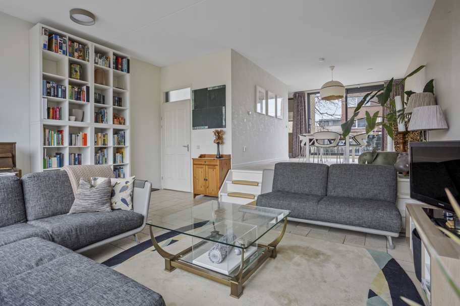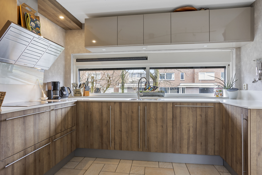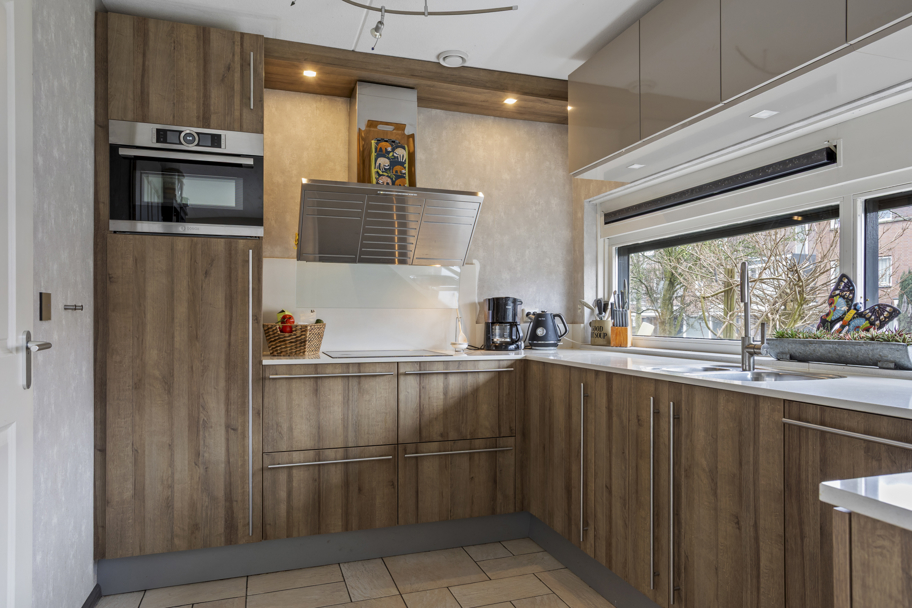 De begane grond is uitgevoerd met een speelse splitlevel-indeling. Aan de voorzijde van de woning bevindt zich de nette keuken voorzien van een keukenboiler en diverse inbouwapparatuur waaronder een 4-pits inductiekookplaat, afzuigkap, koelkast met vriesvak en vaatwasser. Daarnaast is er zonwering aan de buitenzijde aanwezig. Vanuit deze verdieping is er toegang tot een ruim balkon aan de voorzijde.