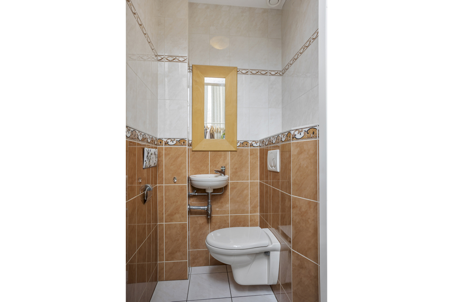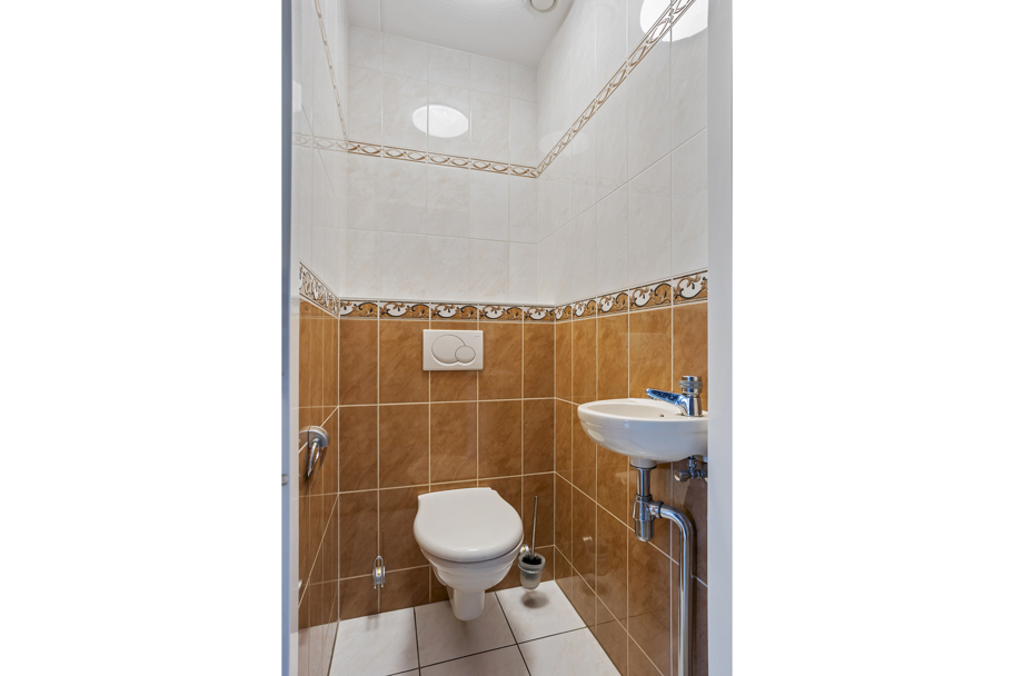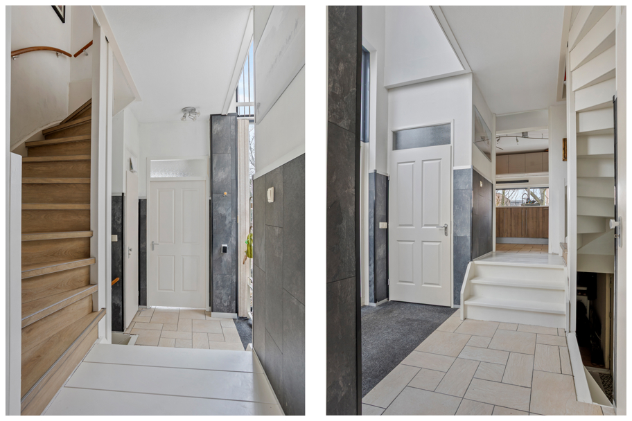 Entree via de voortuin. In de hal bevinden zich de meterkast, een toilet met fonteintje en zowel de trap naar de eerste verdieping als de trap naar de kelder. In de kelder is de zeer ruime voormalige garage gesitueerd, voorzien van elektra en verwarming. Deze garage is geschikt voor diverse gebruiksmogelijkheden zoals hobbyruimte, praktijk aan huis of berging.
