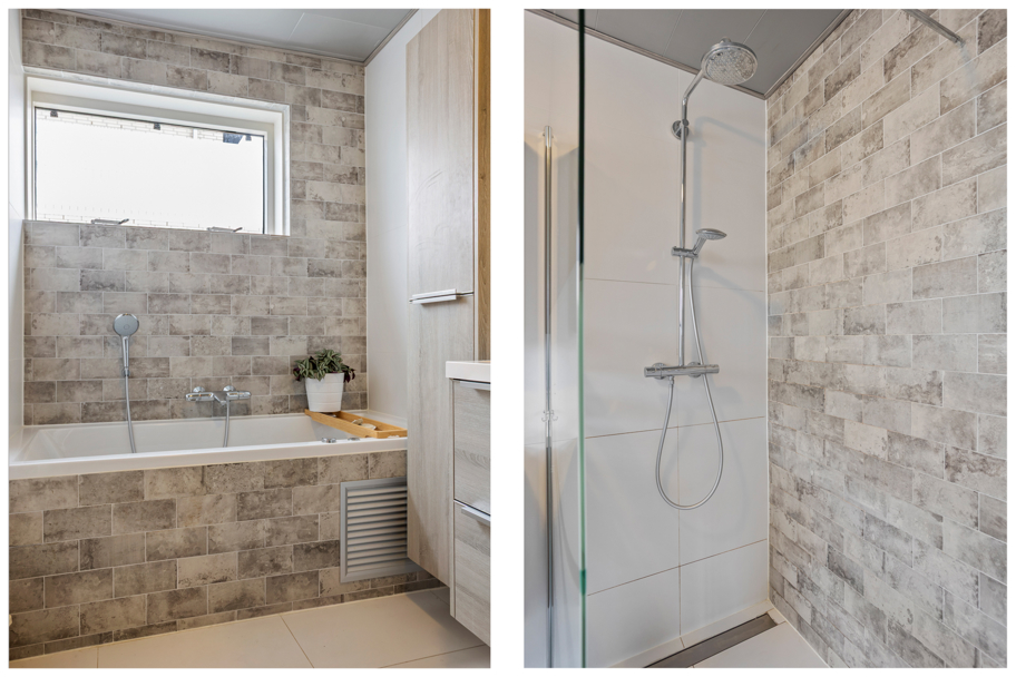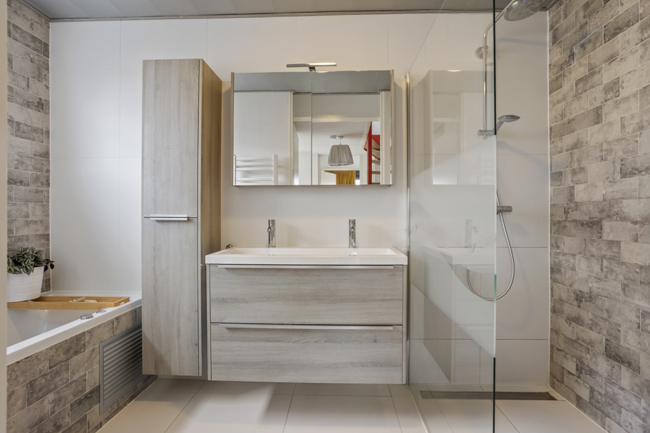 De badkamer is compleet uitgevoerd en voorzien van een ligbad met een whirlpool functie, inloopdouche, wastafelmeubel en een designradiator.