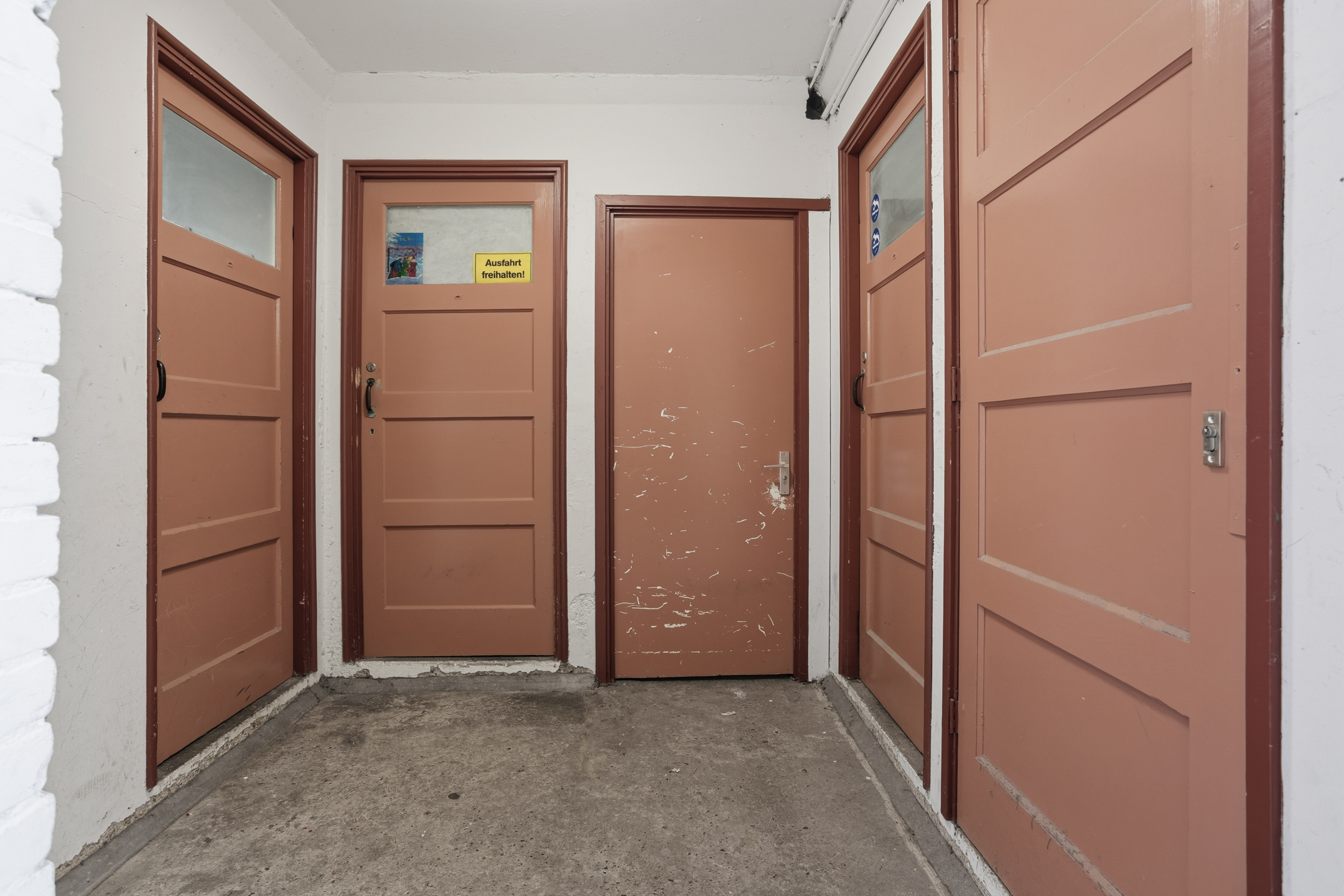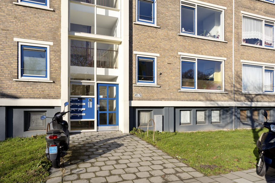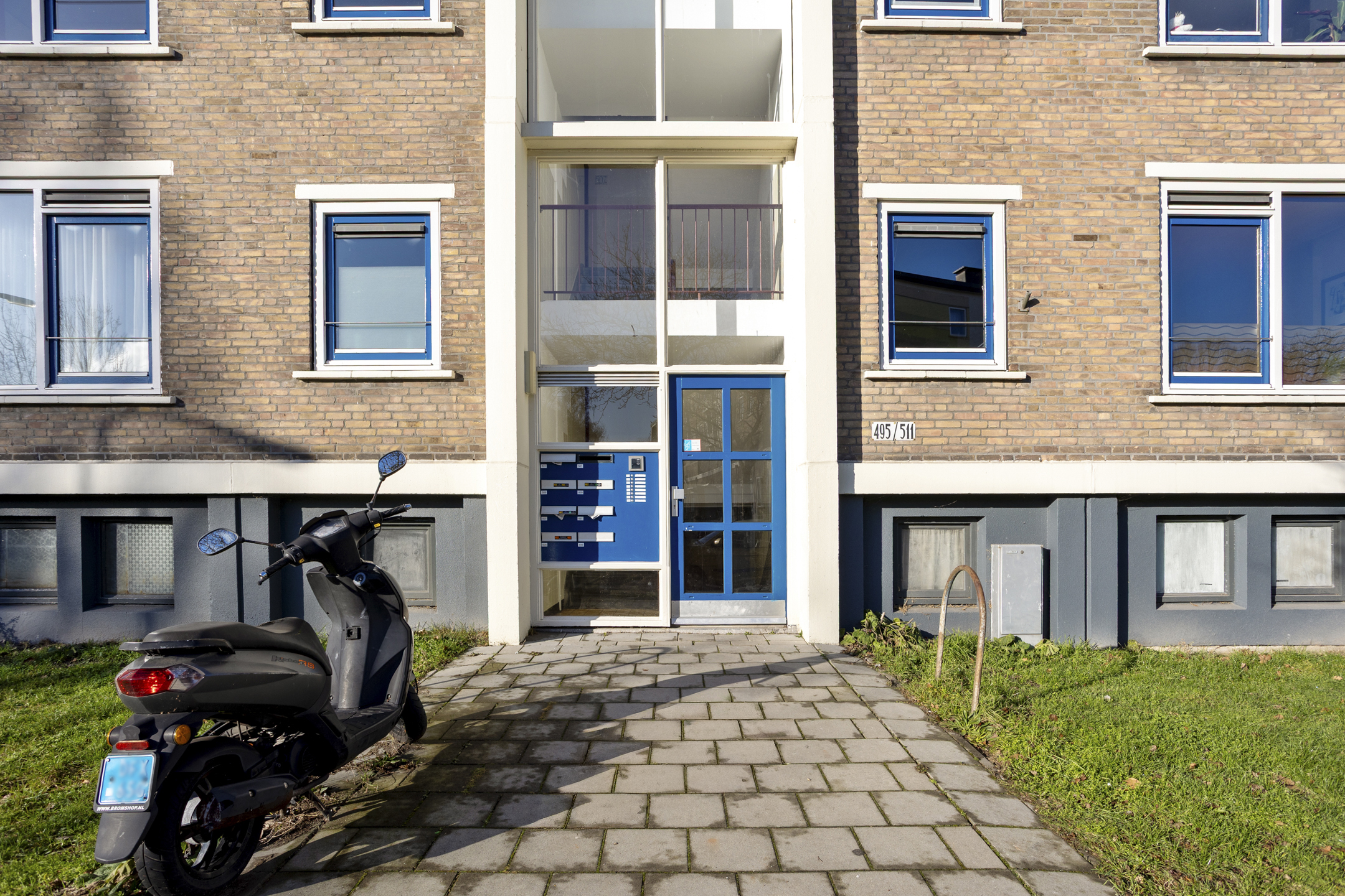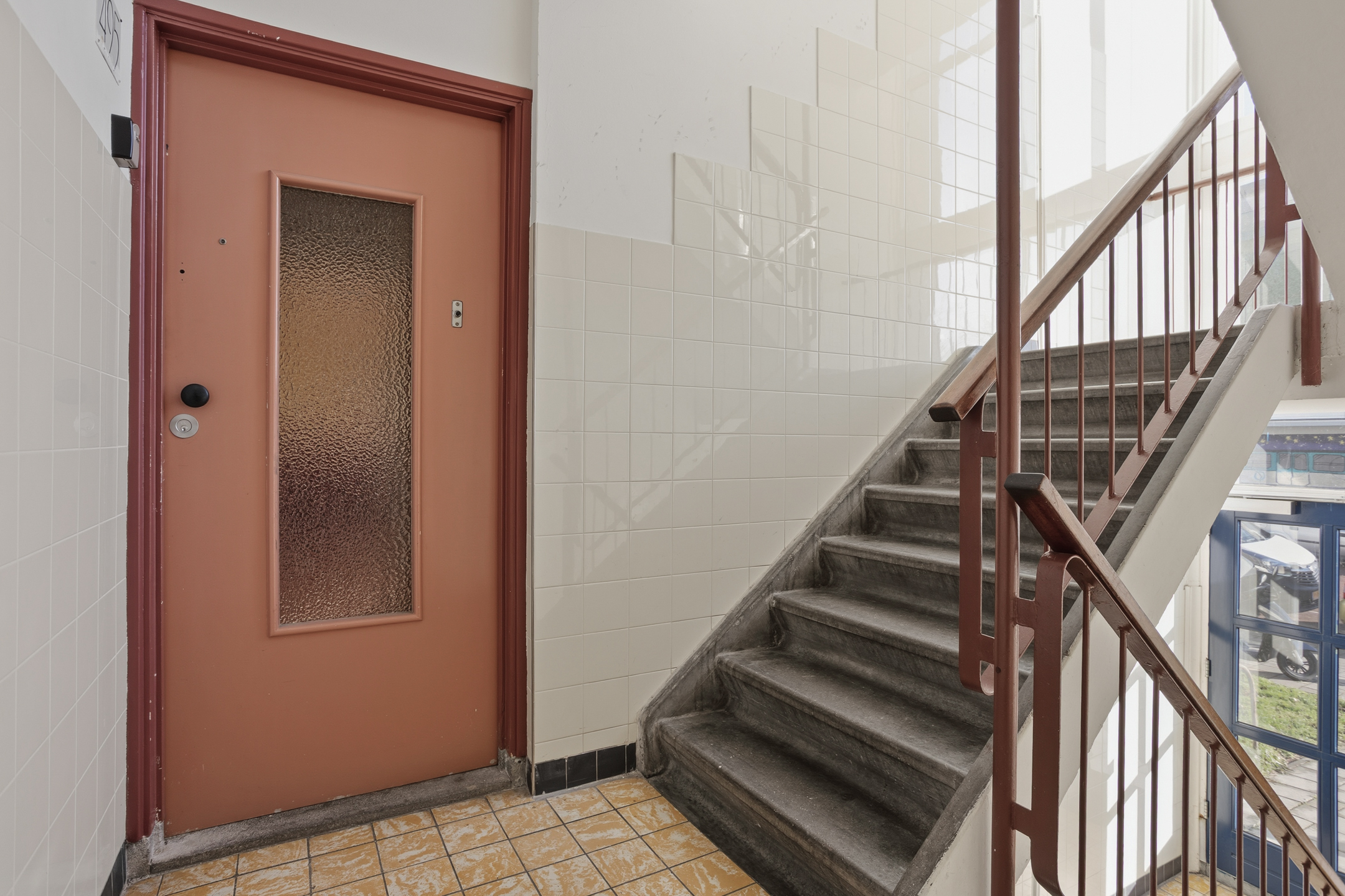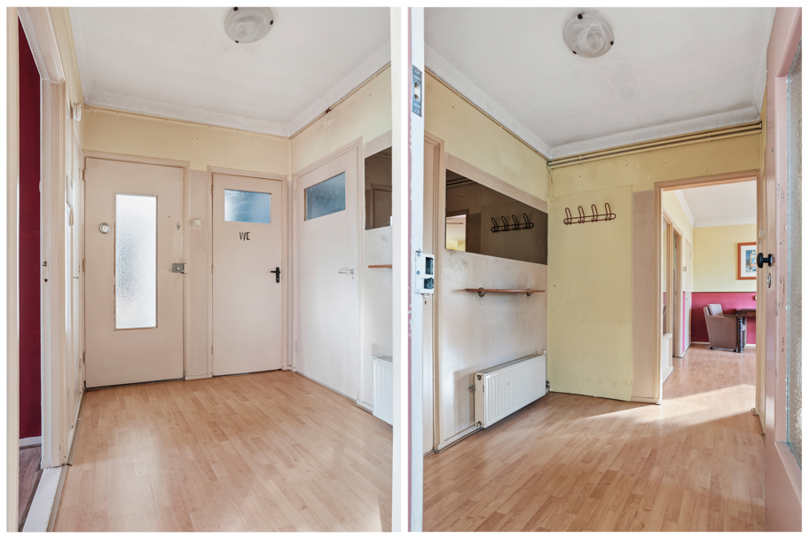 Afgesloten entree met brievenbussen en bellentableau. Via de trap bereik je de verhoogde parterre.