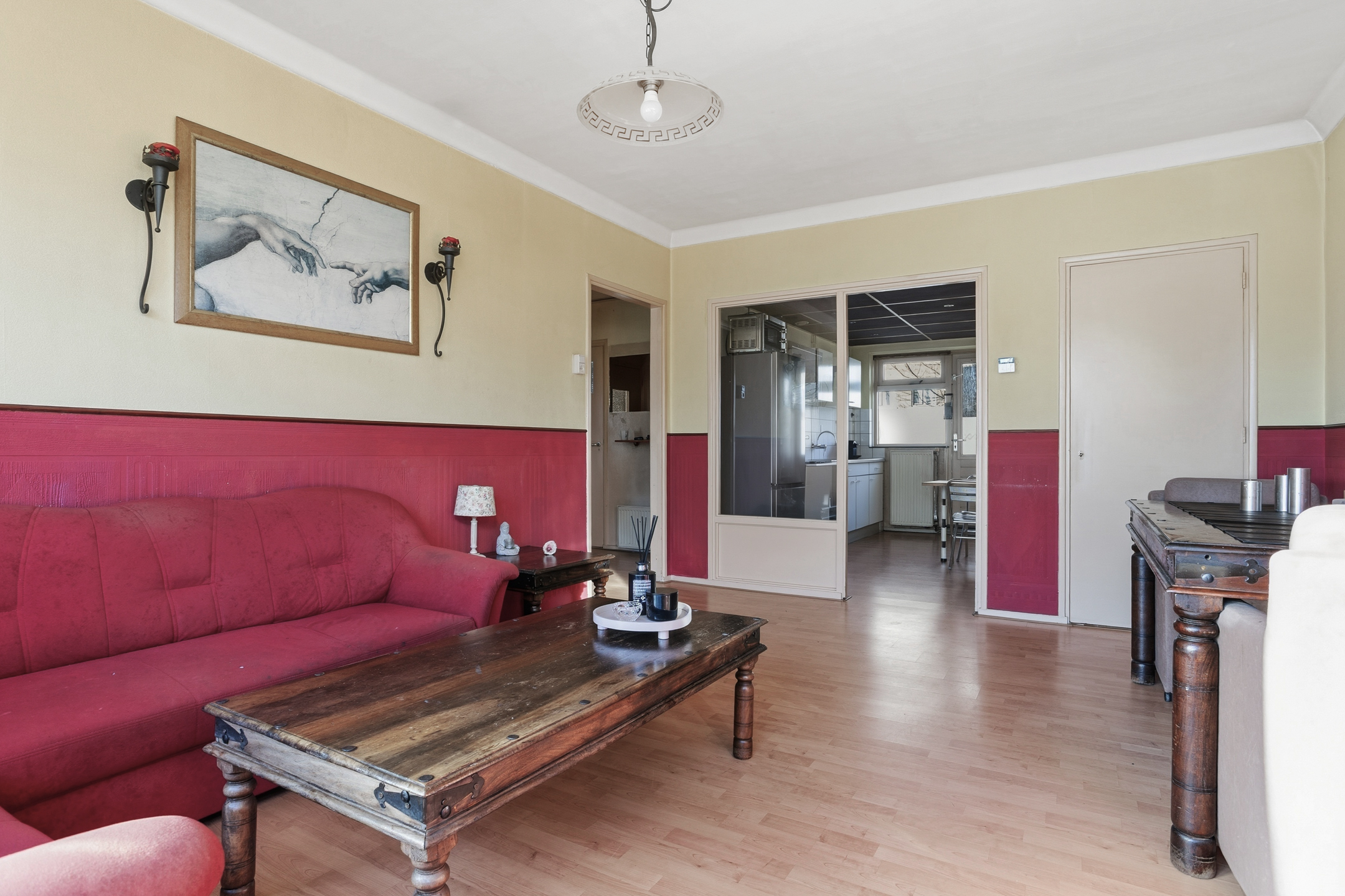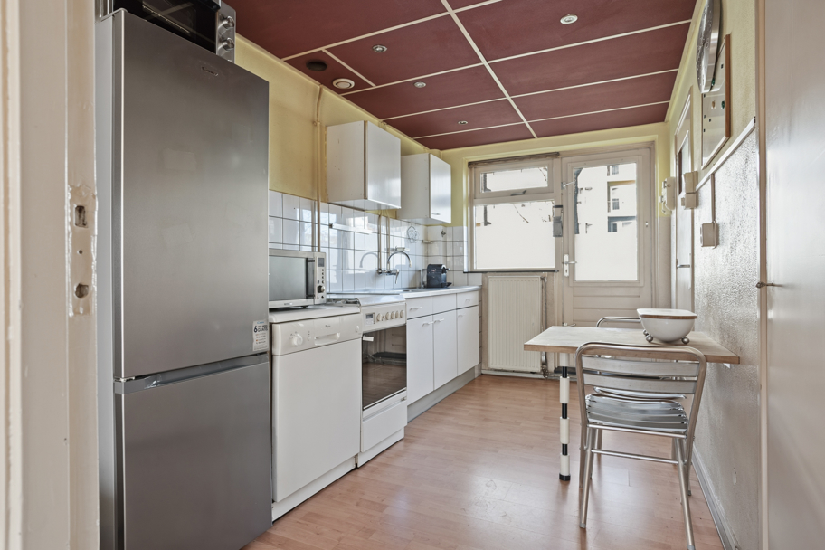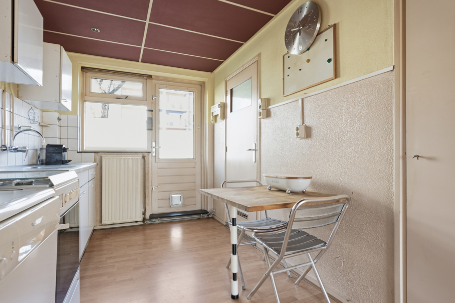 De lichte woonkamer beschikt over een handige inbouwkast en biedt een prettige leefruimte. Aangrenzend bevindt zich de halfopen keuken met keukenblok, uitgerust met een 4-pits gasfornuis, afzuigkap en een ruime inbouwkast met veel bergruimte.