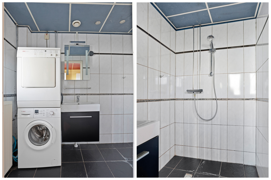 De badkamer is voorzien van een douche, wastafel en aansluitingen voor wasmachine en droger.