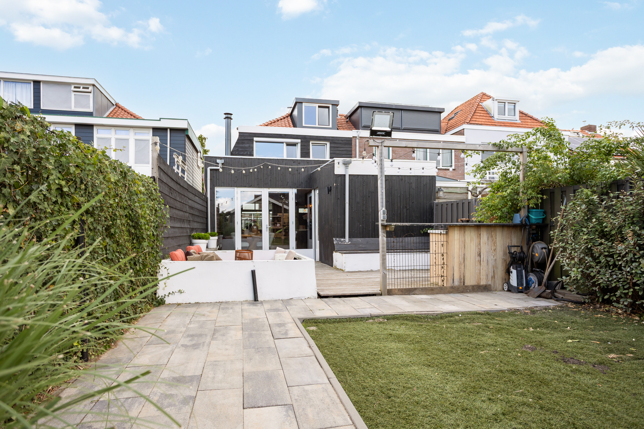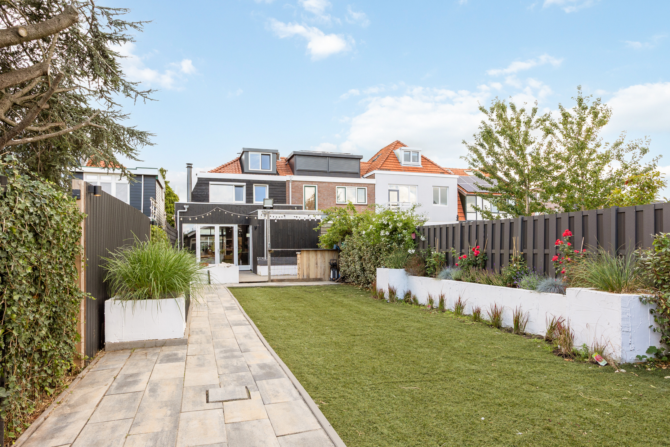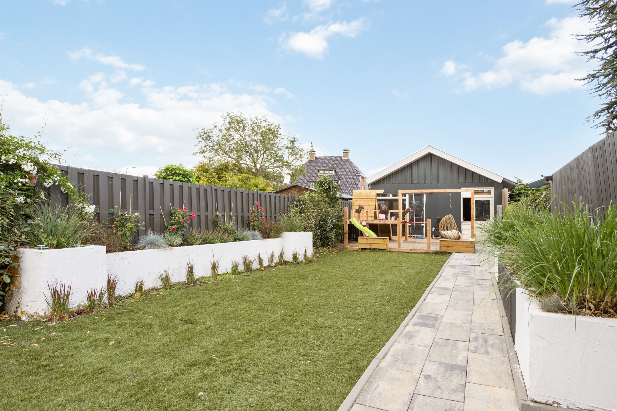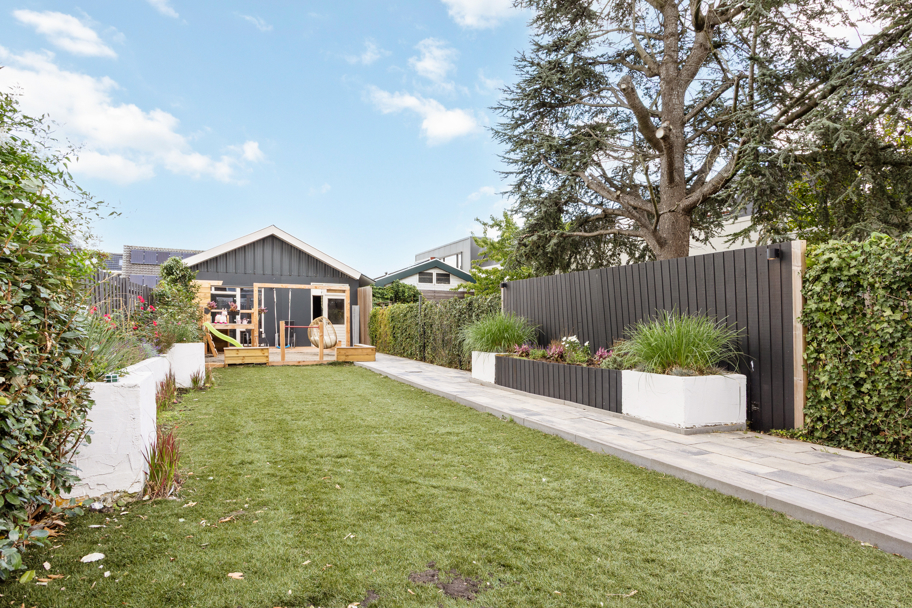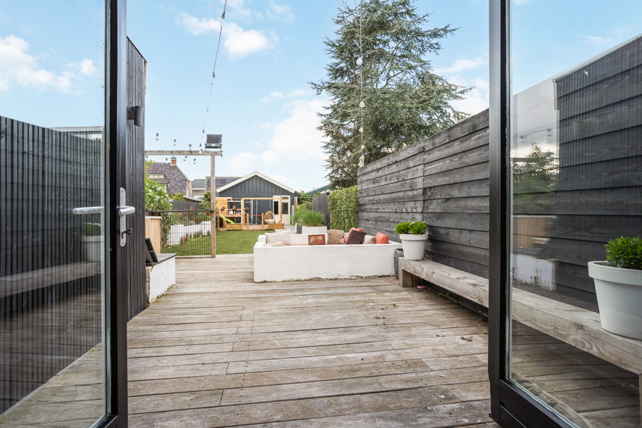 De achtertuin is zeer ruim en kindvriendelijk met genoeg ruimte om te ontspannen of om gezellige zomeravonden te organiseren. De tuin heeft een toegang achterom en geeft directe toegang tot de garage.