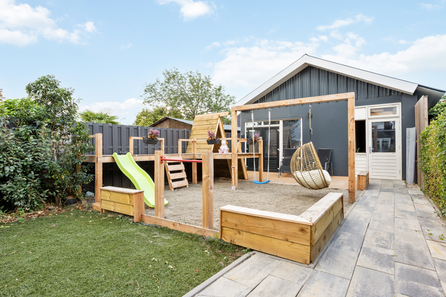 Vanuit de voortuin bereikt u de woning, deze heeft een hal, meterkast, toilet en toegang tot de zeer ruime woonkamer met een erker aan de voorzijde van de woning. Aan de achterzijde is de moderne keuken met het zeer ruime eetgedeelte en toegang tot de zonnige achtertuin. Tevens heeft de woning een aangebouwde bijkeuken met een werkblad en ook toegang tot de achtertuin.