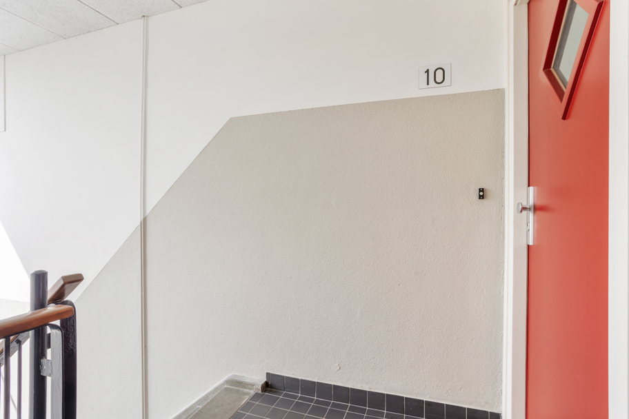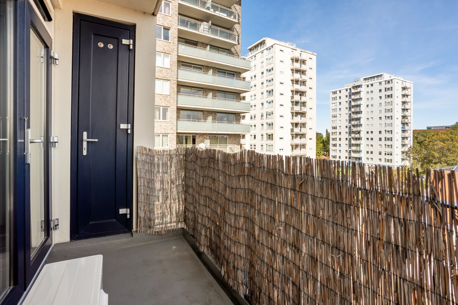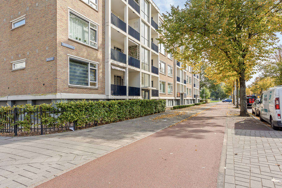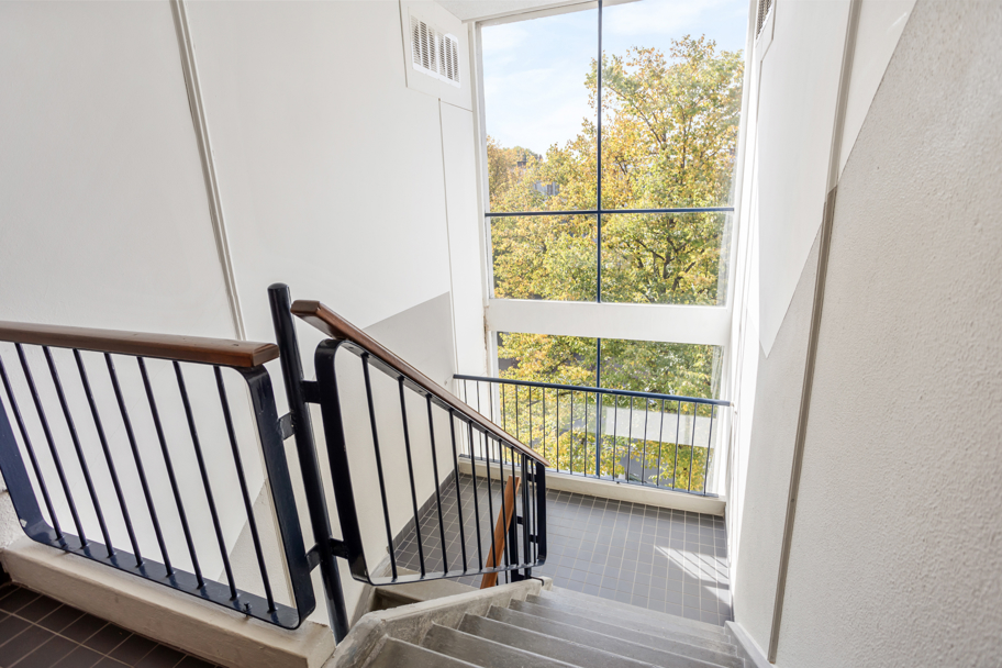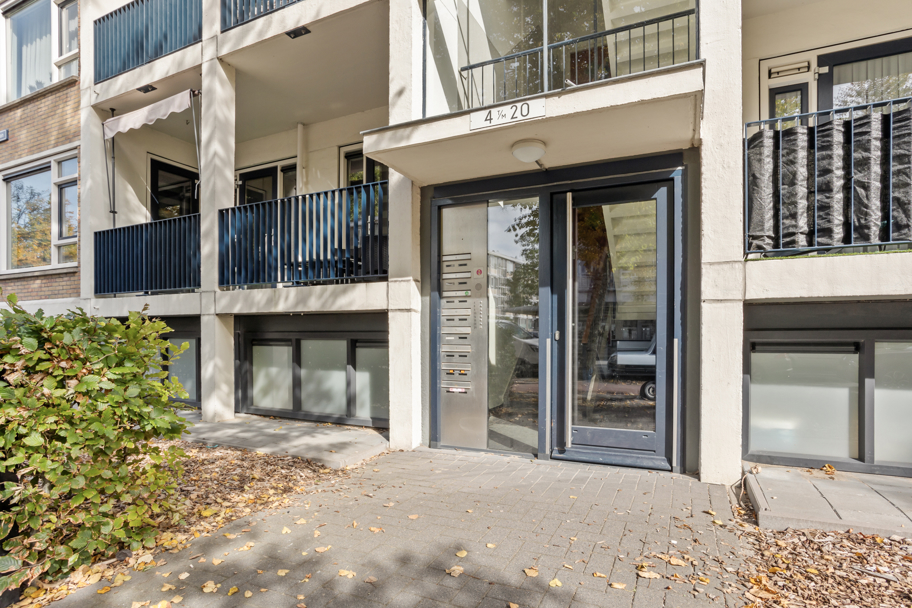Aan de voorzijde van het complex ligt een verzorgde groene voortuin eigendom van de Vereniging van Eigenaren. Middels het centraal afgesloten portiek met bellen- en brievenbussentableau kunt u met de trap naar de 4e woonverdieping waar er 2 appartementen bereikbaar zijn.