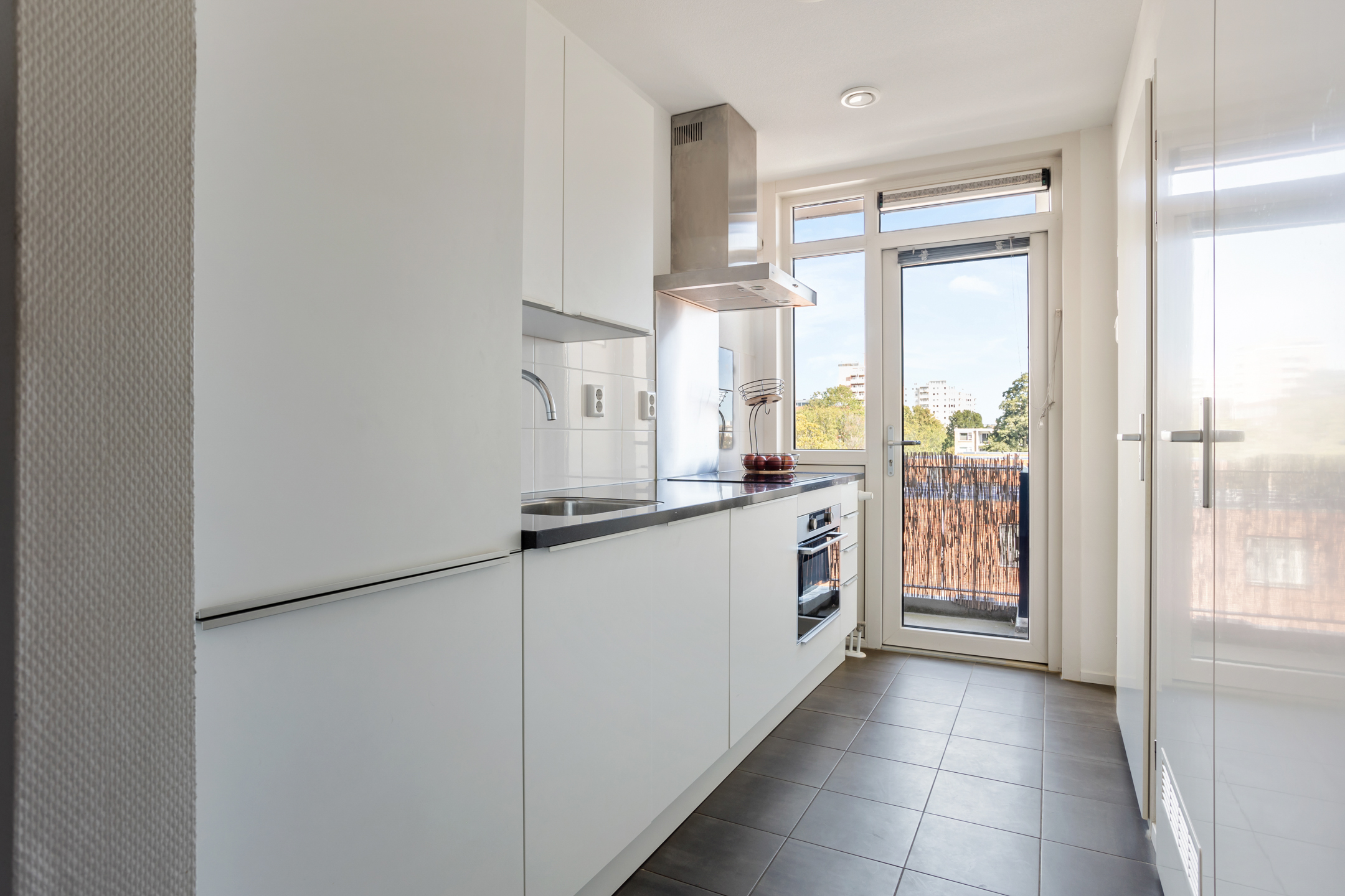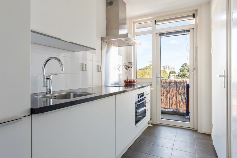 De gesloten moderne keuken is zeer verzorgd en voorzien van diverse inbouwapparatuur zoals een koel/vriescombinatie, een combi-oven, keramische kookplaat met recirculatiekap en een vaatwasser. Ook is hier een zeer praktische bergkast met daarin de pomp voor de vloerverwarming en de unit van de stadsverwarming.
