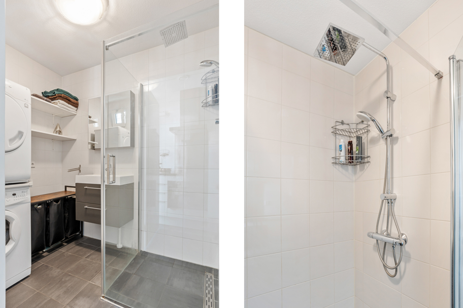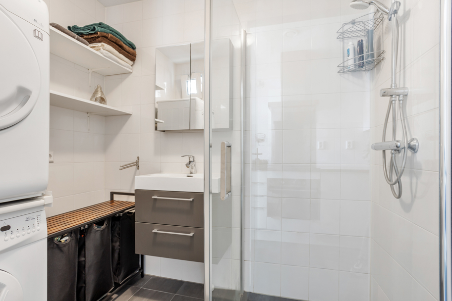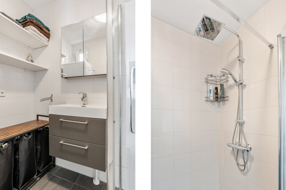Via de keuken komt u in de fraaie badkamer. De badkamer is in wit met grijze kleurstelling, praktisch ingedeeld met een inloopdouche, badkamermeubel met vaste wastafel en ruimte voor de wasmachine + eventueel droger.