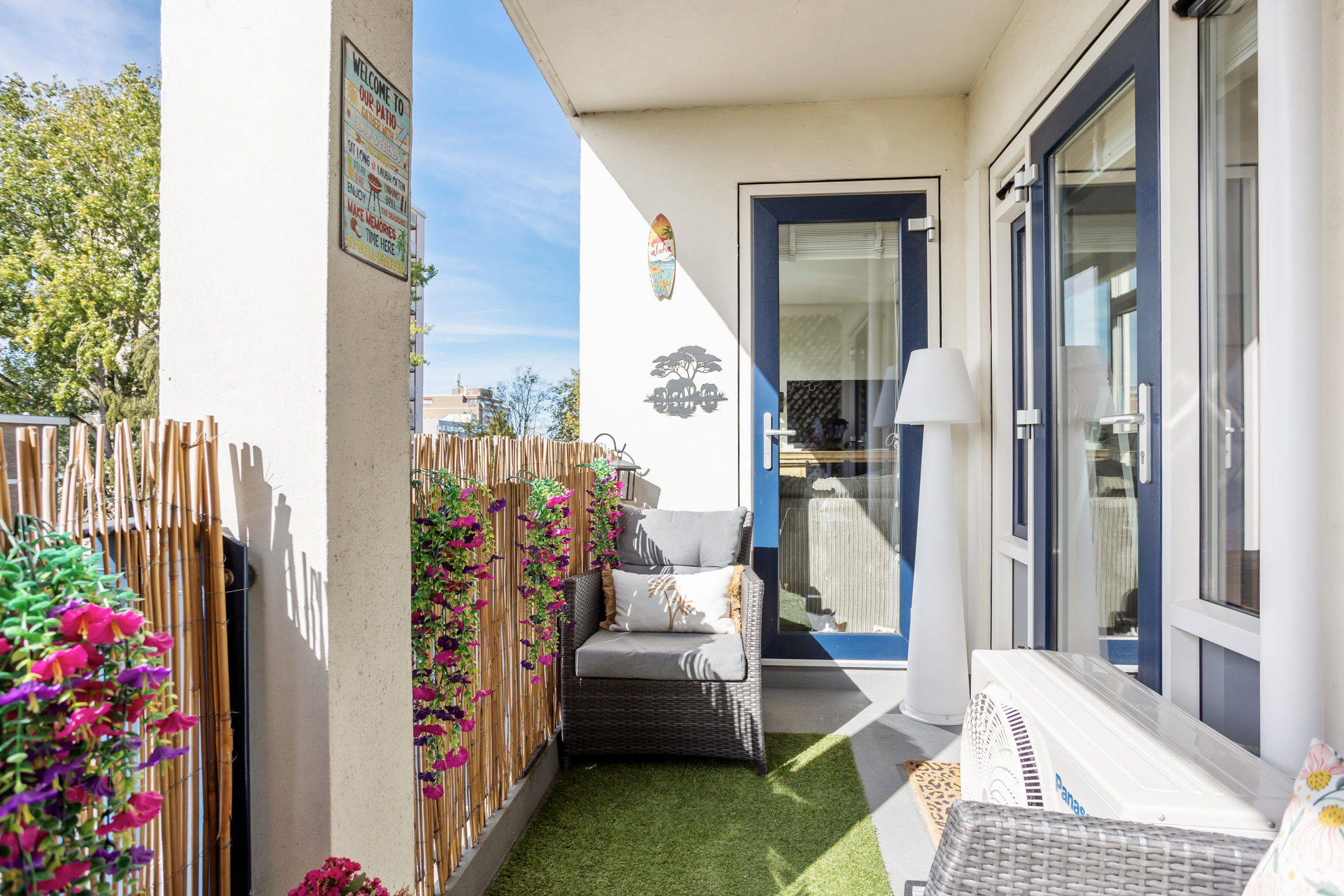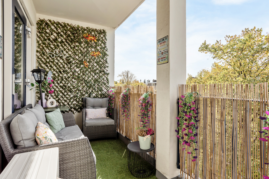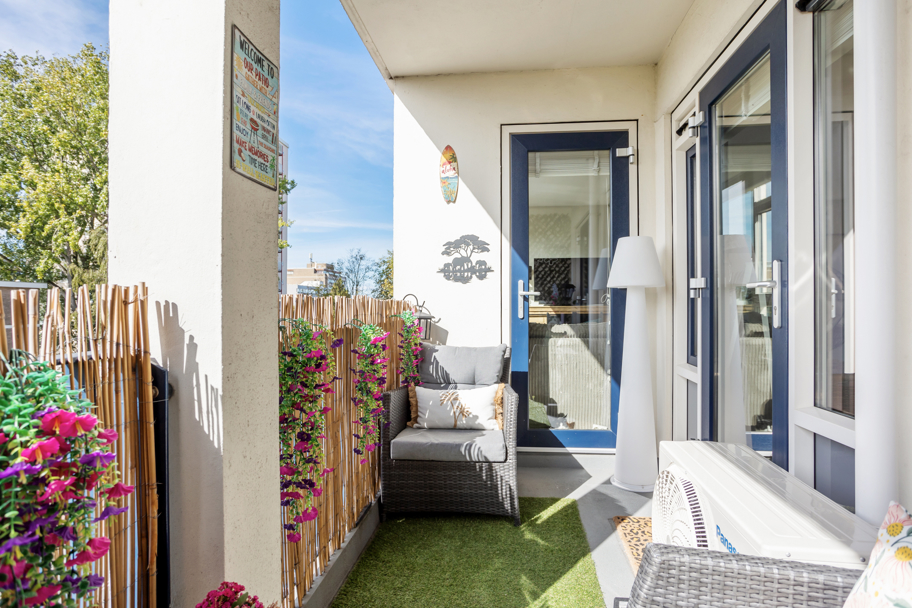 Aan de voorzijde ligt de 1e slaapkamer en de meer dan ruime, lichte en speelse woonkamer. Via de woonkamer (en eventueel ook via de slaapkamer) komt u op het sfeervolle en zonnige balkon gelegen op het ZuidWesten. Dit is een heerlijke plek om van het zonnetje te genieten.
