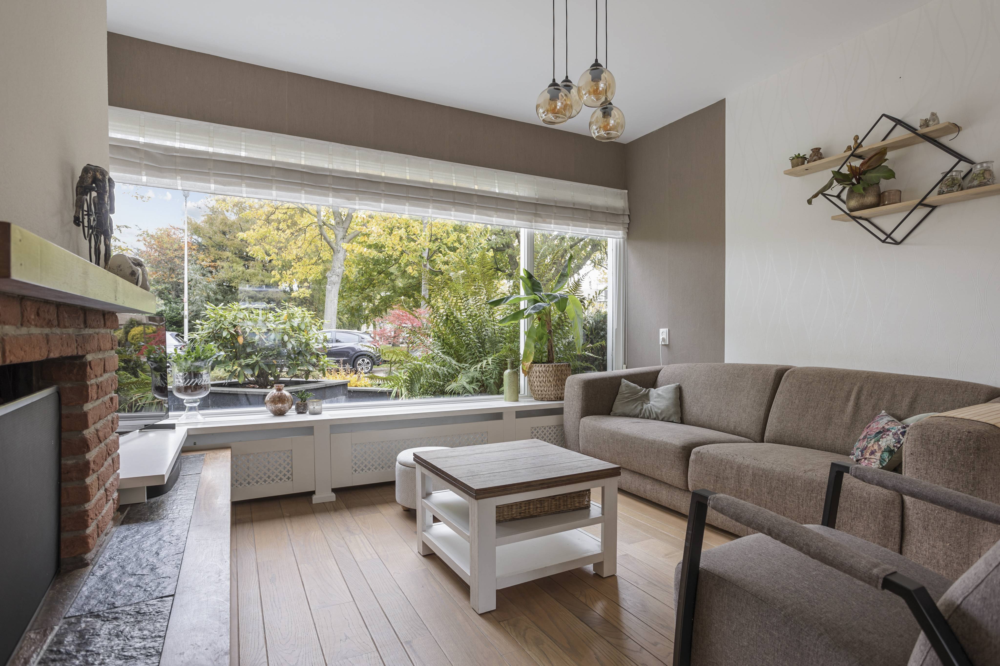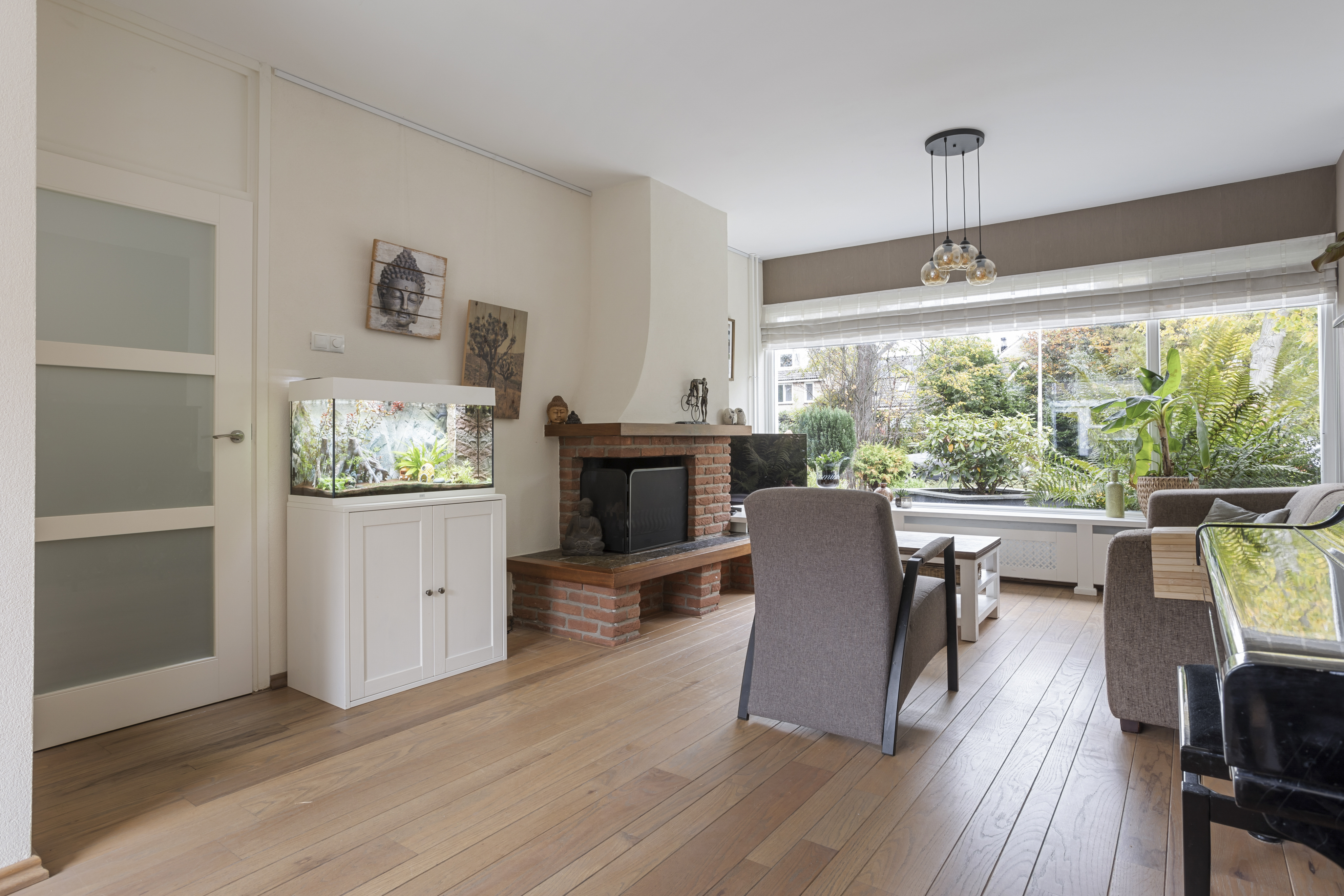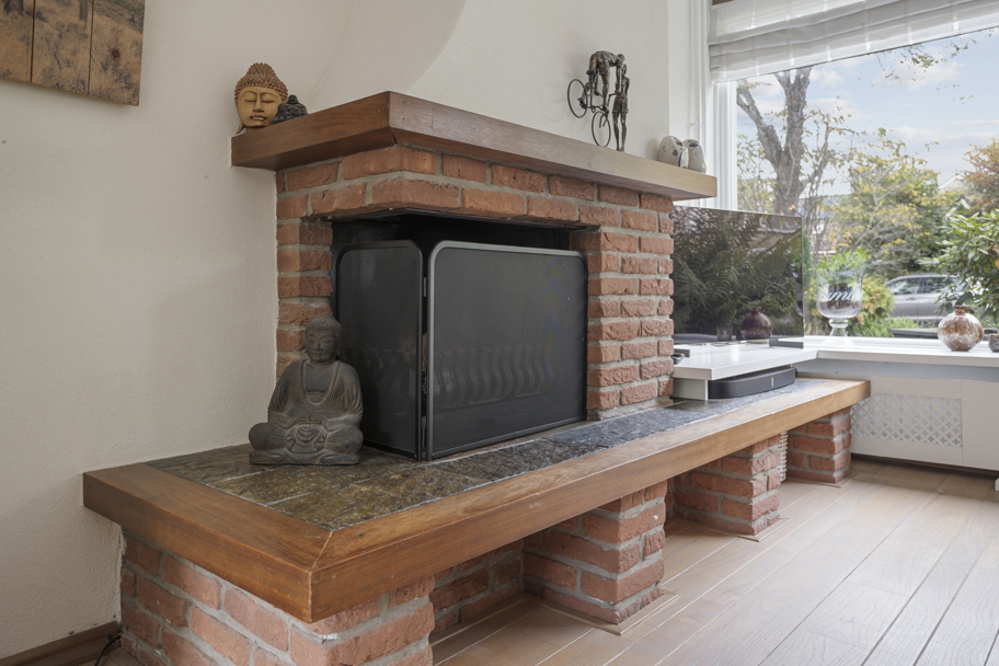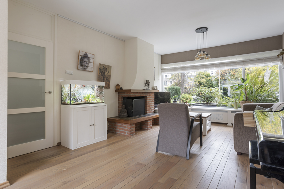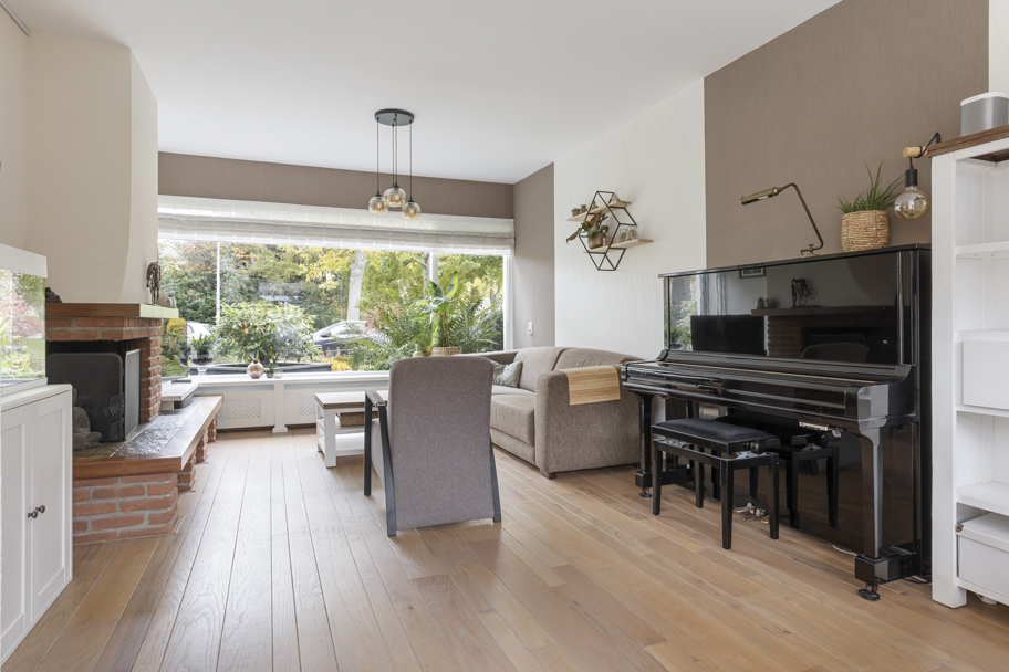 De lichte en ruime woonkamer heeft een sfeervolle houthaard en zowel aan de voor- als aan de achterzijde grote raampartijen. Hierdoor heeft u aan de voorzijde vrij uitzicht op het water en groen en aan de achterzijde op de eigen achtertuin.