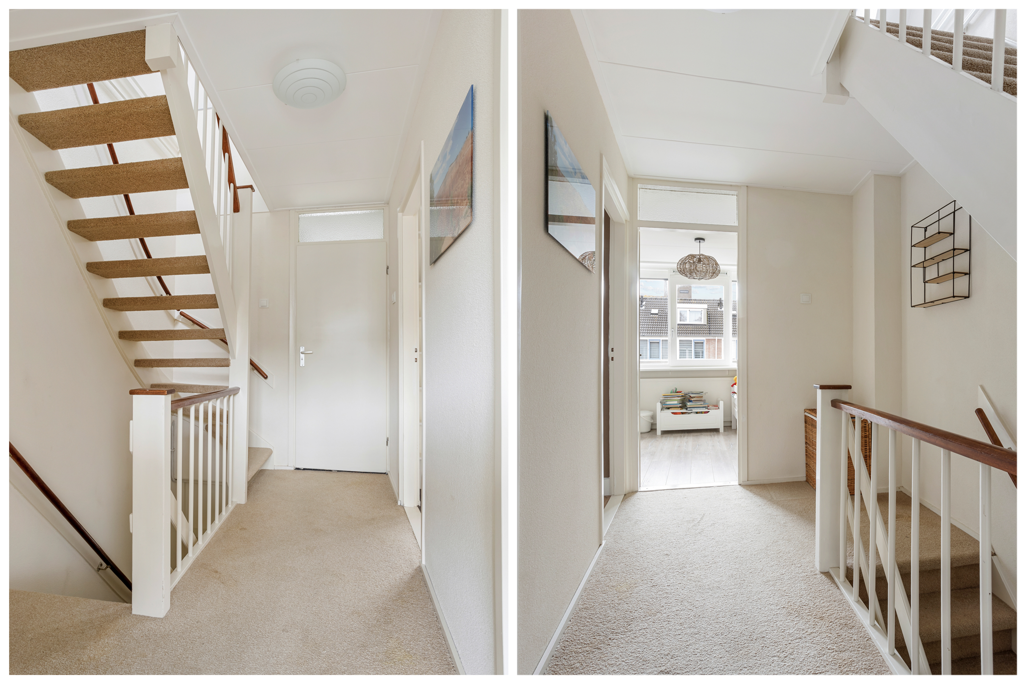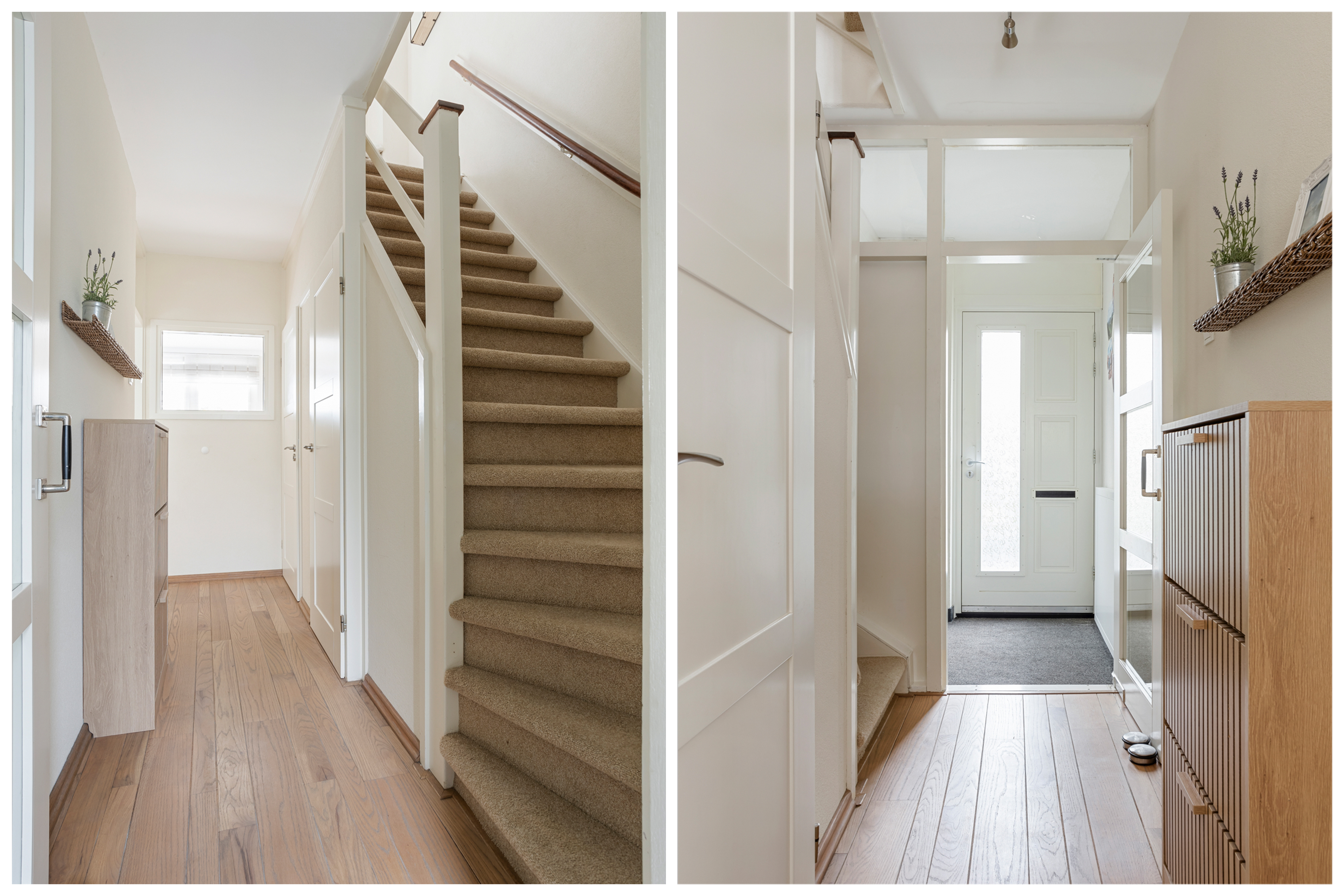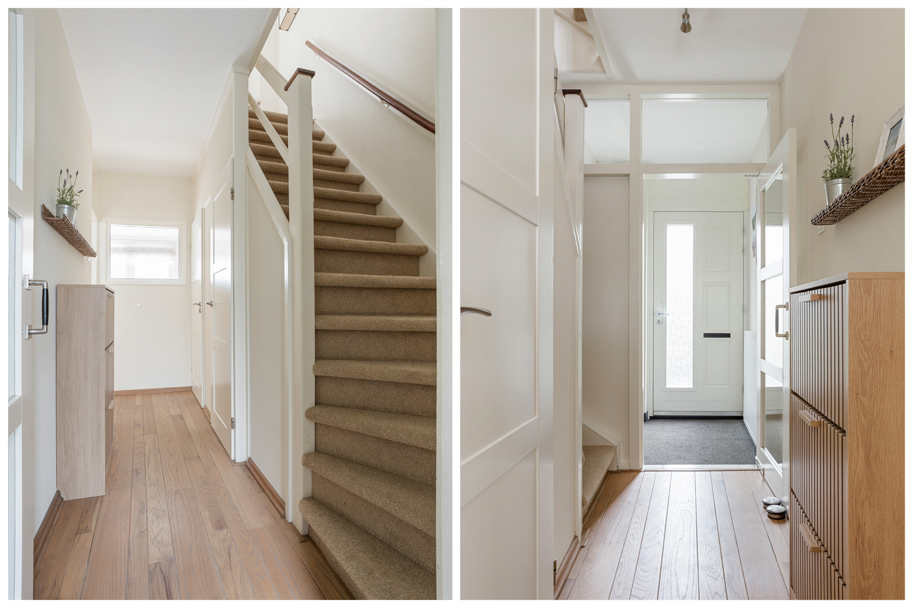 Een diepe verzorgde voortuin geeft toegang tot de woning. Entree, hal met meterkast, bergruimte onder de trap naar de eerste verdieping en separaat verzorgd toilet met zwevend closet en fonteintje.