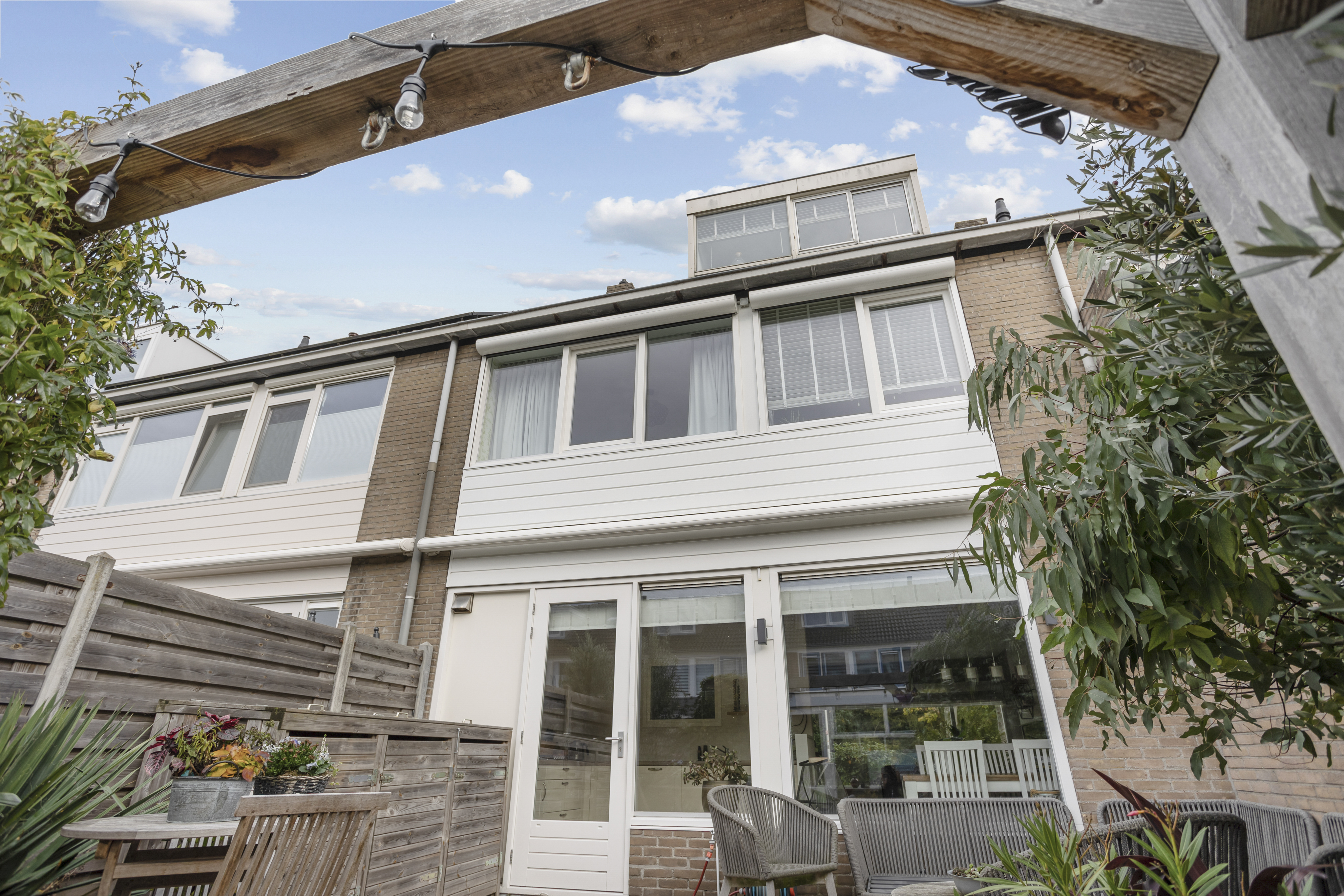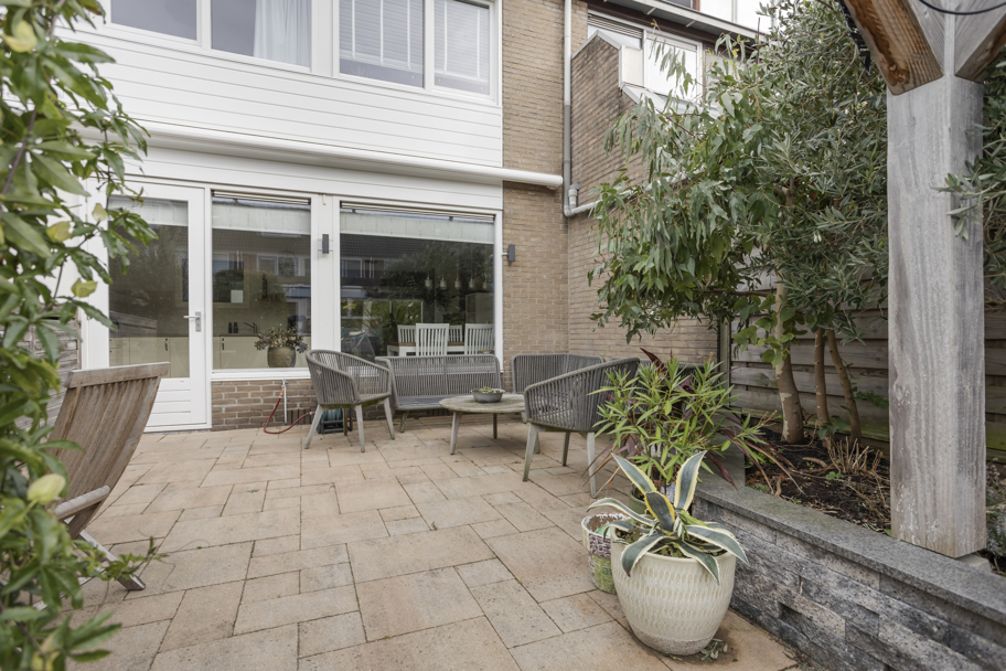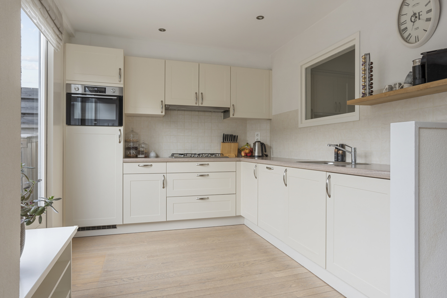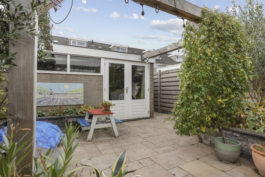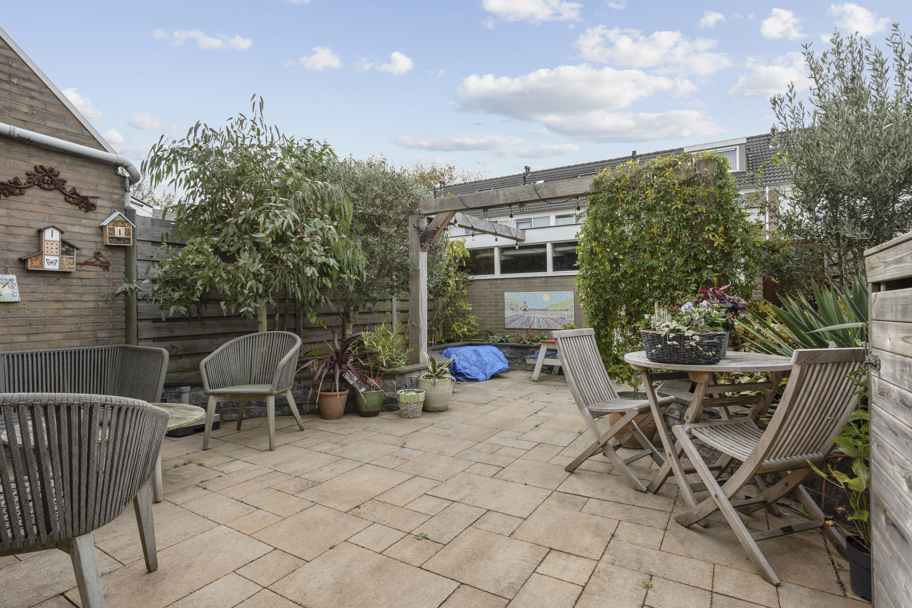 Vanuit de keuken heeft u toegang tot de zonnige en verzorgde achtertuin met groene borders en een pergola. De tuin is breed en ruim waardoor er genoeg ruimte voor kinderen is om te spelen en om een heerlijke zit te maken om van het zonnetje te genieten.