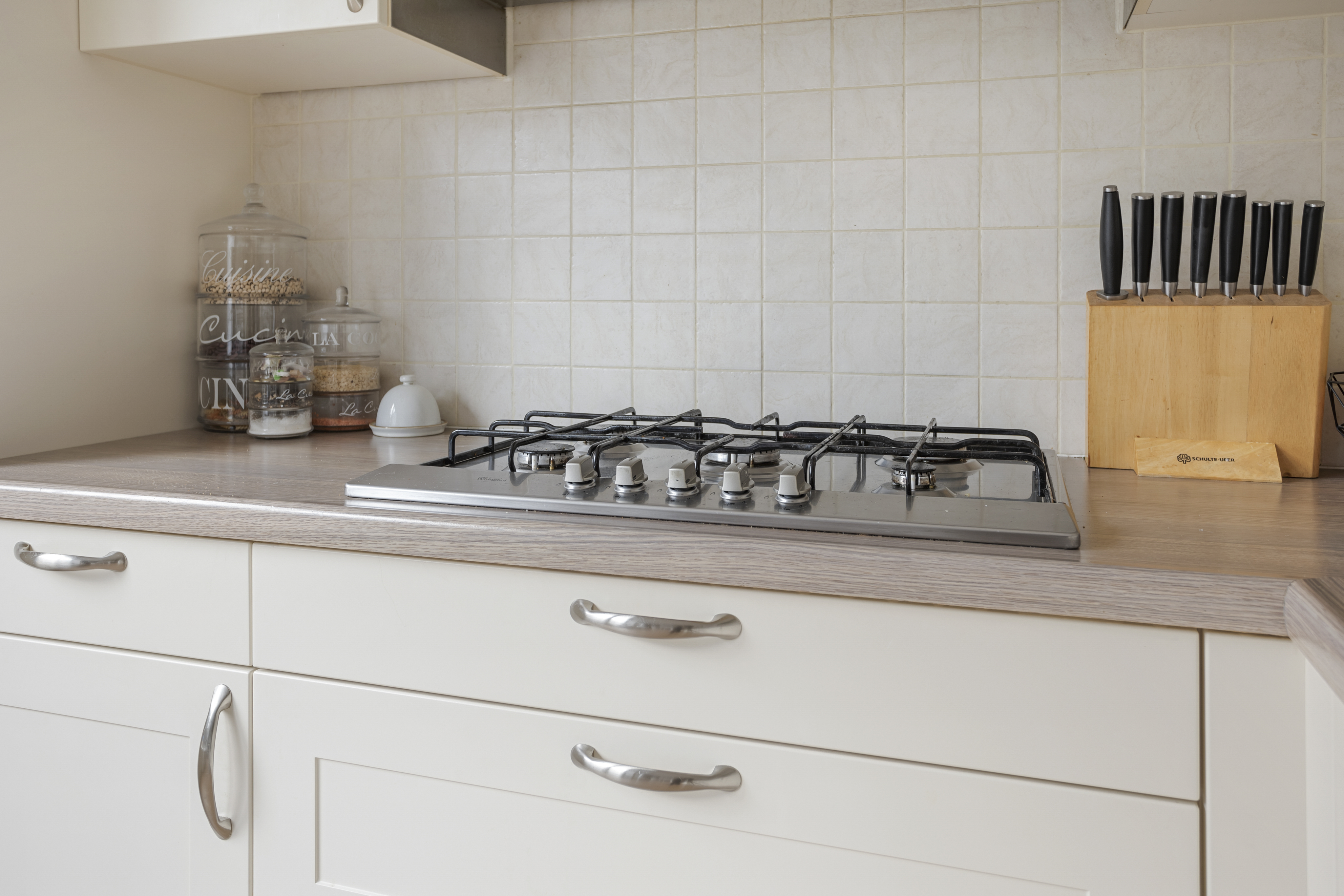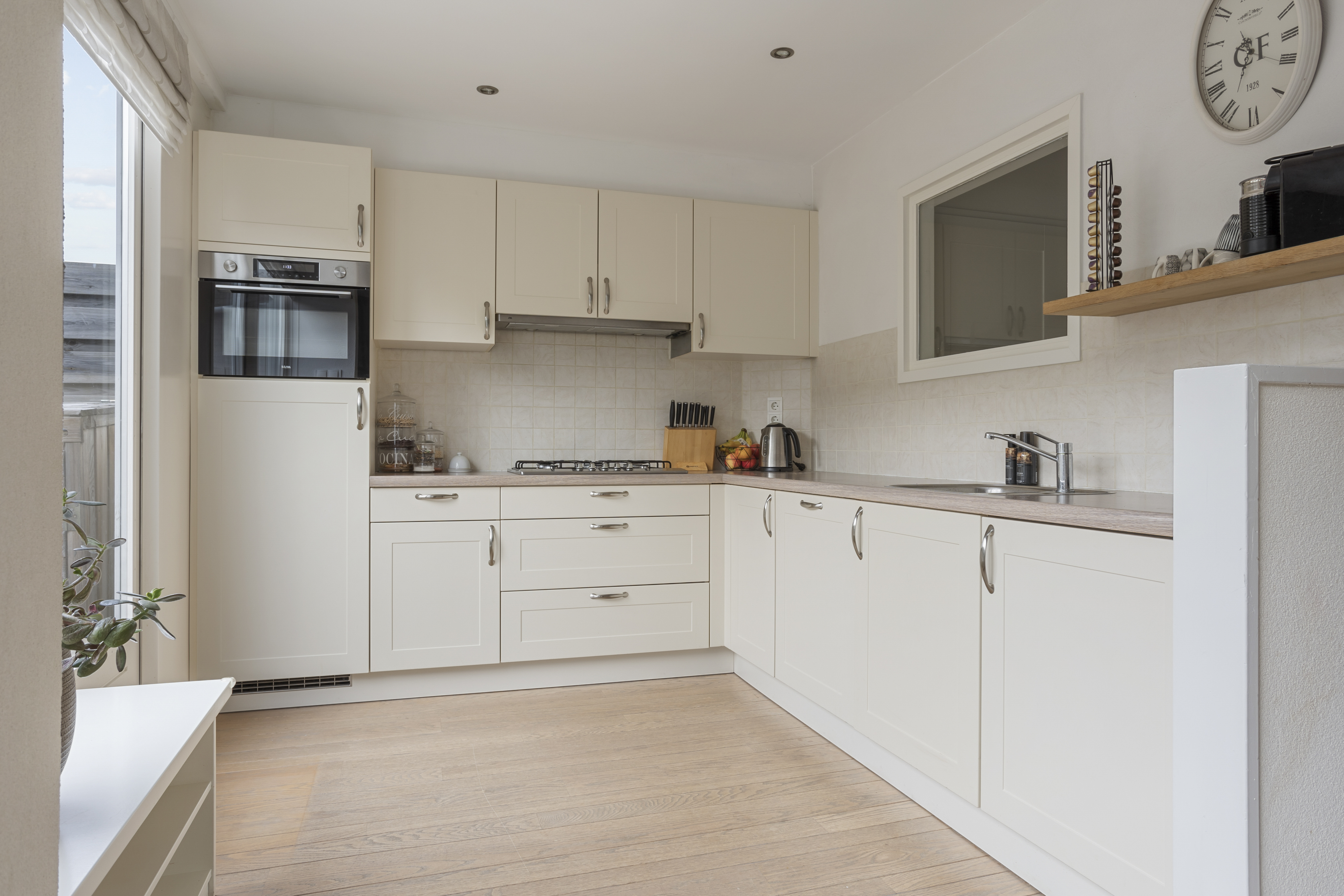 De indeling op de begane grond is in 2013 veranderd waardoor er een ruime L-vormige semi-open keuken aan de achterzijde is gerealiseerd bereikbaar via de woonkamer. Deze moderne en complete keuken heeft veel berg- en werkruimte en heeft diverse inbouwapparatuur zoals een koelkast, vriezer (vernieuwd in 2022), 5-pits gaskookplaat, afzuigkap, combi-oven (vernieuwd in 2023) en een vaatwasser.