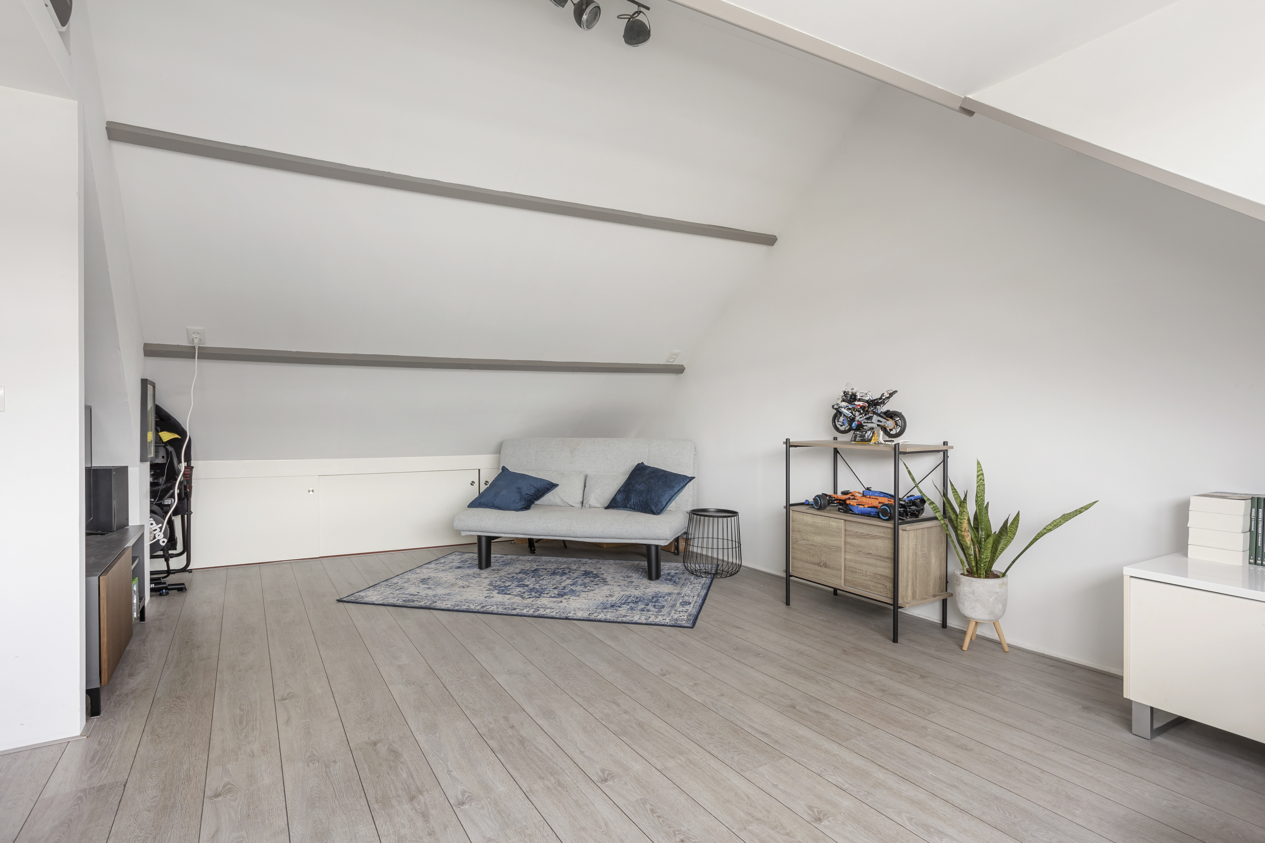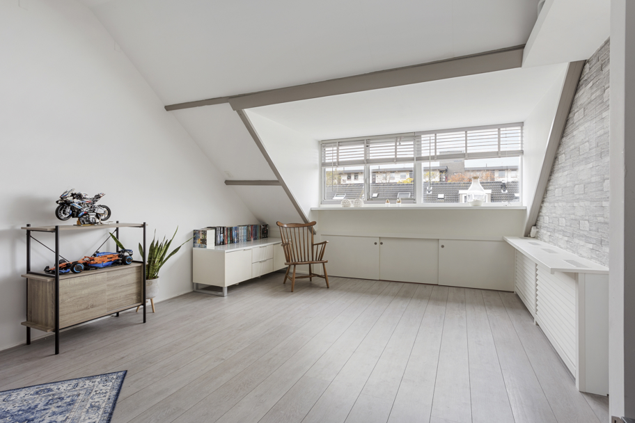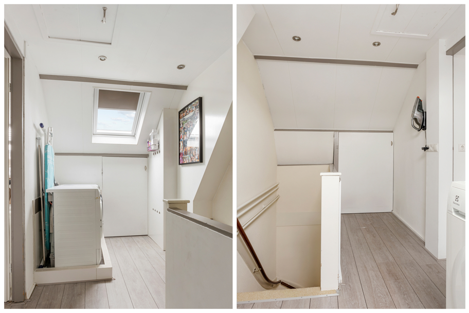 Deze verdieping heeft tevens een lichte overloop met bergruimte achter de schotten, een luik naar de kleine bergvliering en aan de achterzijde een dakraam. U vindt hier de opstelplaats voor de CV ketel en de aansluiting voor de wasmachine en eventueel ook voor de droger. Ook vindt u op deze verdieping de meer dan ruime 4e slaapkamer over de gehele lengte van de woning met aan de tuinzijde een dakkapel. Het dak is van binnenuit geïsoleerd waardoor het plafond van deze kamer zeer verzorgd is afgewerkt.