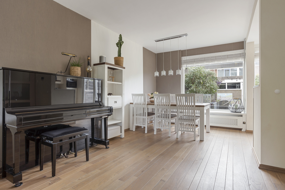 - de woonkamer heeft een parketvloer en de keuken een bijpassende laminaatvloer