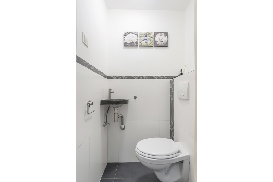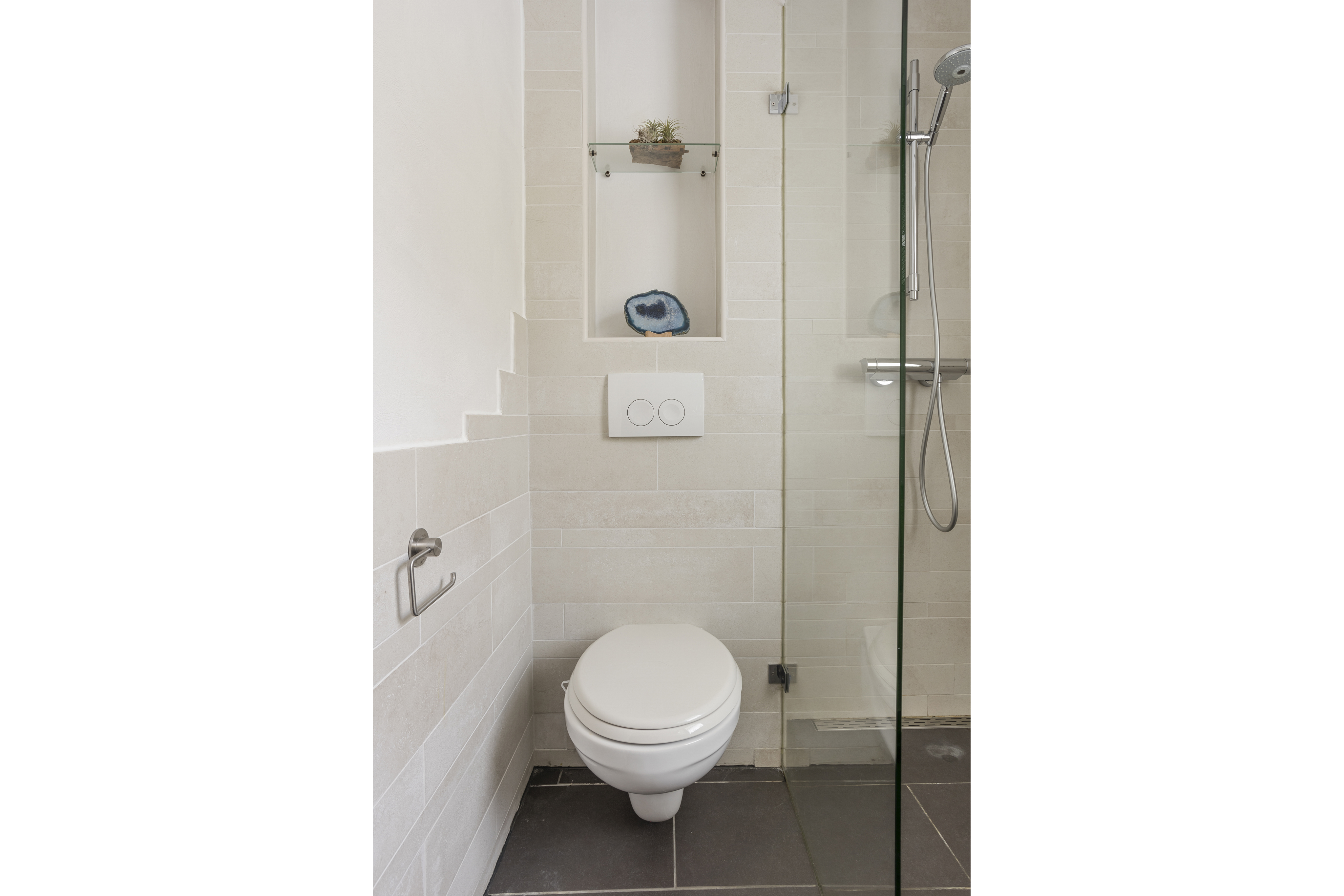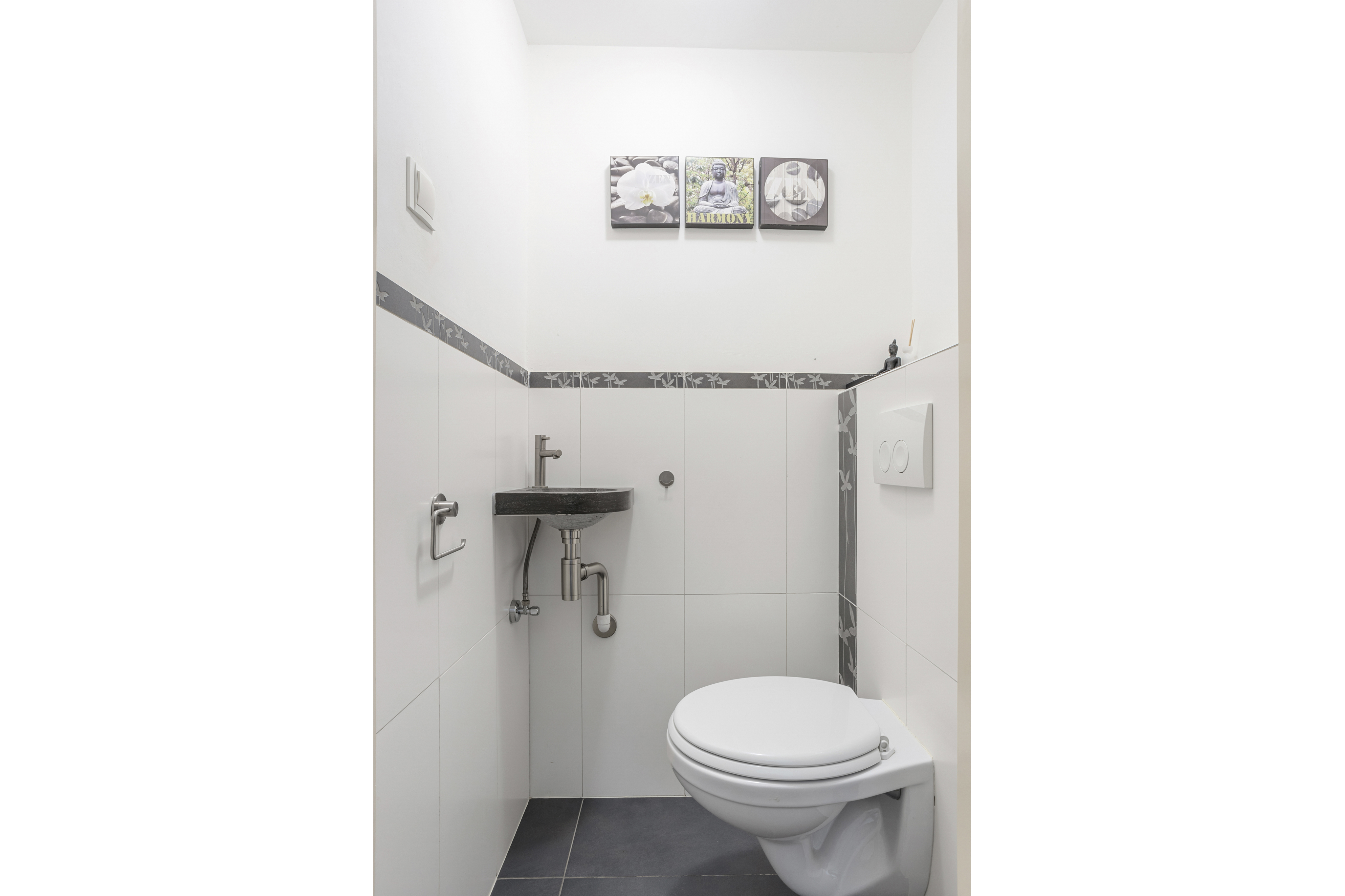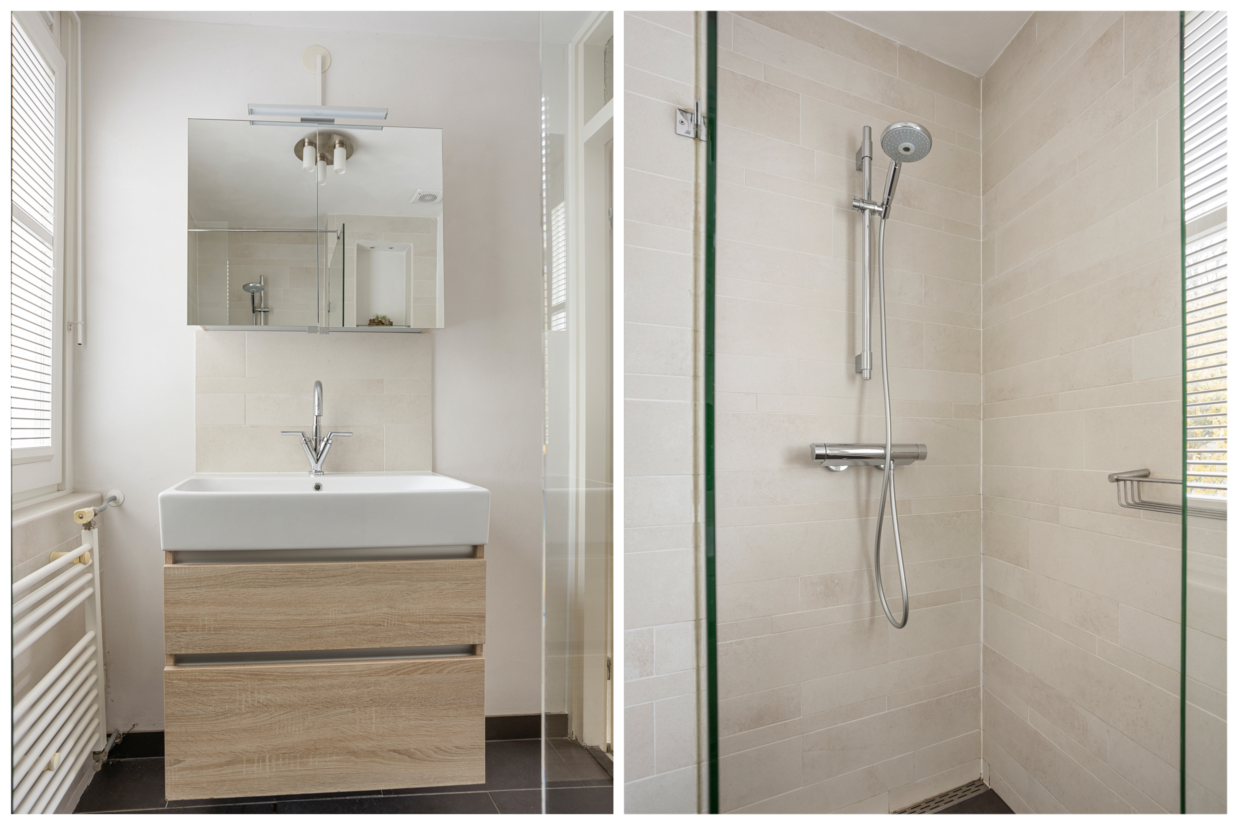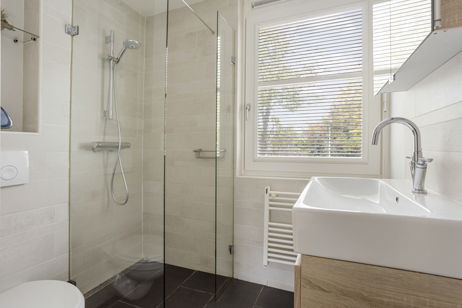 De moderne badkamer, vernieuwd in 2013, is volledig betegeld met een lichte wandtegel en een donker grijze vloertegel. De brede inloopdouche is afgeschermd met een glazen wand, het badkamermeubel heeft lades en een wastafel en is in houtlook uitgevoerd. Tevens heeft de badkamer een zwevend closet en een radiator onder het raamkozijn.