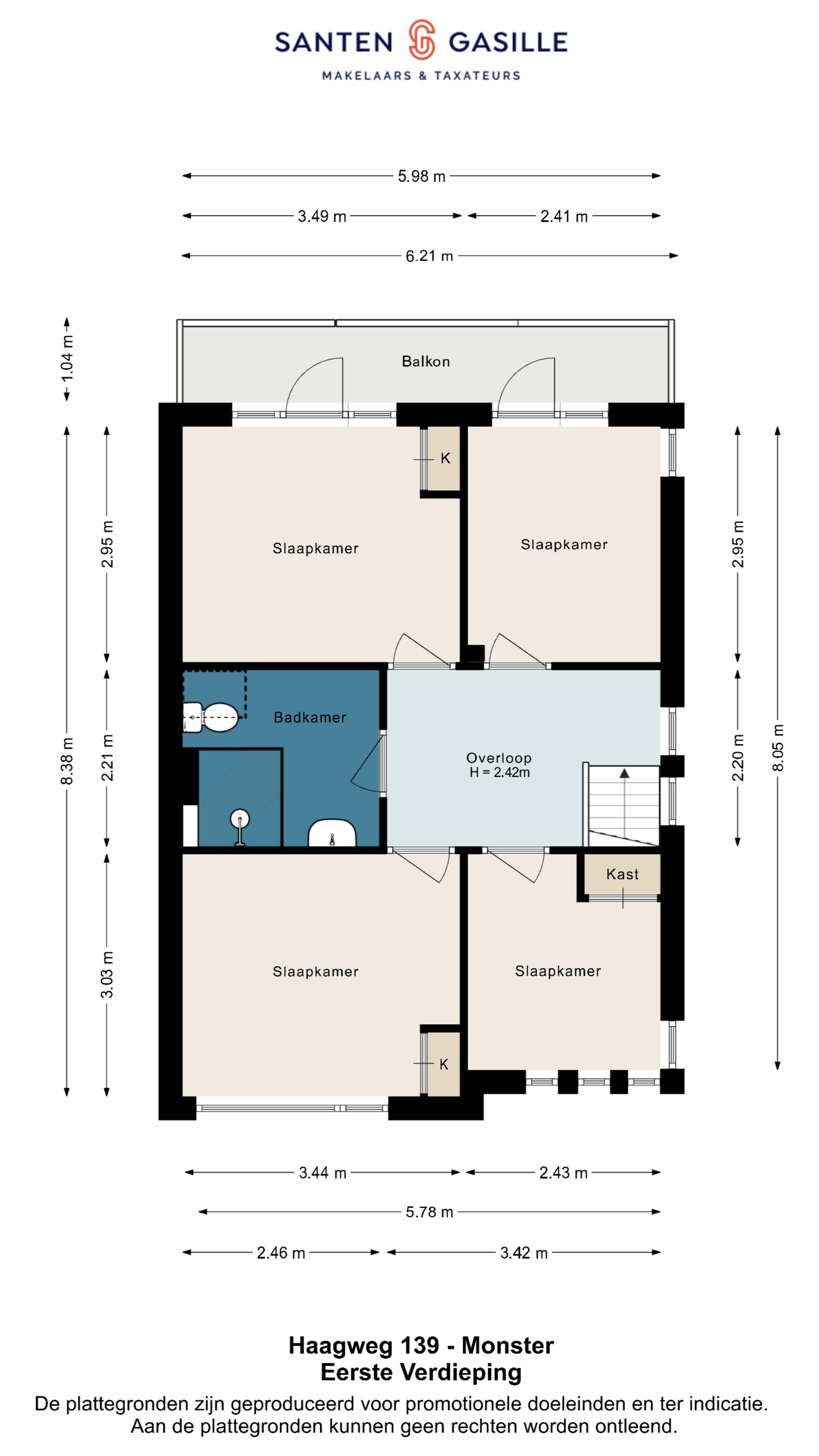 De eerste verdieping heeft een ruime overloop met aangrenzend 4 slaapkamers. De twee van de aan de achterzijde gelegen slaapkamers hebben toegang tot het aan de achterzijde van de woning gelegen zonnige balkon.