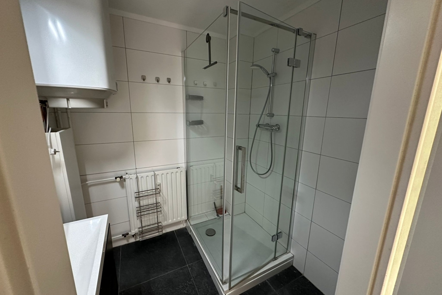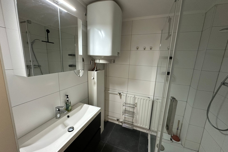 - Volledig betegelde badkamer met douchecabine, wastafel en radiator