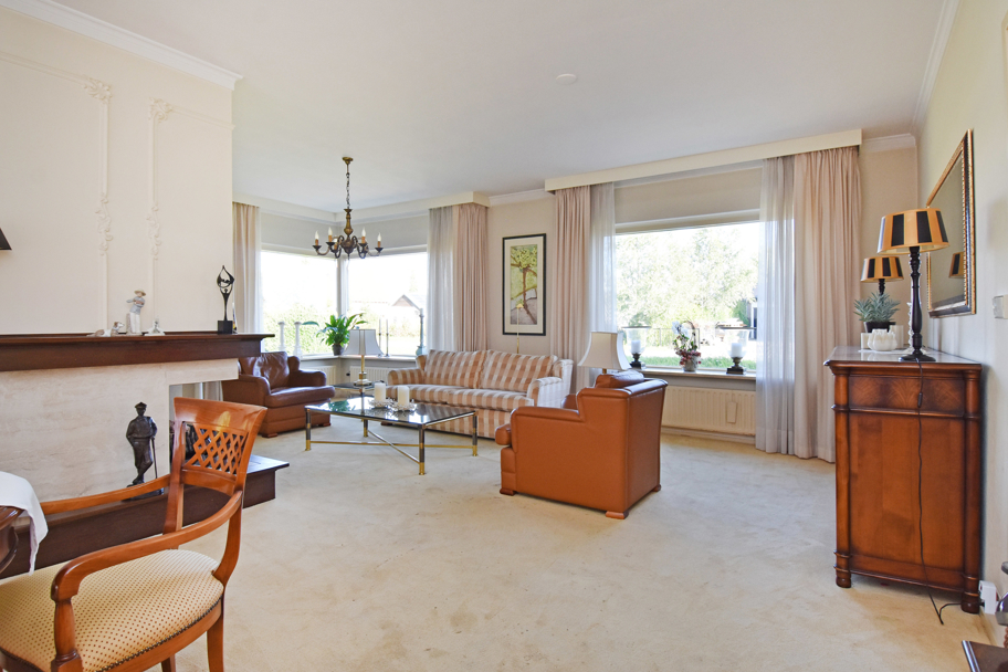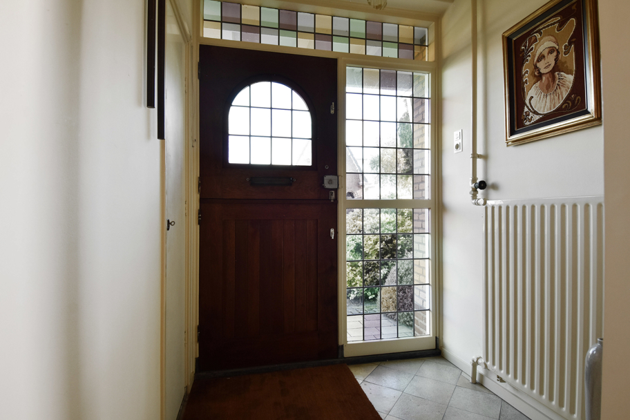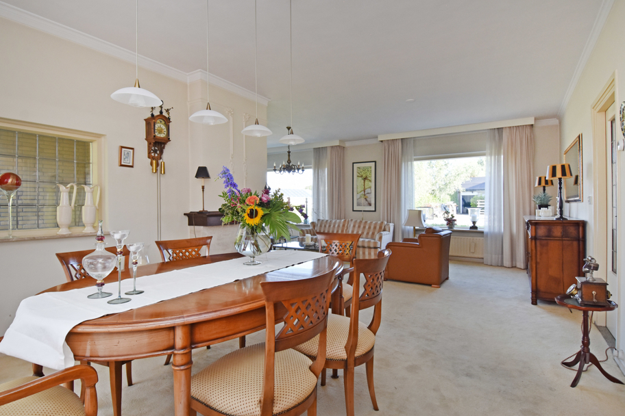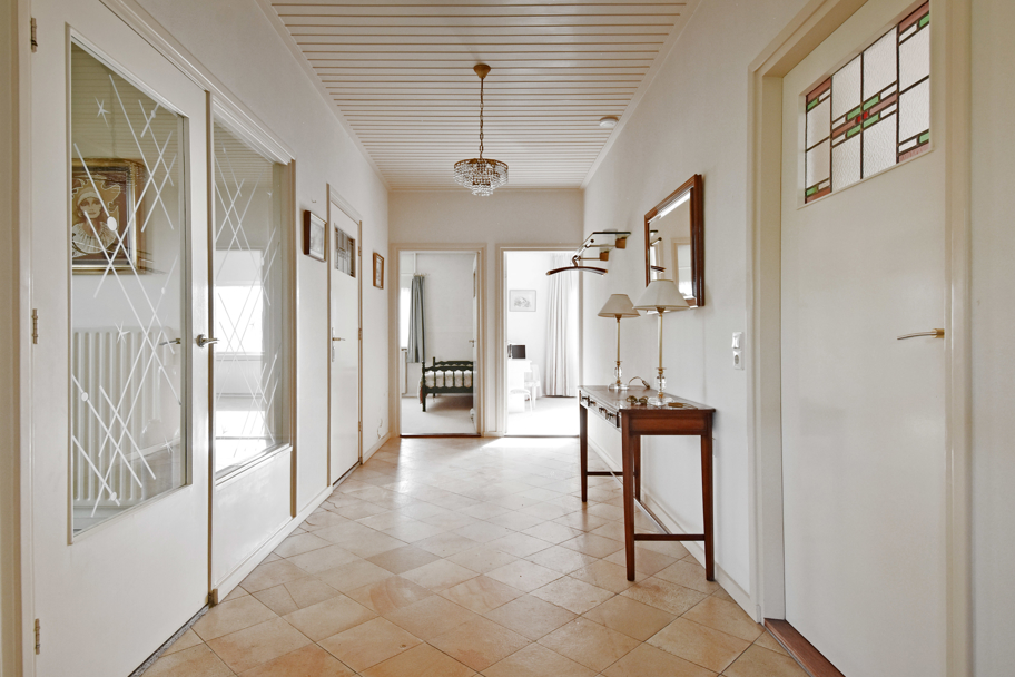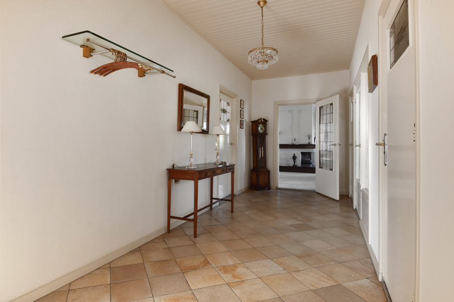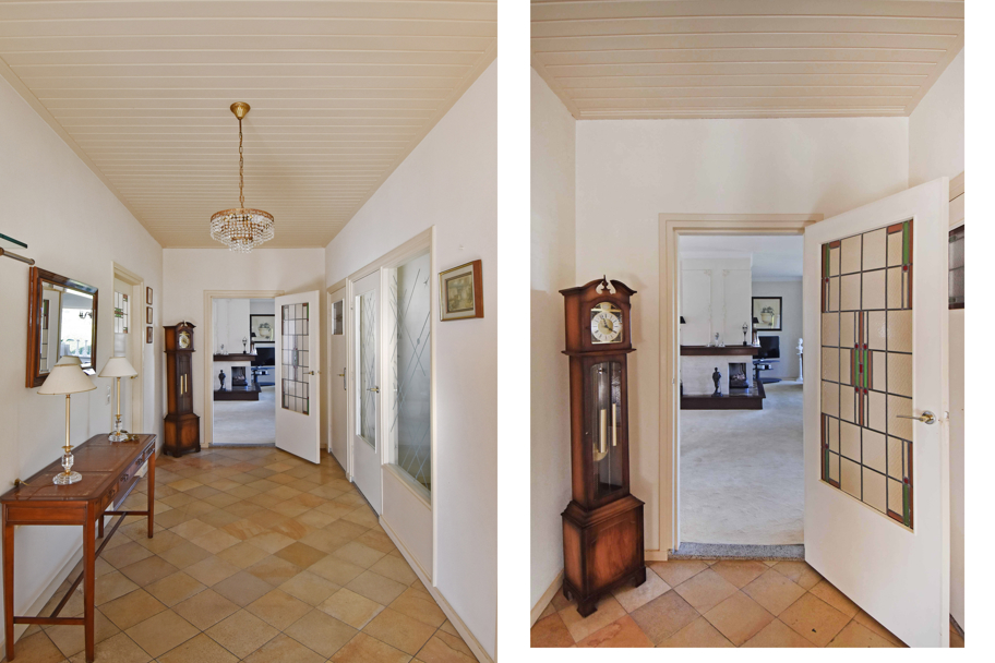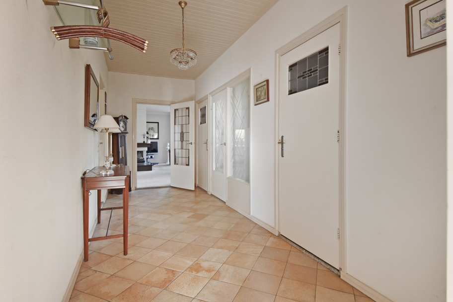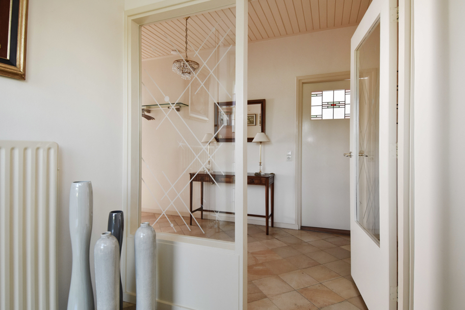 De hoofdentree aan de voorzijde ligt in het midden van de woning. U komt via een ruim voorportaal met de meterkast in de brede ruime hal. De hal geeft toegang tot alle kamers en ruimtes. Aan de rechterzijde ligt de lichte L-vormige ruime woonkamer met een sfeervolle (gas)haard en grote raampartijen. Aan de achterzijde tevens een brede schuifpui naar het terras om heerlijk in het zonnetje te zitten.