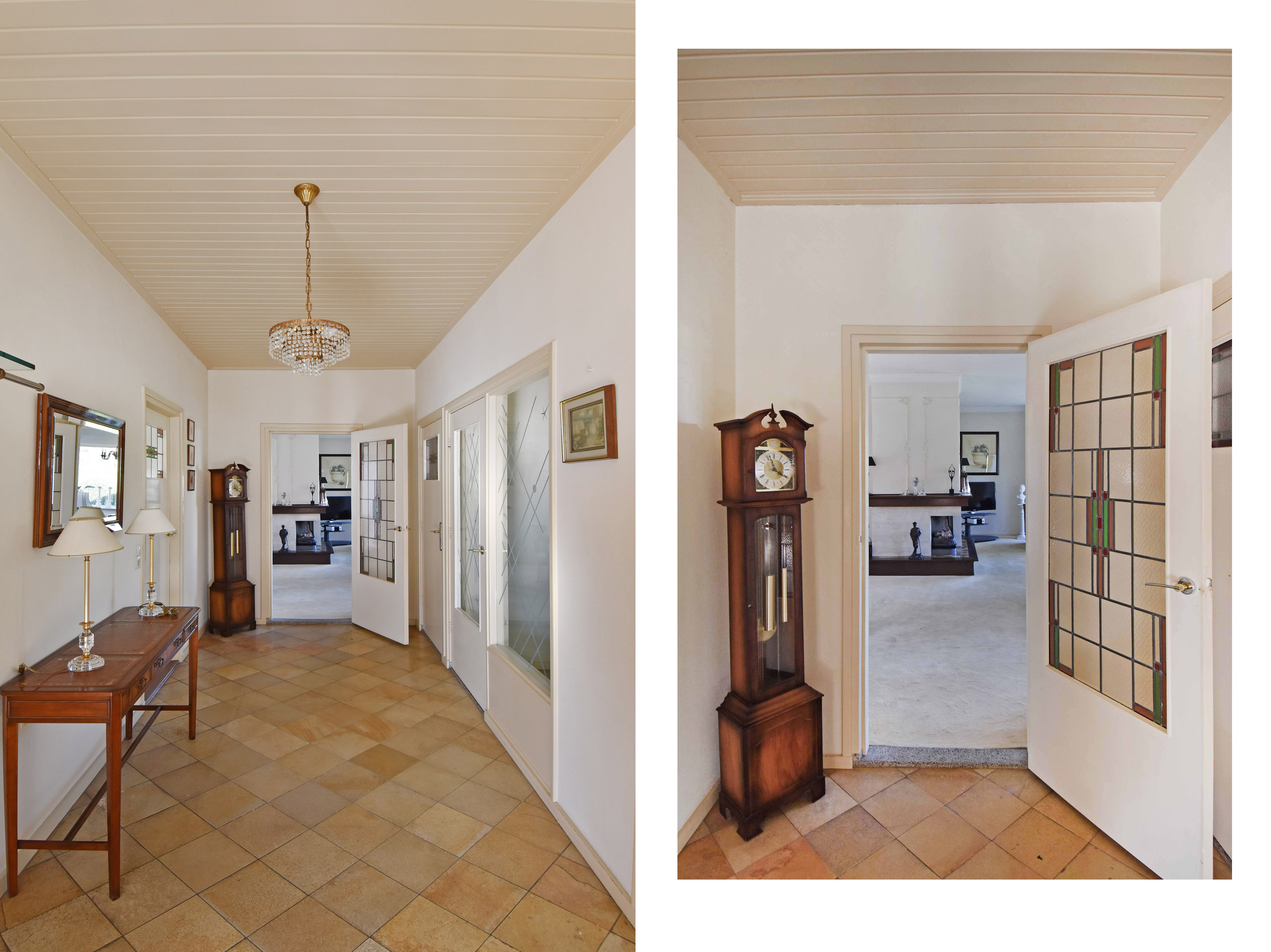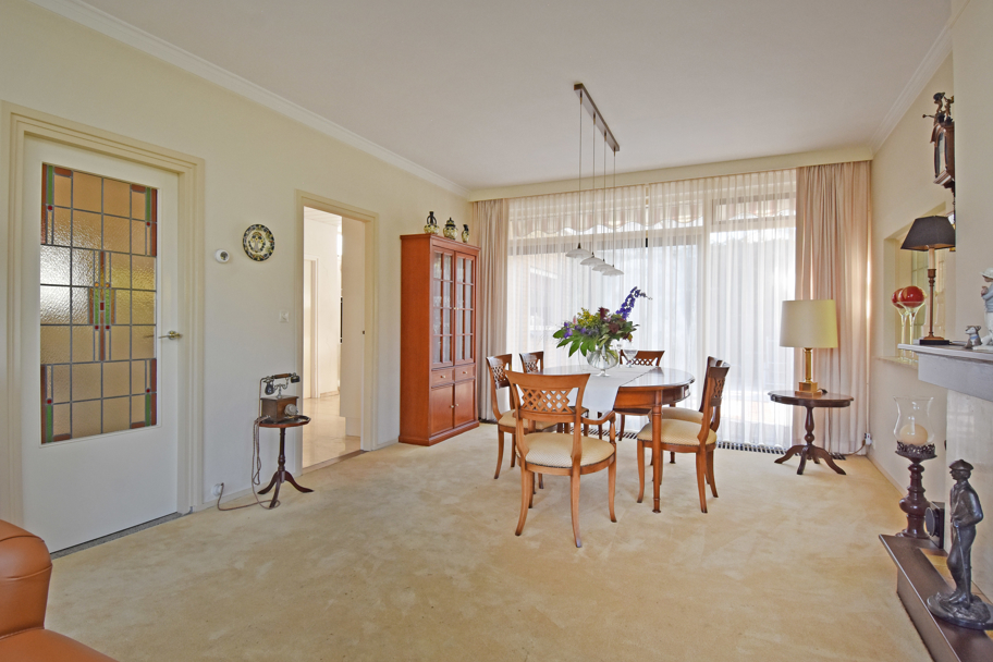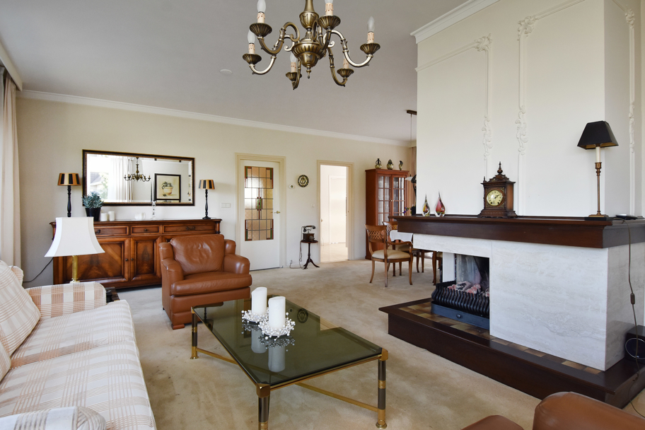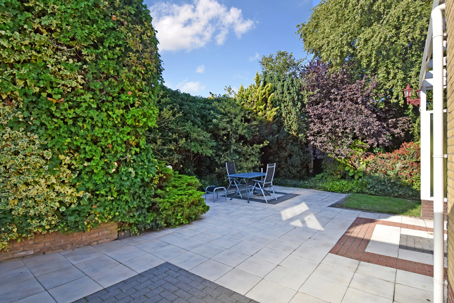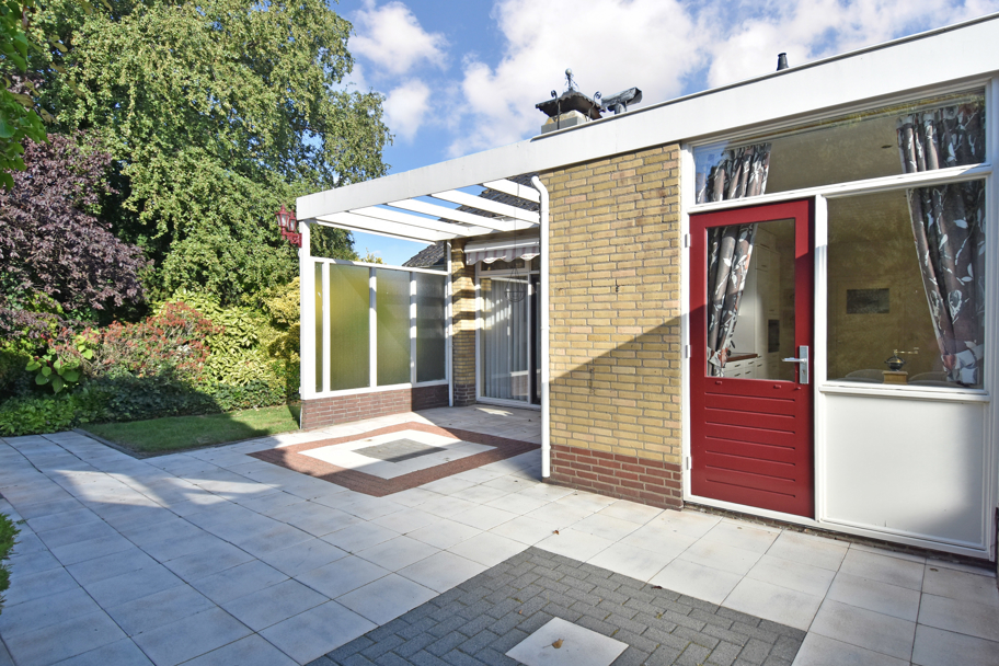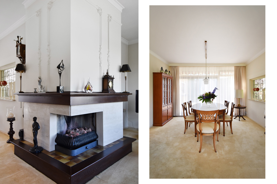 De hoofdentree aan de voorzijde ligt in het midden van de woning. U komt via een ruim voorportaal met de meterkast in de brede ruime hal. De hal geeft toegang tot alle kamers en ruimtes. Aan de rechterzijde ligt de lichte L-vormige ruime woonkamer met een sfeervolle (gas)haard en grote raampartijen. Aan de achterzijde tevens een brede schuifpui naar het terras om heerlijk in het zonnetje te zitten.