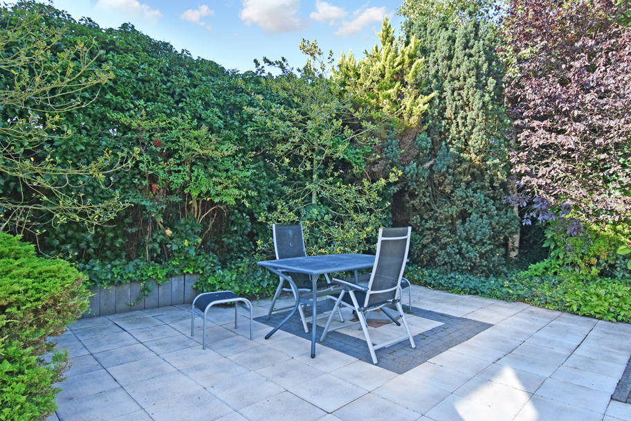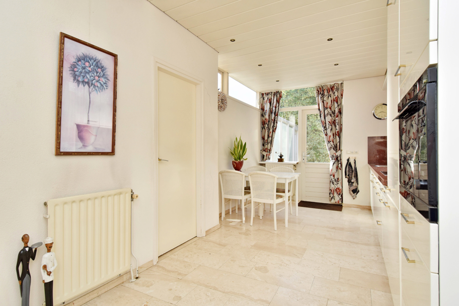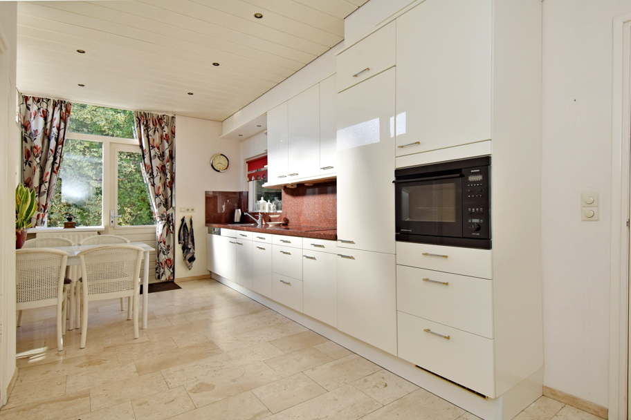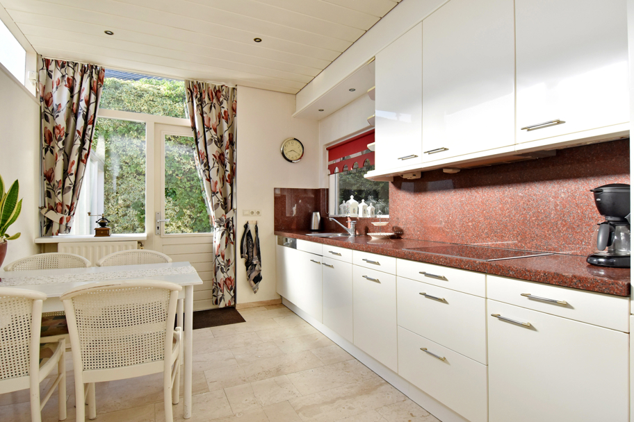 Aan de tuinzijde de meer dan ruime gesloten keuken met diepe vaste kast. De keuken is netjes, heeft veel berg- en werkruimte en diverse inbouwapparatuur zoals een koelkast, vriezer, magnetron, inductiekookplaat, afzuigkap en een vaatwasser. De bijkeuken is ook via de keuken bereikbaar. Hier vindt u de aansluiting voor de wasmachine en eventueel voor de droger en tevens het luik naar de zolder.