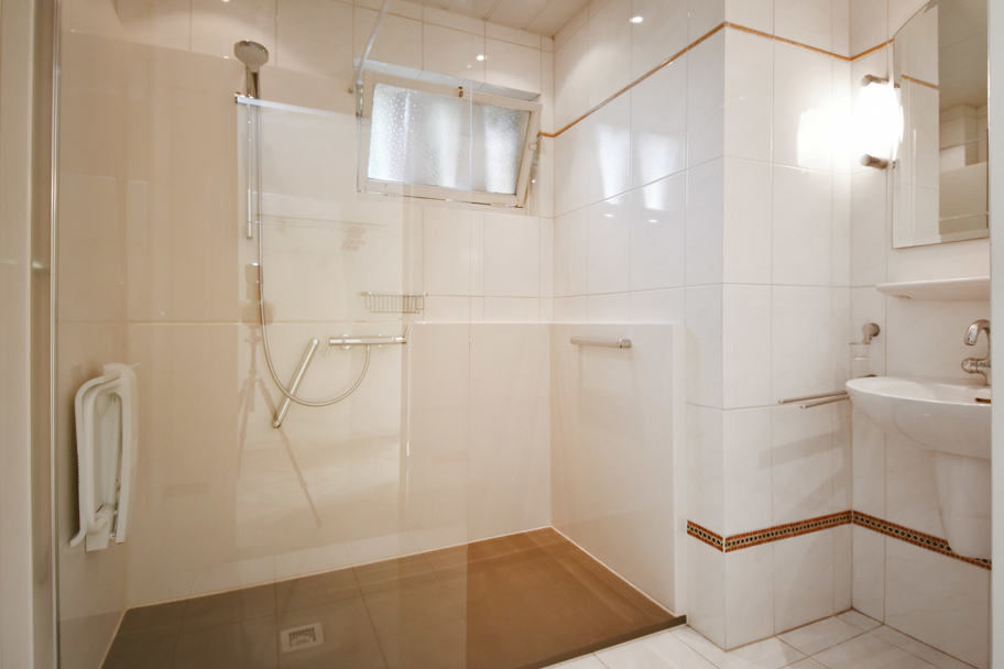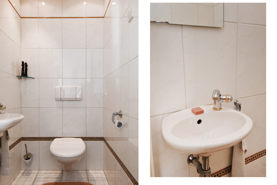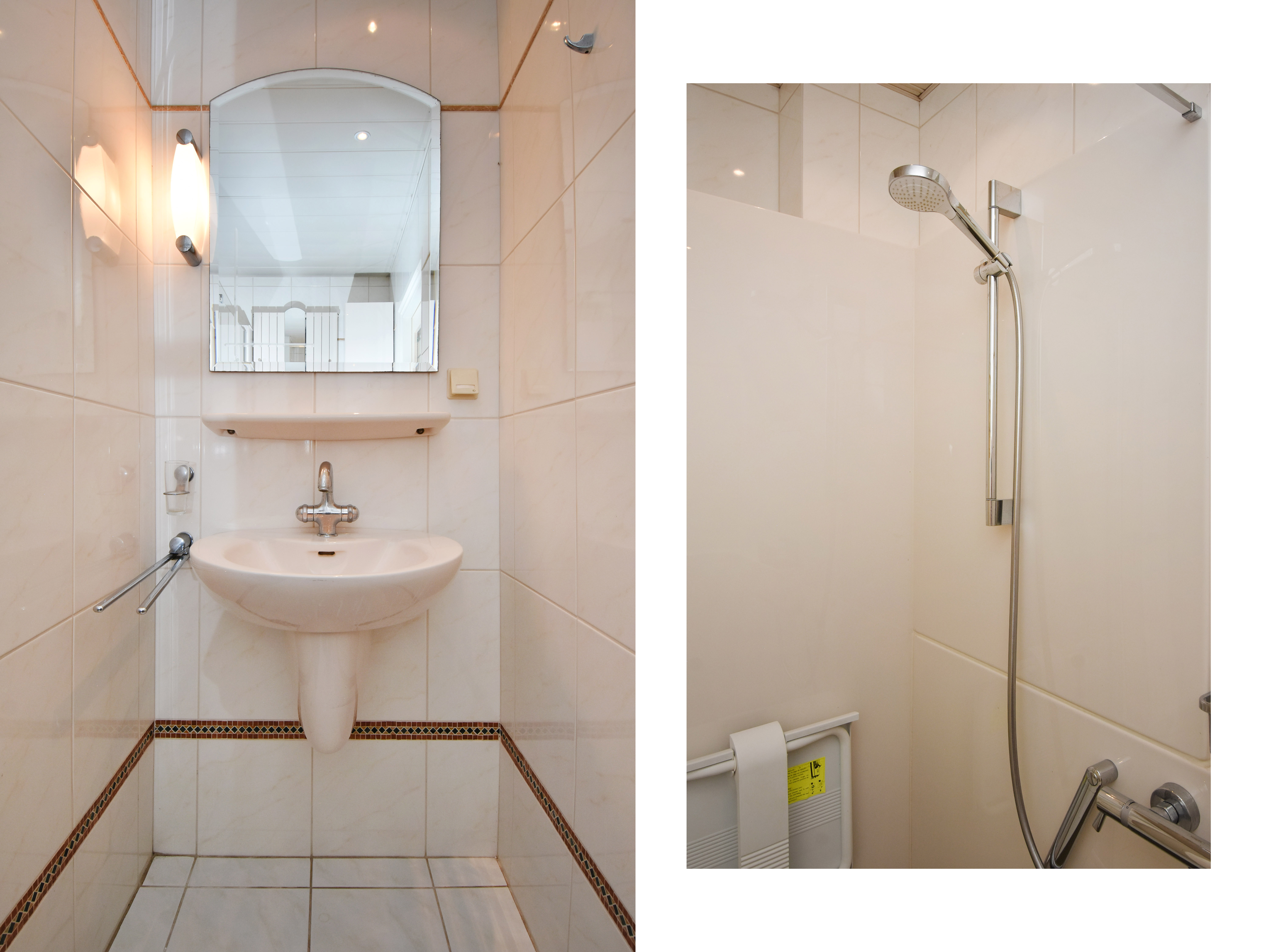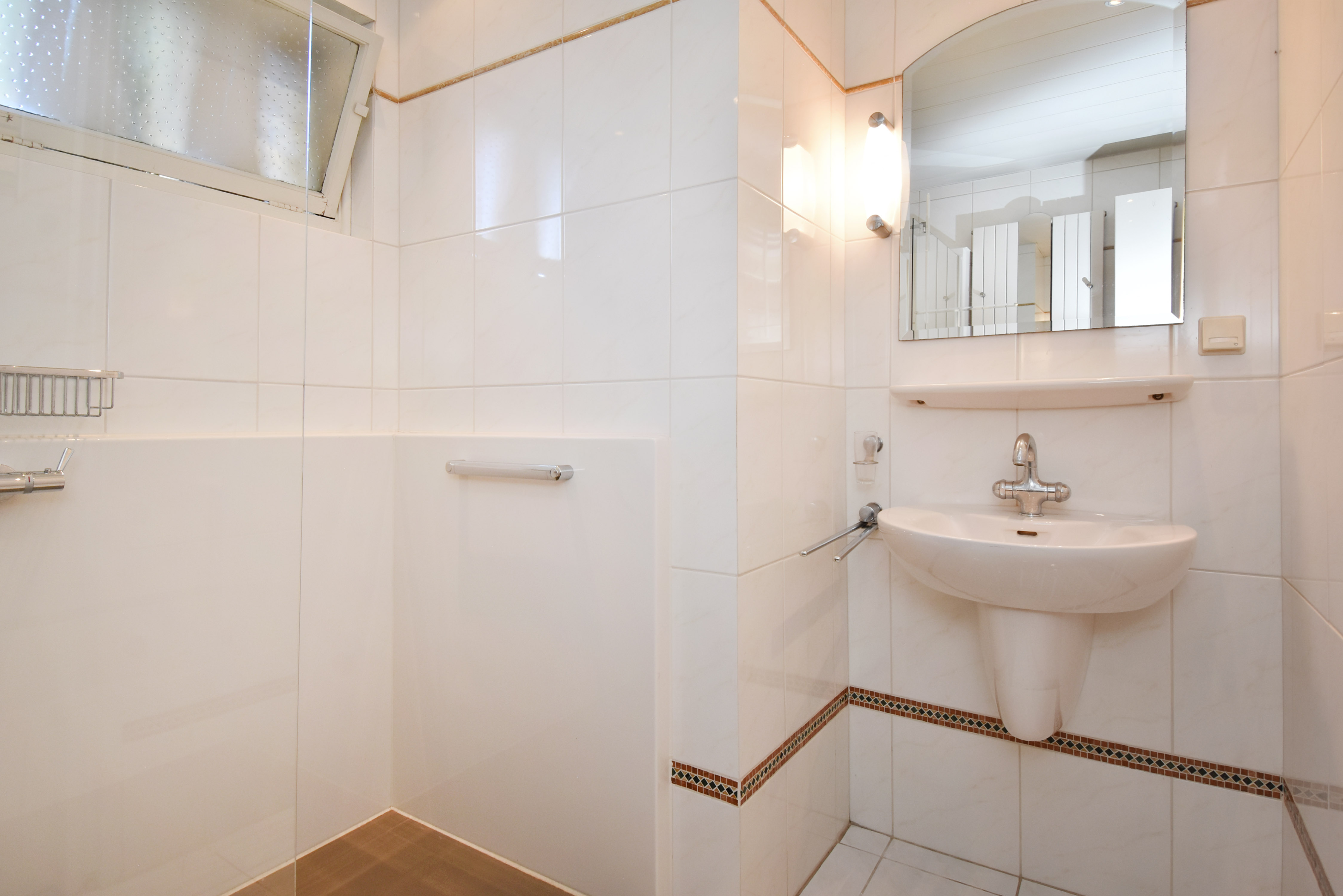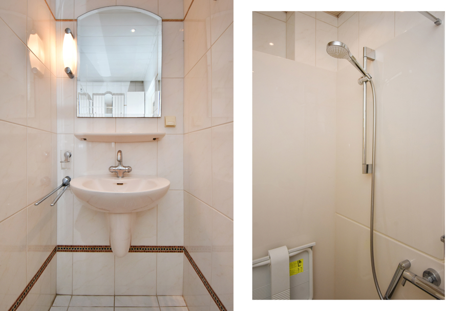 Naast de entree treft u de ruime badkamer en het separate toilet met fonteintje. De ruime badkamer is geheel betegeld en circa 5 jaar geleden vernieuwd en uitgevoerd met een inloopdouche, vaste wastafel en elektrische vloerverwarming.