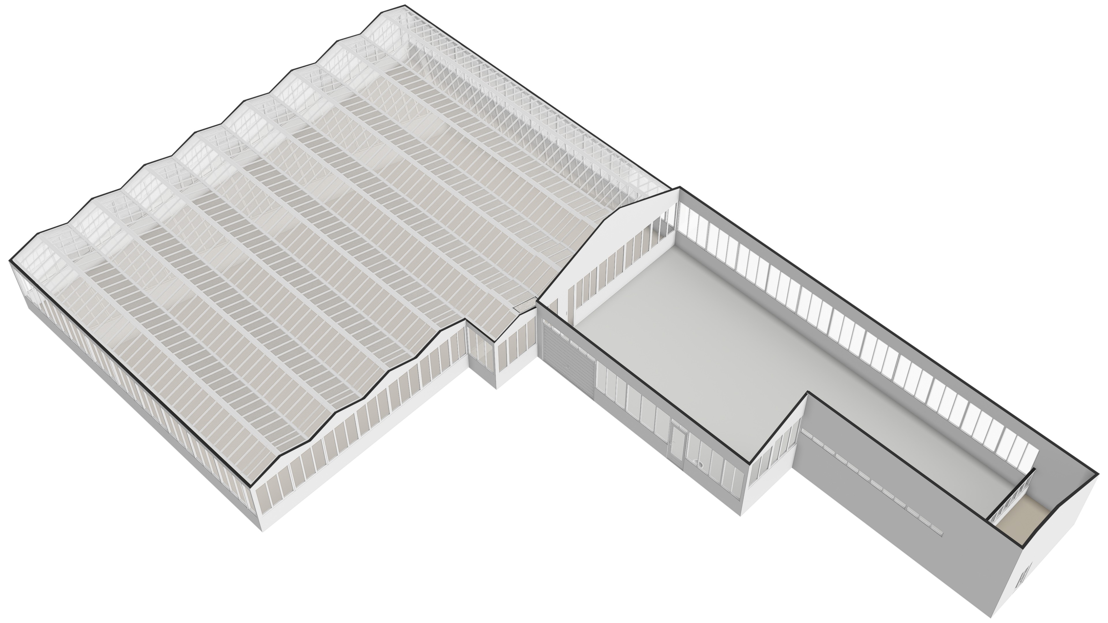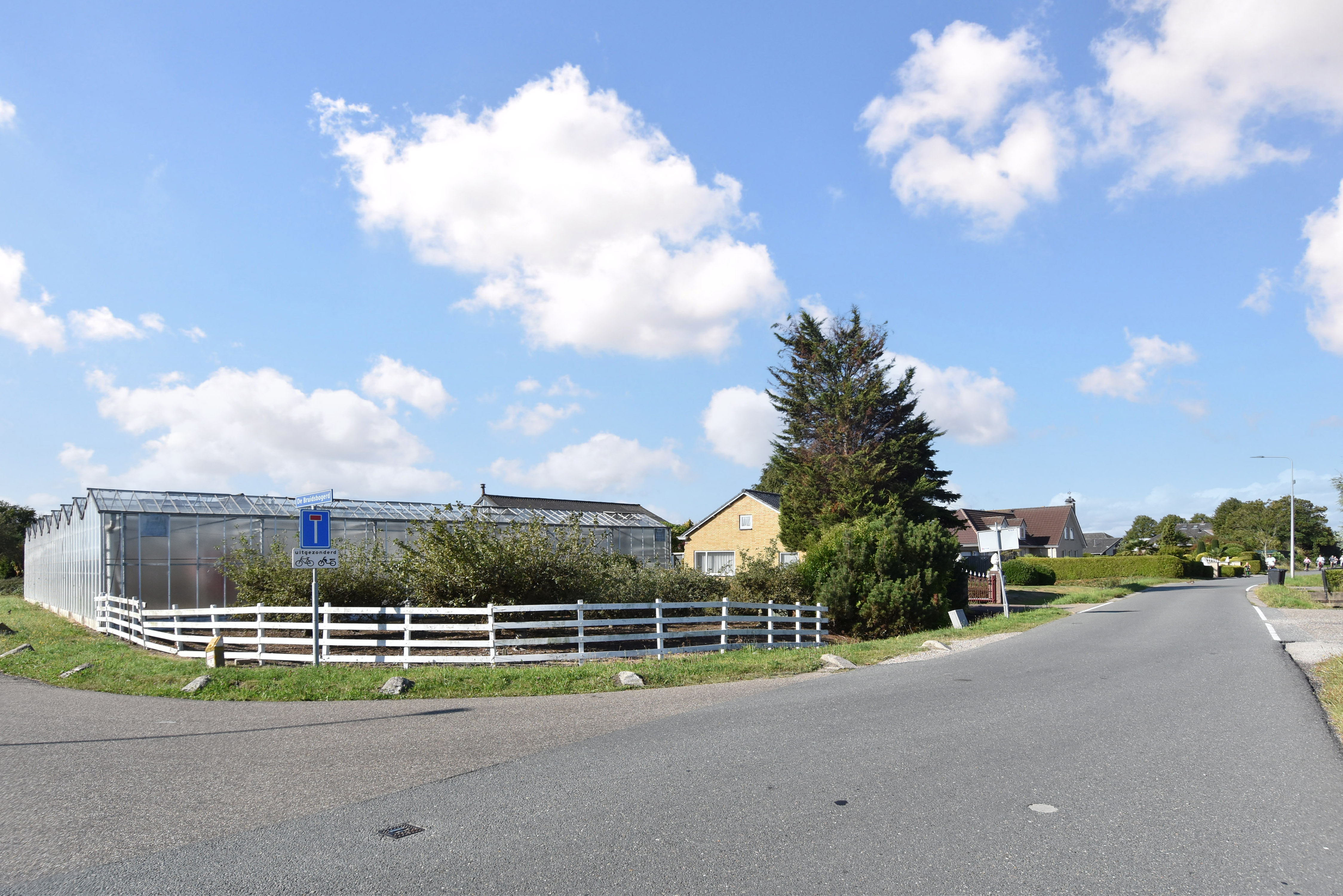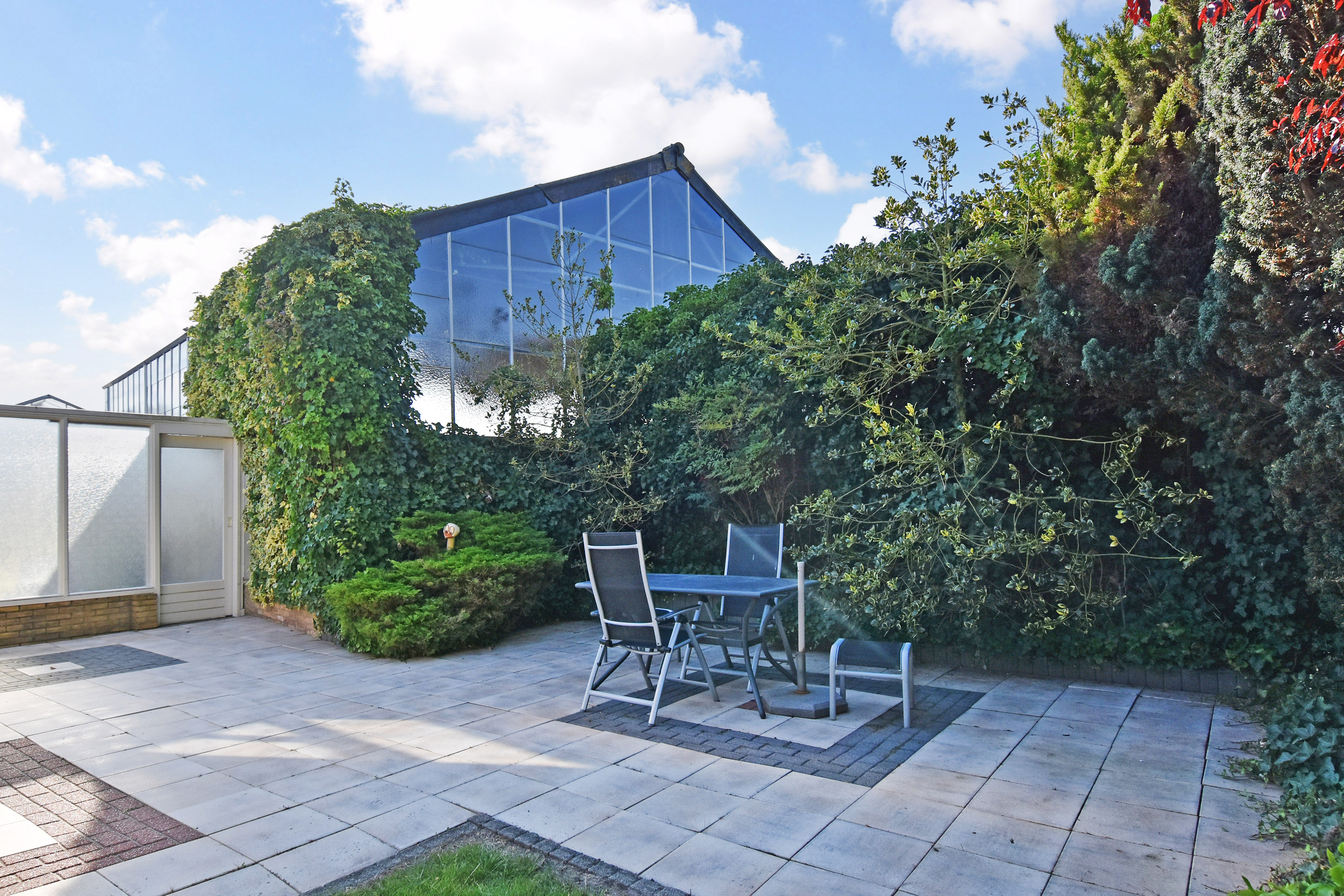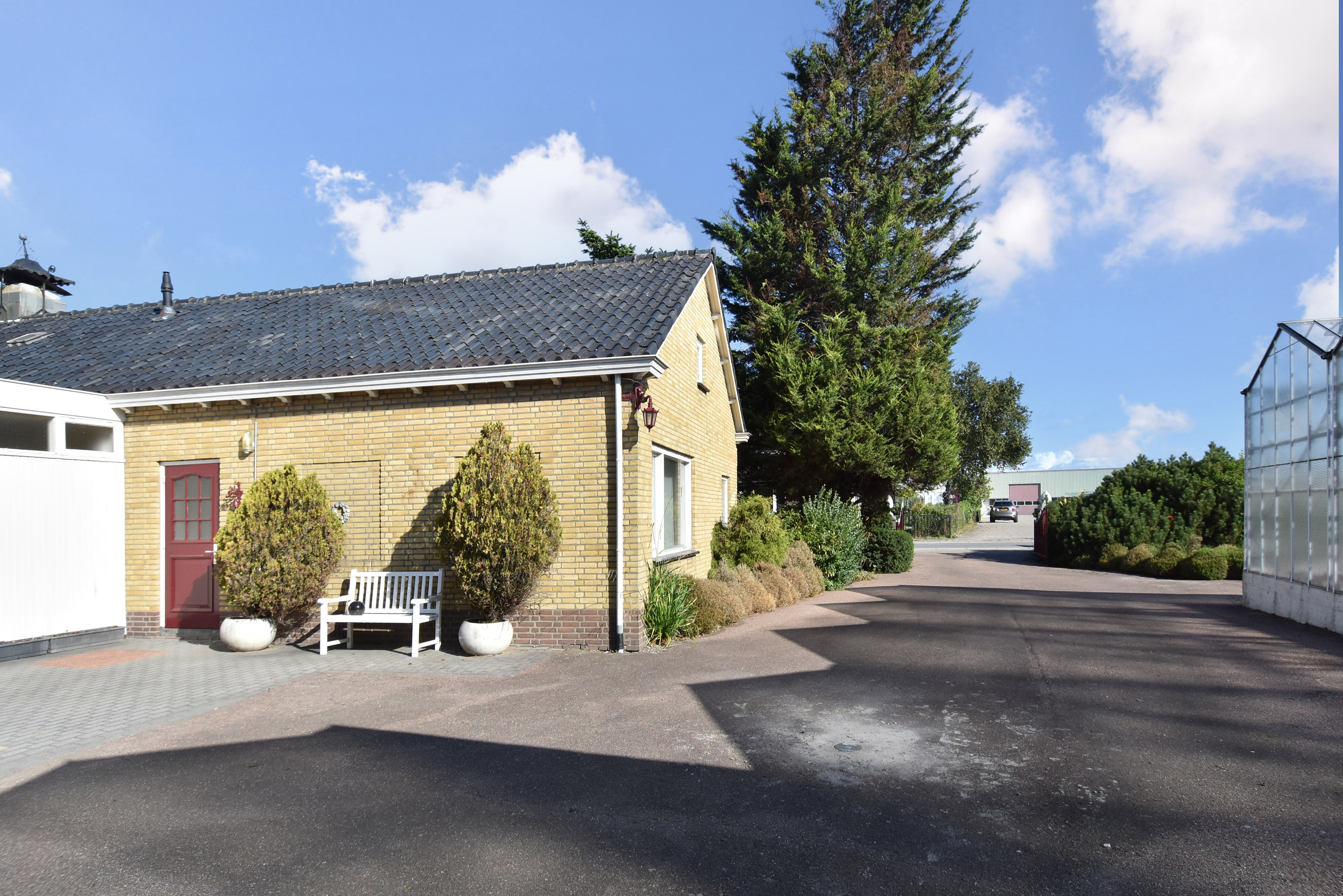 Door middel van een hoge schuifdeur en een loopdeur bereikt u via de schuur de tevens grote kas. Hier is genoeg ruimte is om uw eigen bloemen, fruit en/of groenten te telen. Voor de kas, ligt een groot stuk grond met daarop fruitbomen.