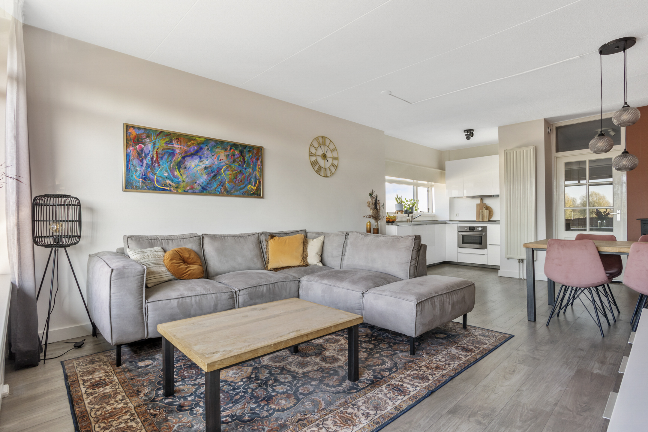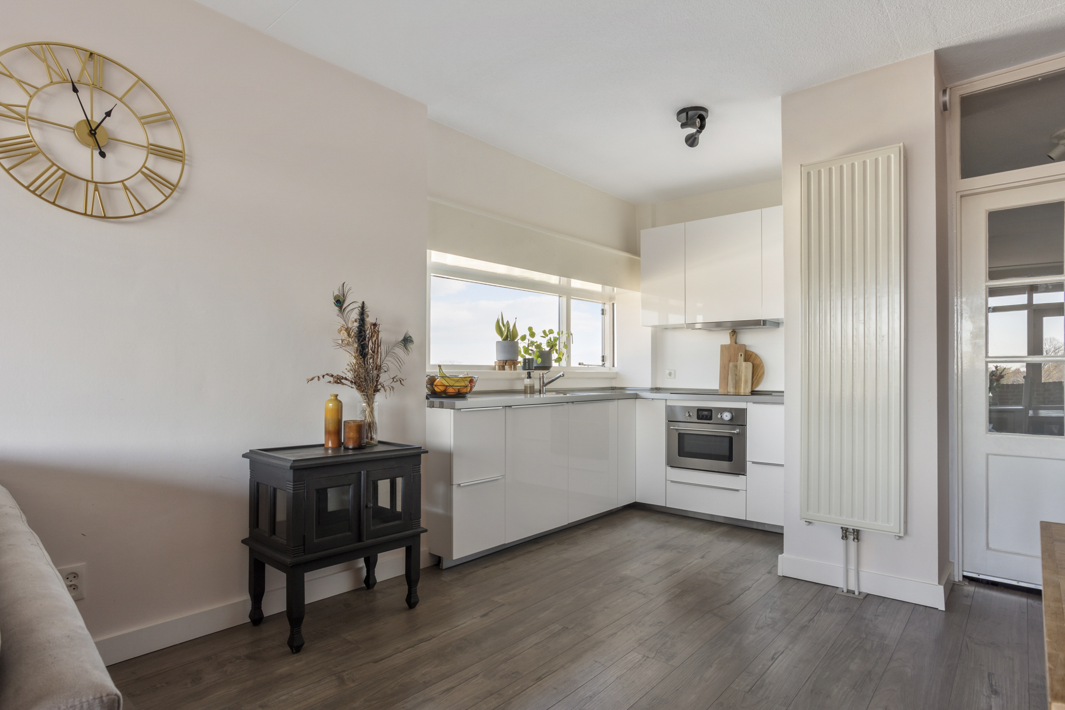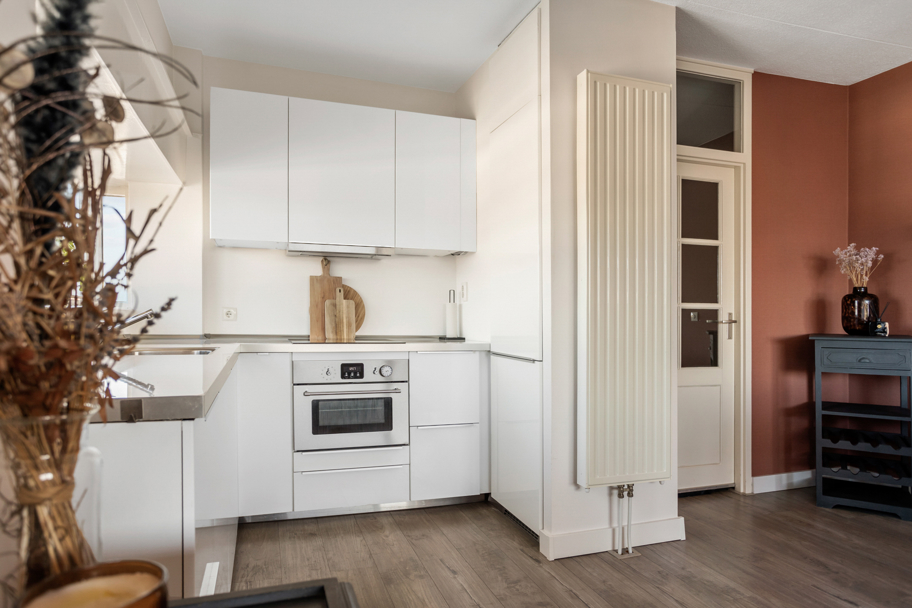 De lichte en ruime woonkamer heeft een open, witte U-vormige keuken met breed zijraam en is voorzien van diverse inbouwapparatuur zoals een koel/vriescombinatie, keramische kookplaat, recirculatiekap, vaatwasser en combi- magnetron.