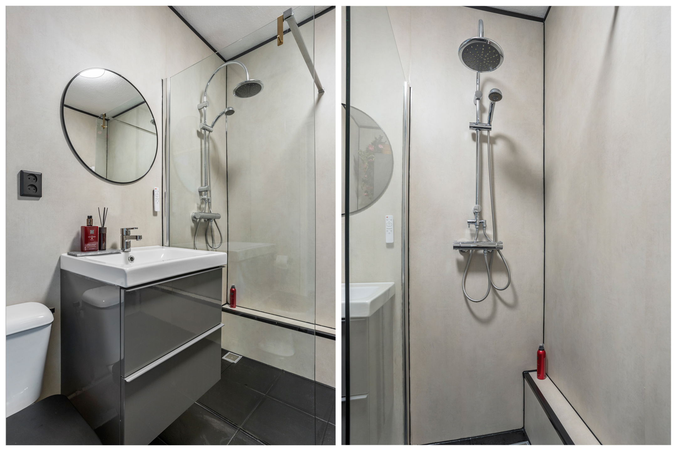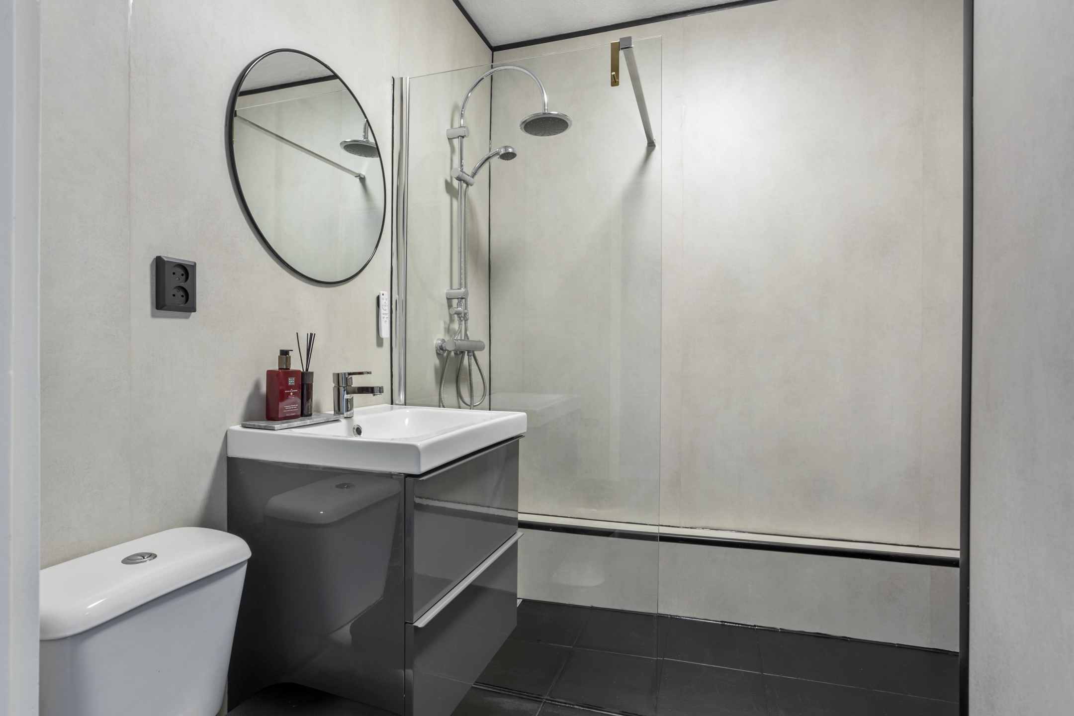 De badkamer is modern, afgewerkt met lichte wandplaten en donkere vloertegels en ingedeeld met een inloopdouche, badkamermeubel met lades en een toilet.