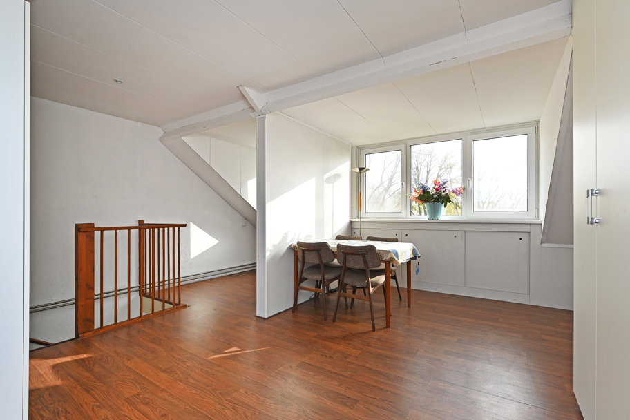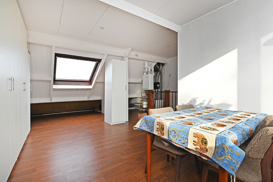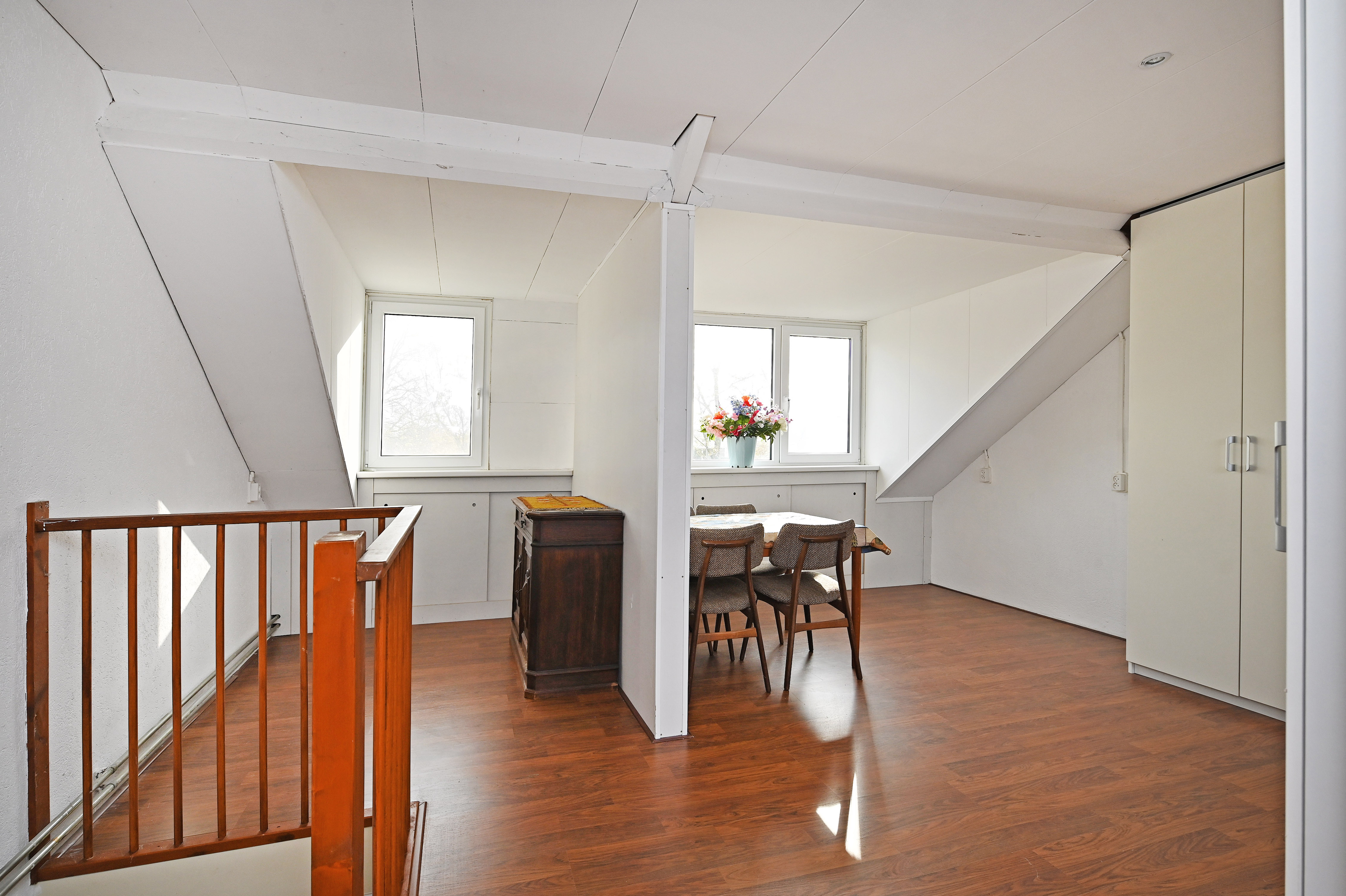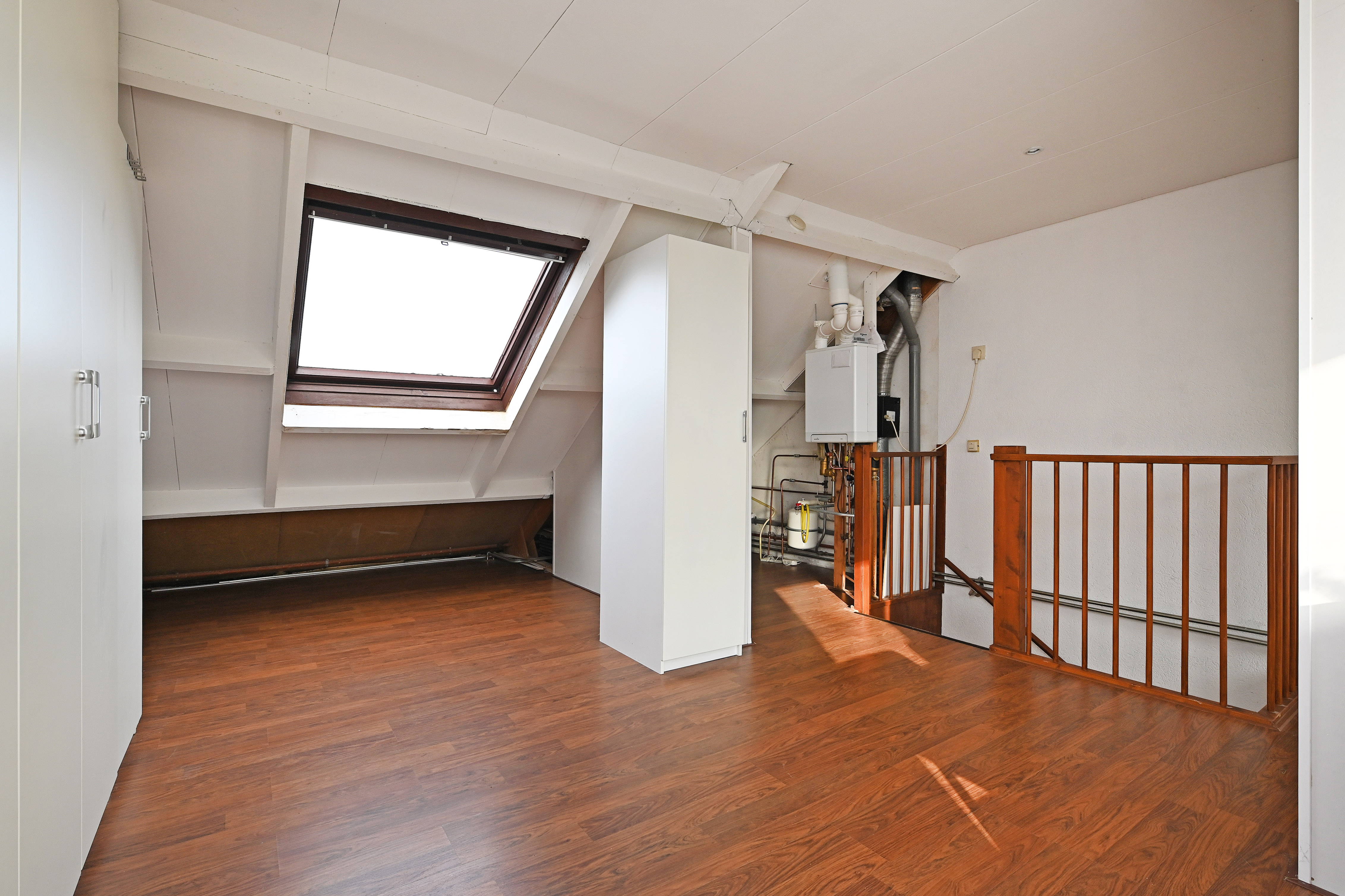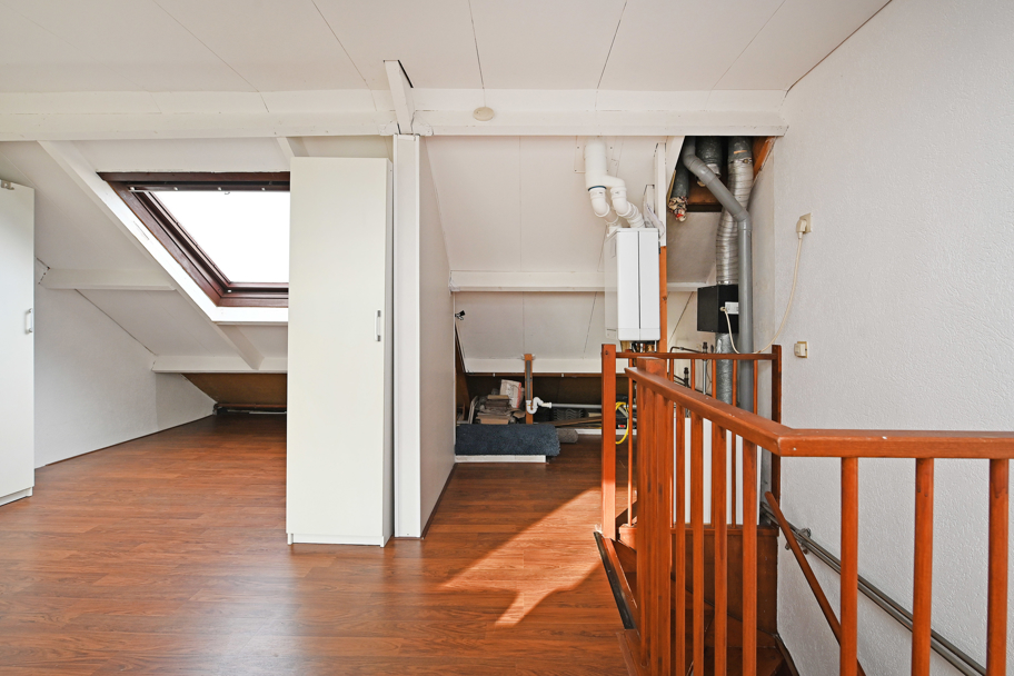 De verdieping is zeer royaal, heeft aan de voorzijde een groot dakraam en aan de achterzijde een brede dakkapel die ook is voorzien van een hor en rolluik. Door 2 halve wandjes, is het was- en stookgedeelte semi-afgescheiden waardoor je deze verdieping prima kan gebruiken als werk-hobby kamer. Ook bestaat de mogelijkheid om hier relatief eenvoudig 2 goede (slaap)kamers te realiseren.