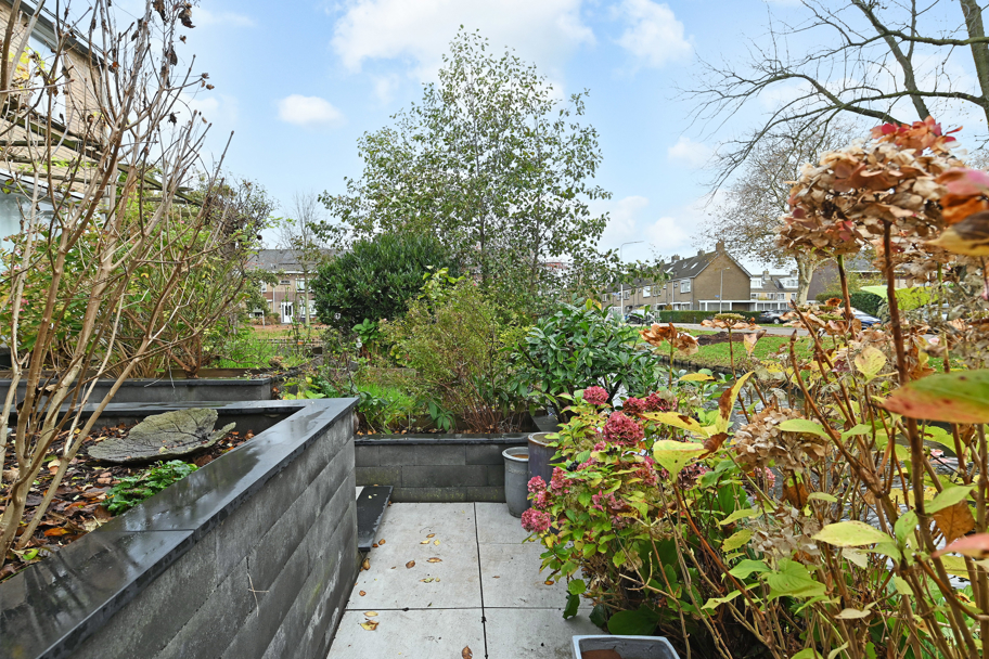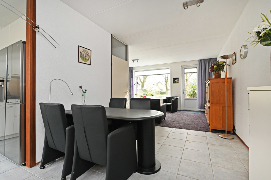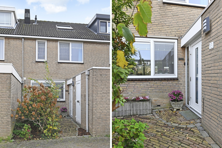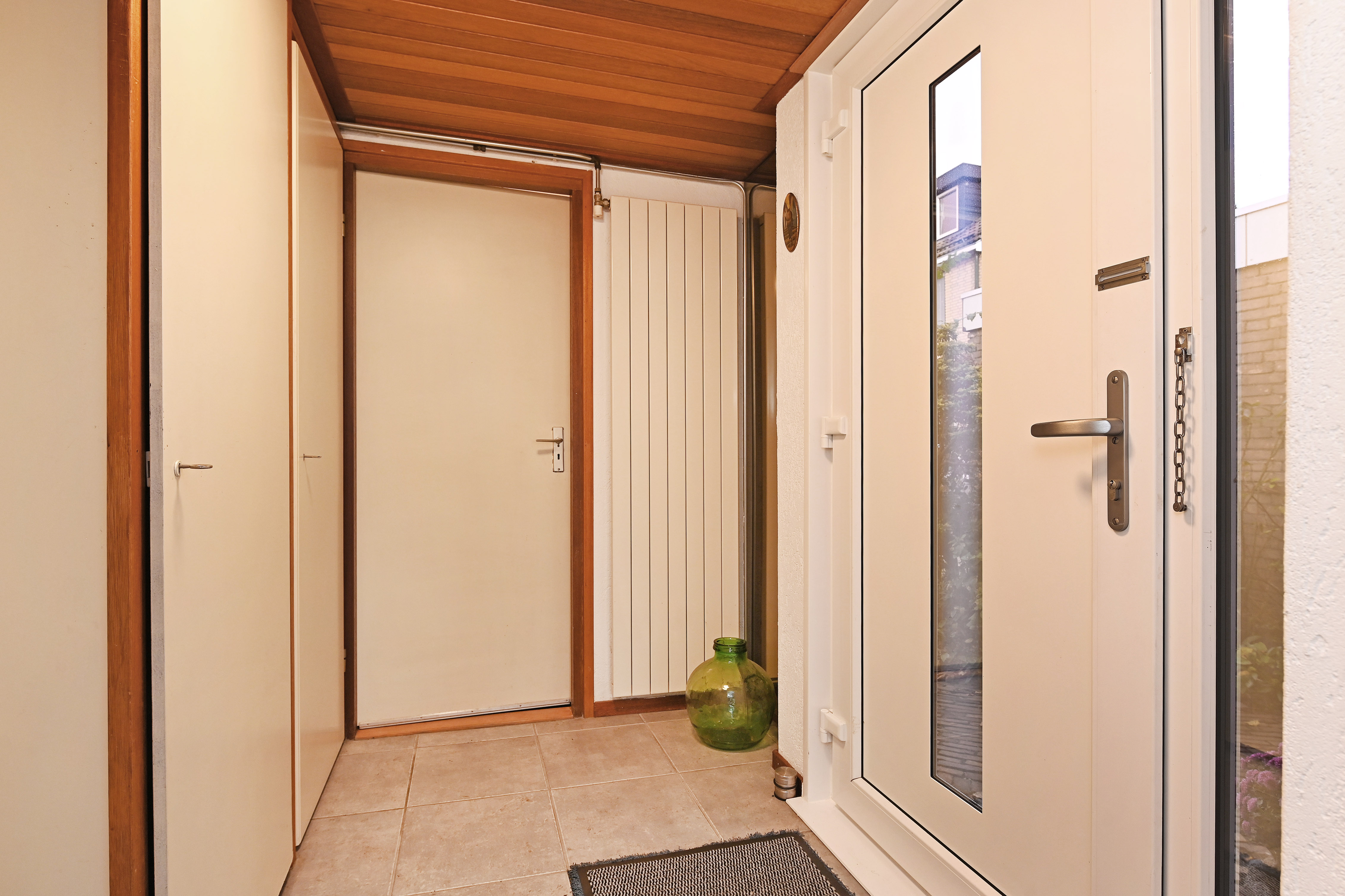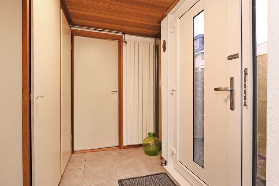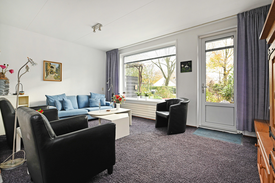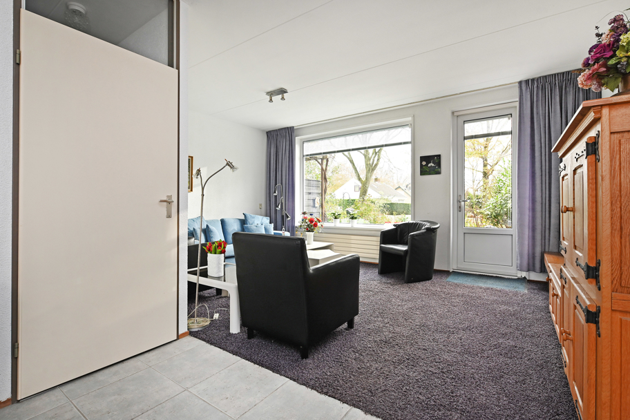 Voortuin met stenen aangebouwde berging en daarnaast de entree van de woning. Bij binnenkomst geeft de hal direct toegang tot de berging, maar ook tot de ruime en lichte woonkamer.