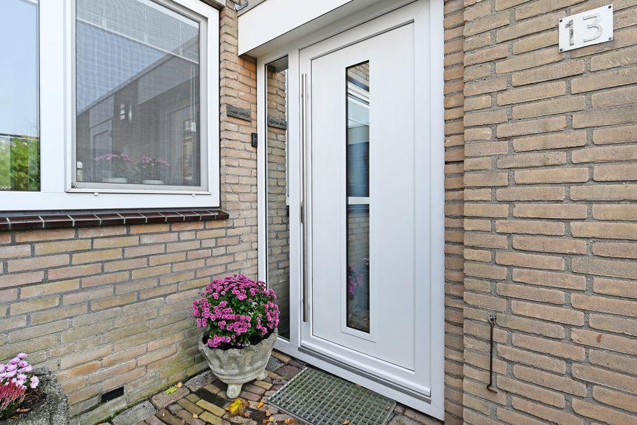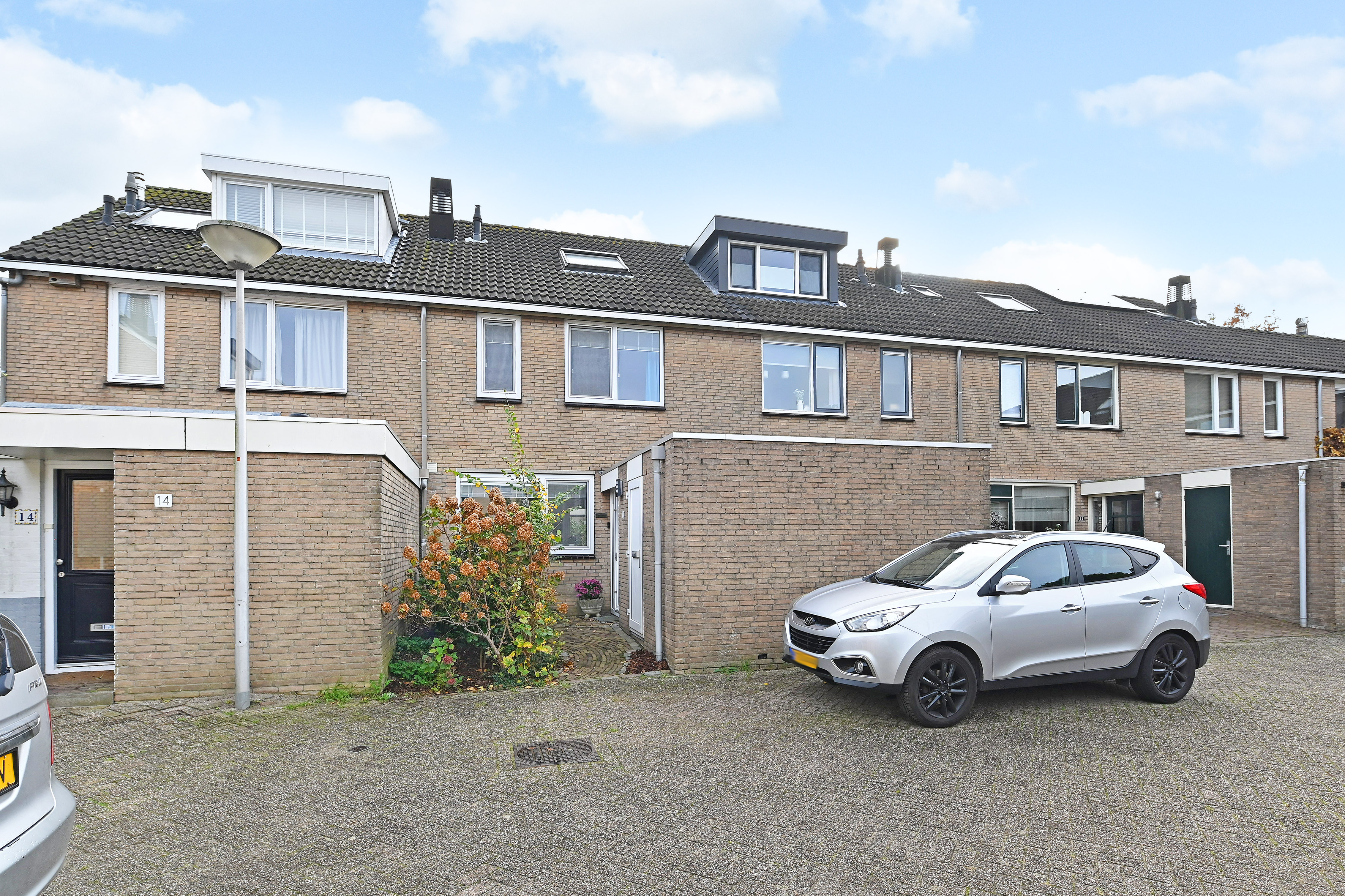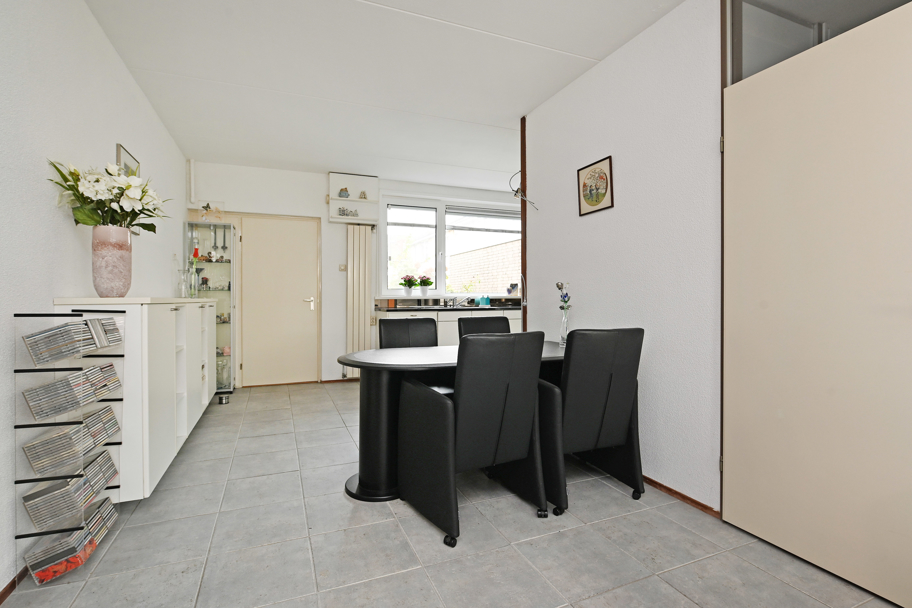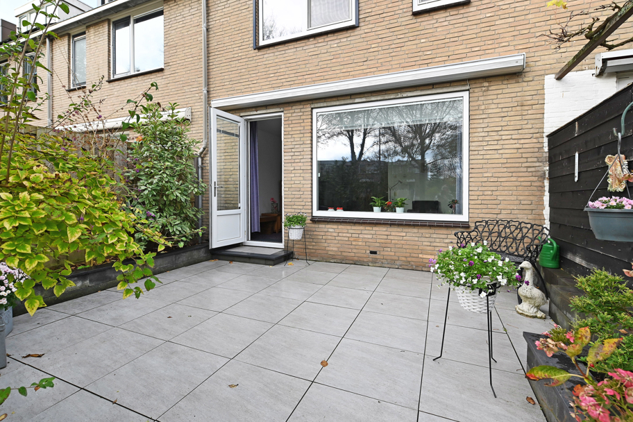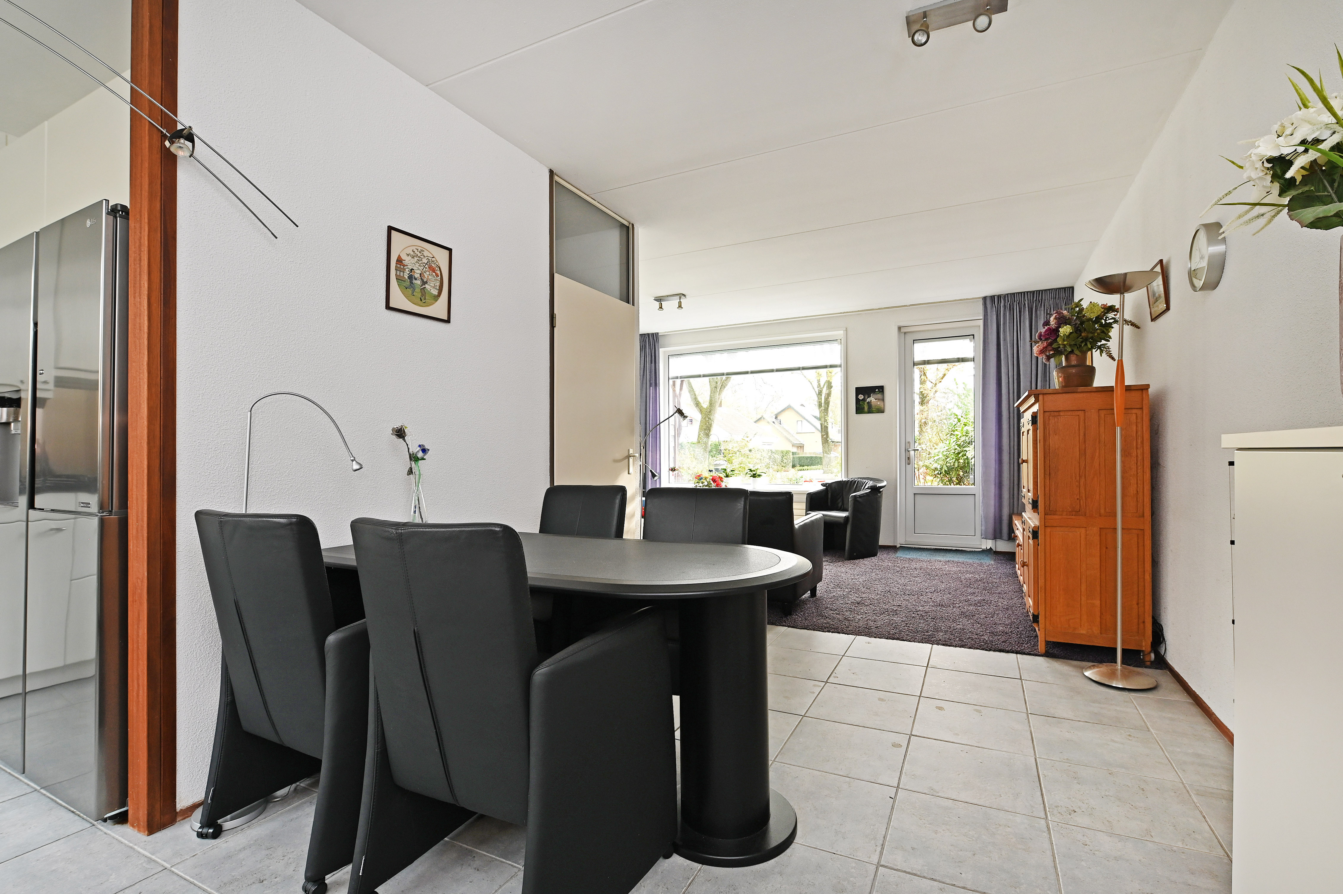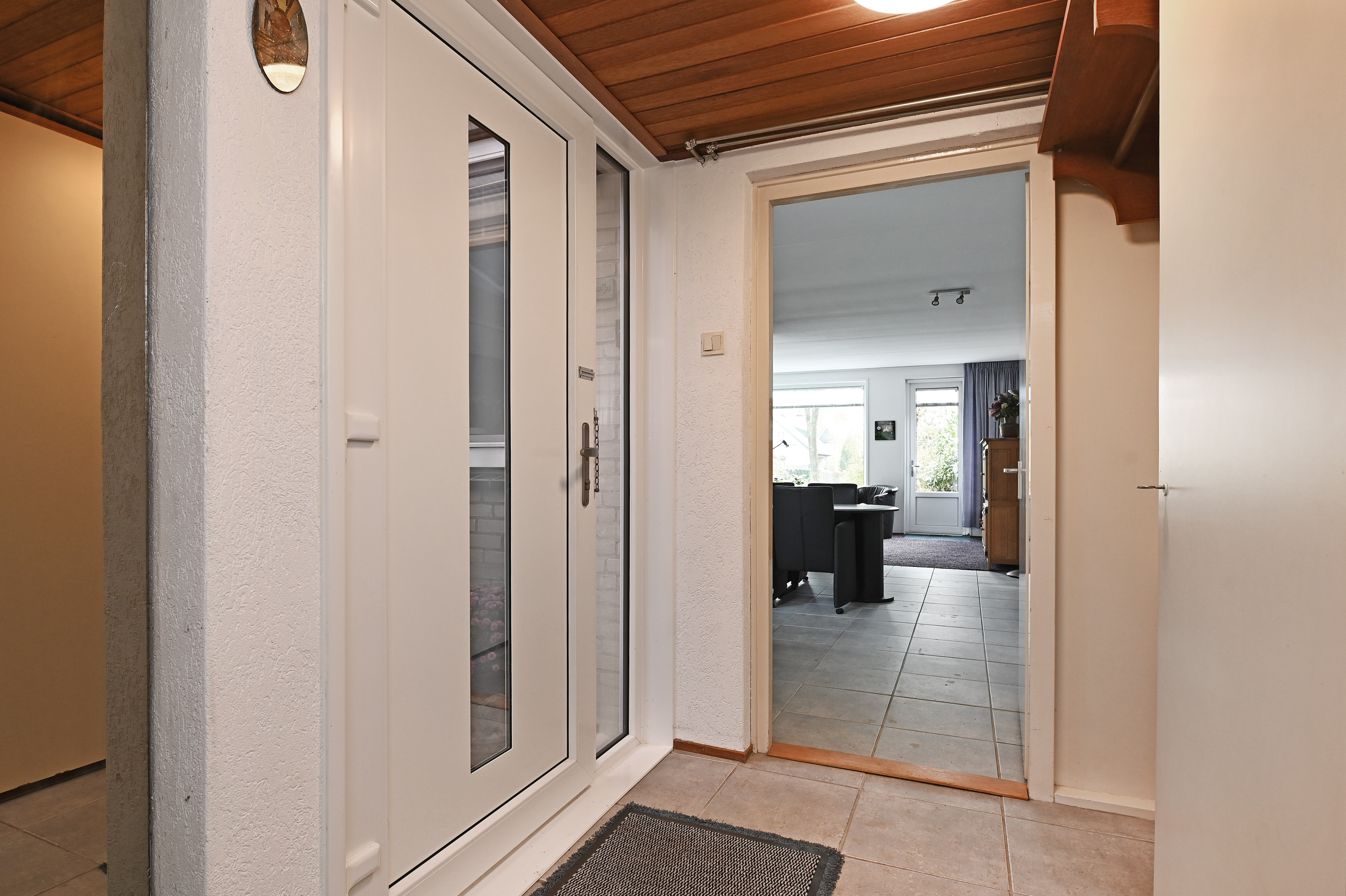 Voortuin met stenen aangebouwde berging en daarnaast de entree van de woning. Bij binnenkomst geeft de hal direct toegang tot de berging, maar ook tot de ruime en lichte woonkamer.