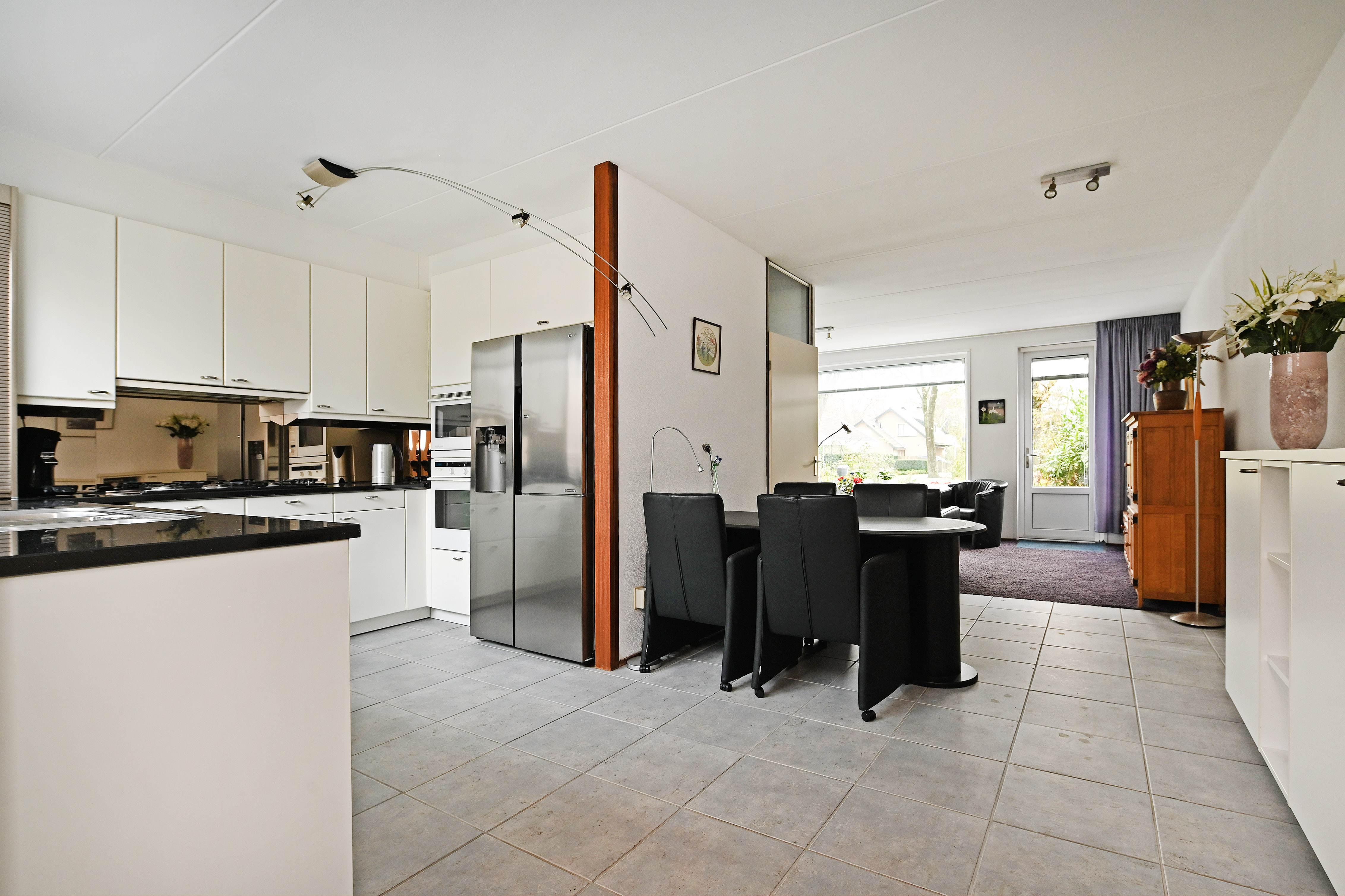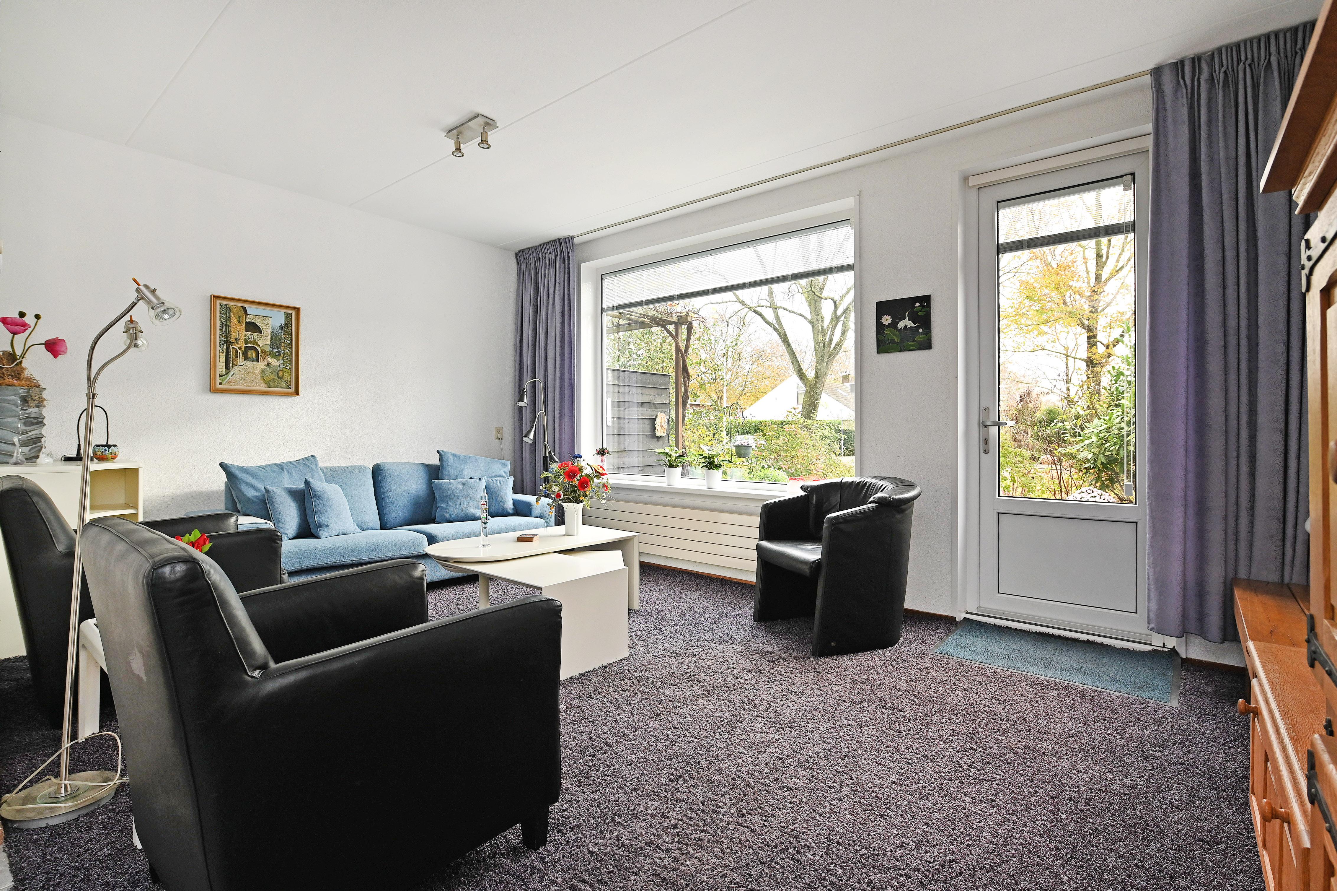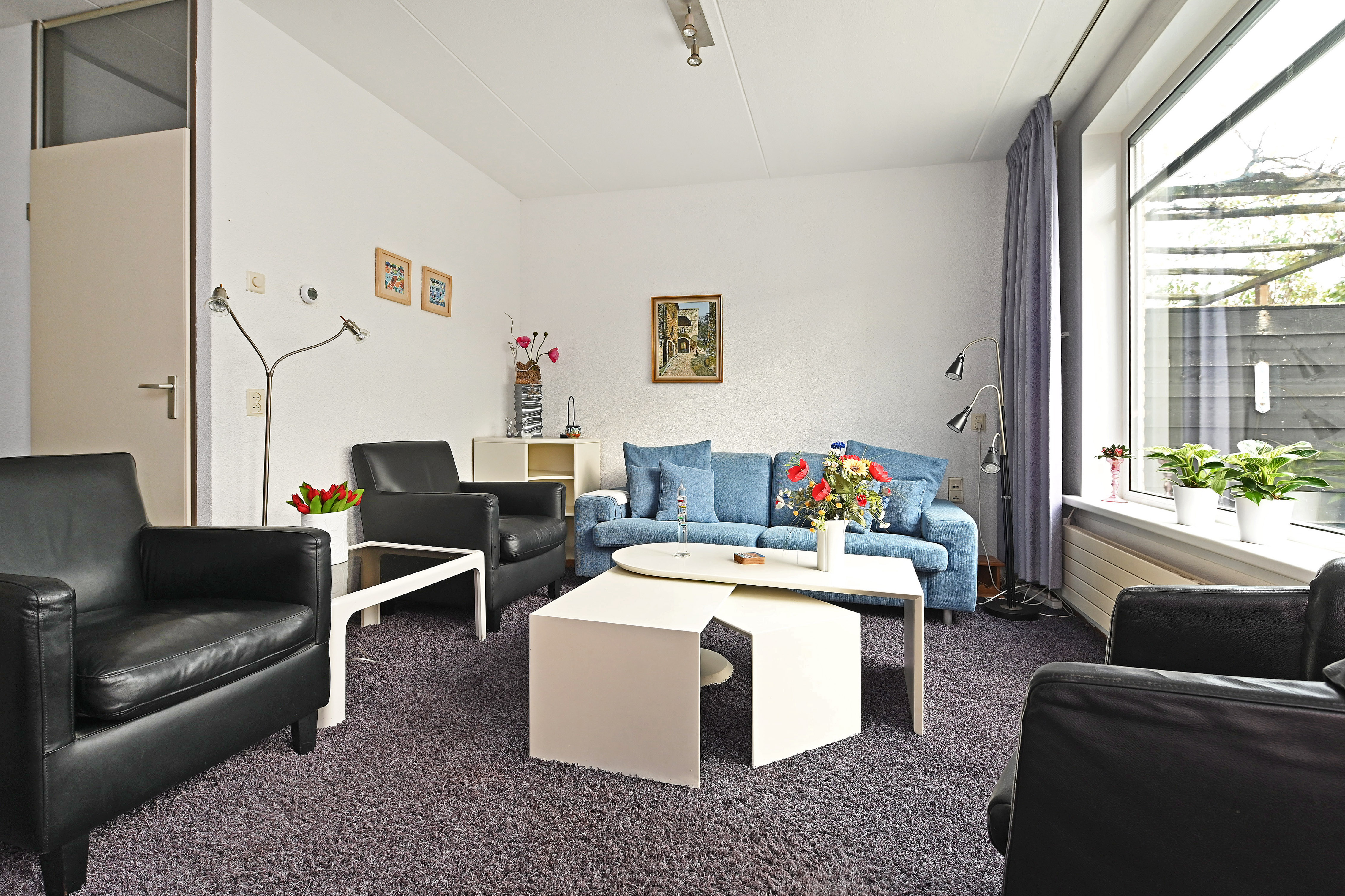 De zithoek is over de gehele breedte van de woonkamer met een groot raamkozijn en een deur naar de tuin. Een heerlijke plek om te vertoeven en van het uitzicht op de tuin te genieten.