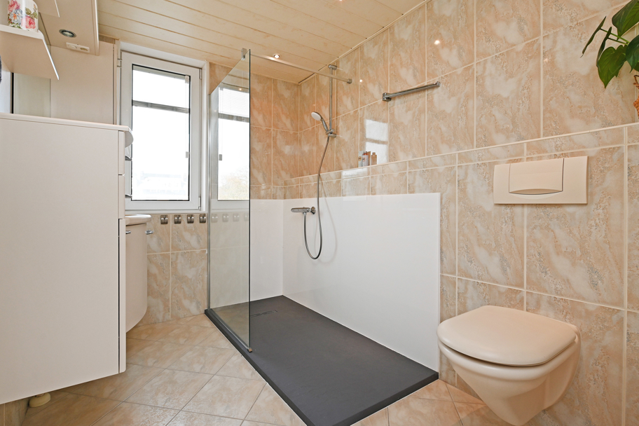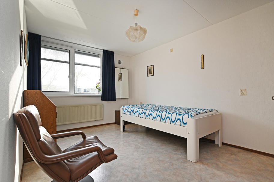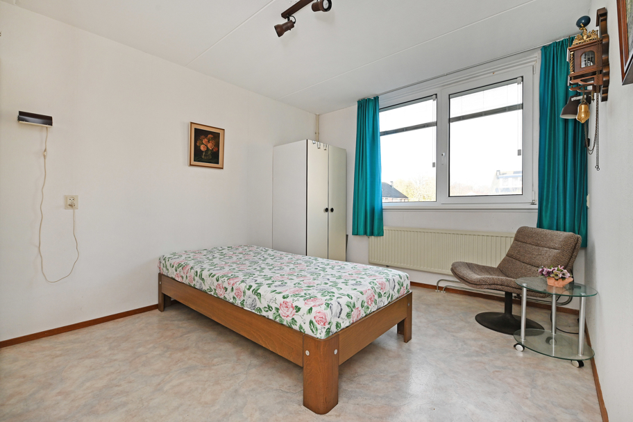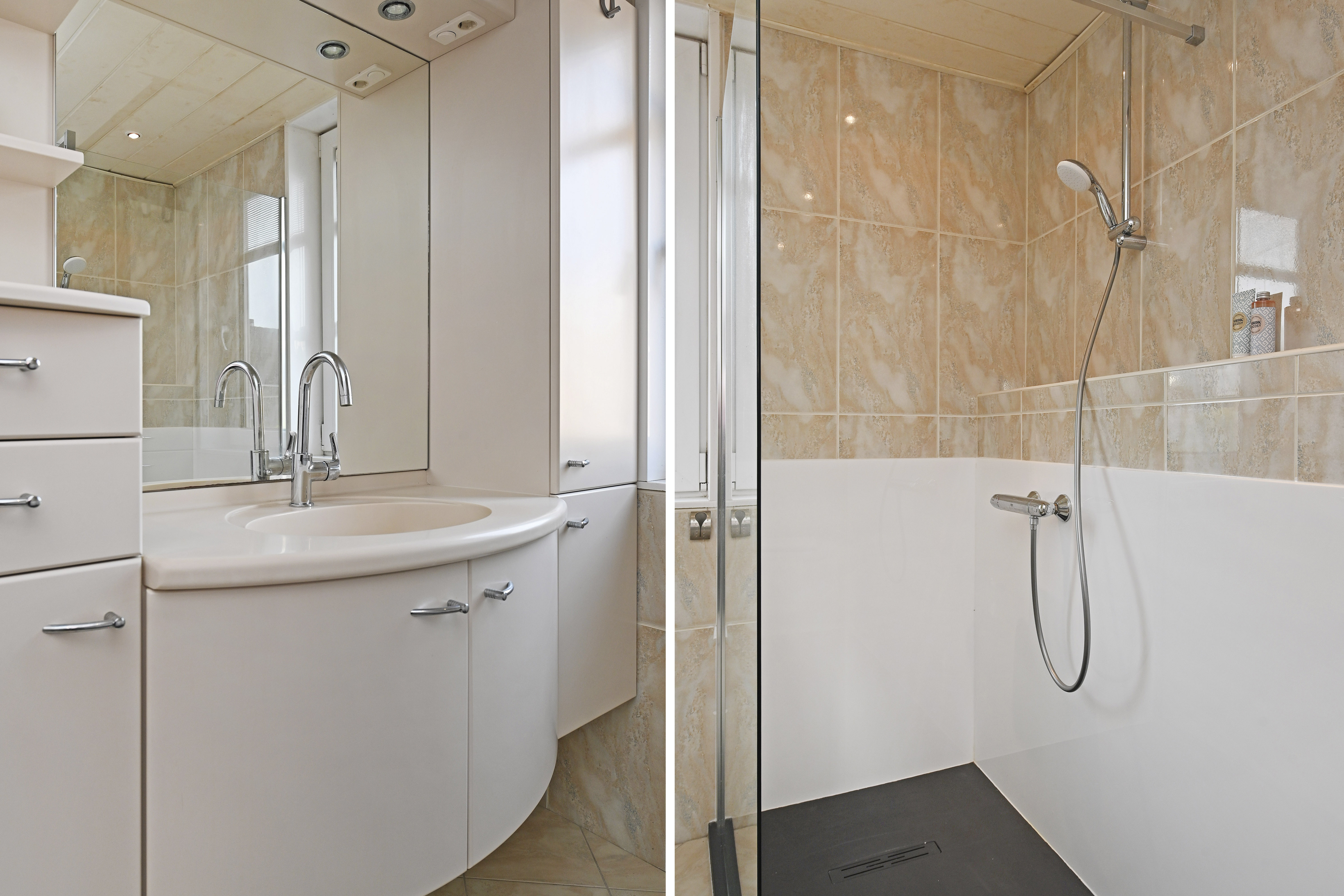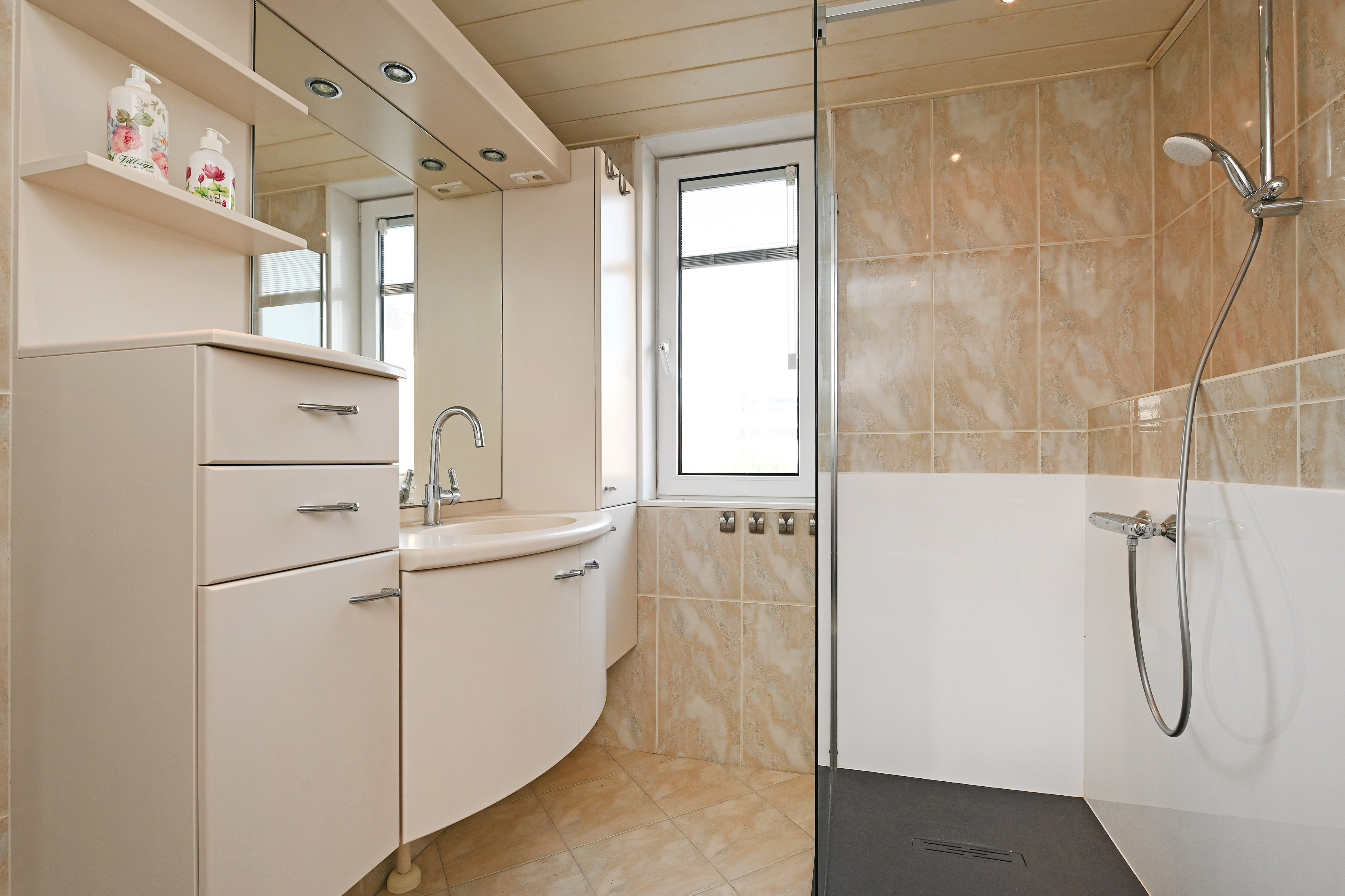 De overloop geeft toegang tot 2 ruime slaapkamers aan de achterzijde, beide kamers voorzien van horren en rolluiken en de 3e slaapkamer aan de voorzijde welke tevens is voorzien van een hor. Ook de badkamer is aan de voorzijde gelegen, deze is geheel betegeld en ingedeeld met een grote inloopdouche, toilet en badkamermeubel met vaste wastafel en lades.