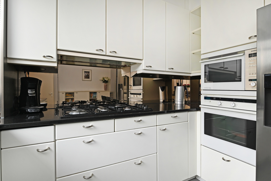 De keuken heeft vloerverwarming, kijkt uit op de voortuin, is in witte kleurstelling met een granieten aanrechtblad en voorzien van diverse inbouwapparatuur zoals een koel-/vriescombinatie, 5-pits gaskookplaat, afzuigkap, vaatwasser, magnetron en oven.