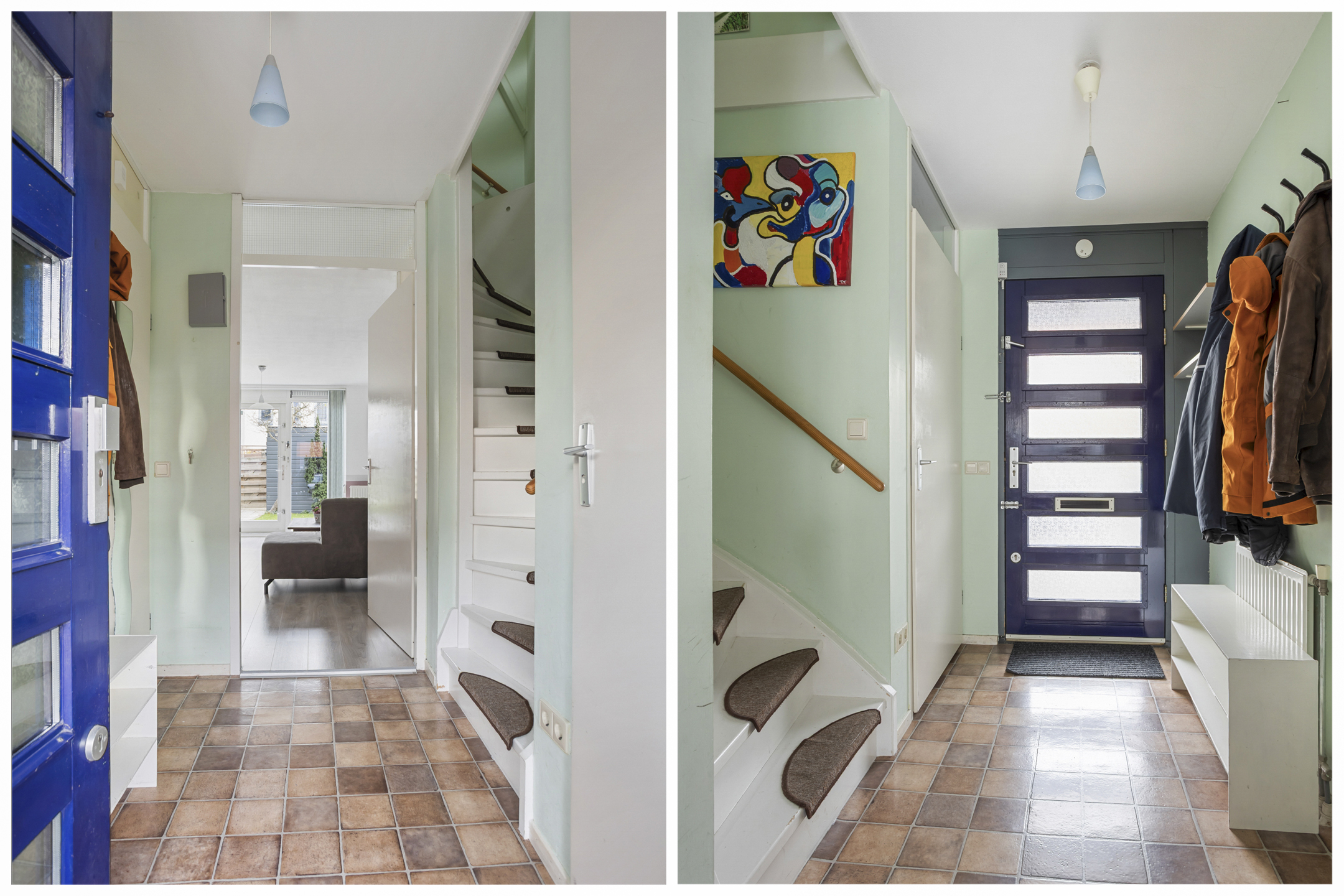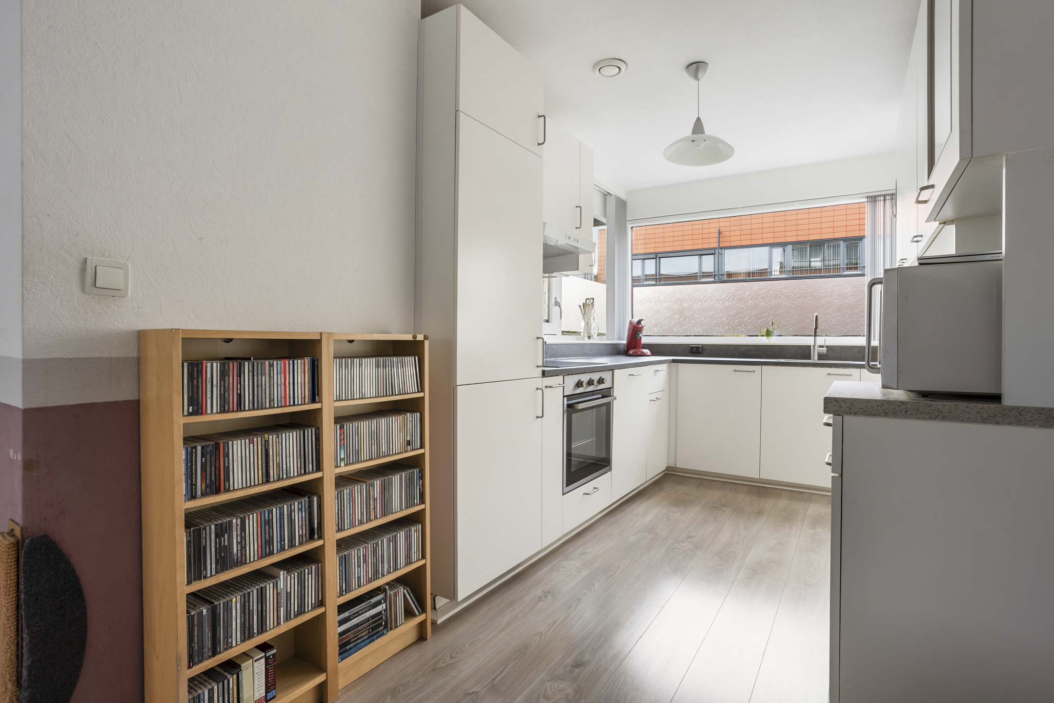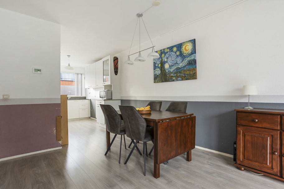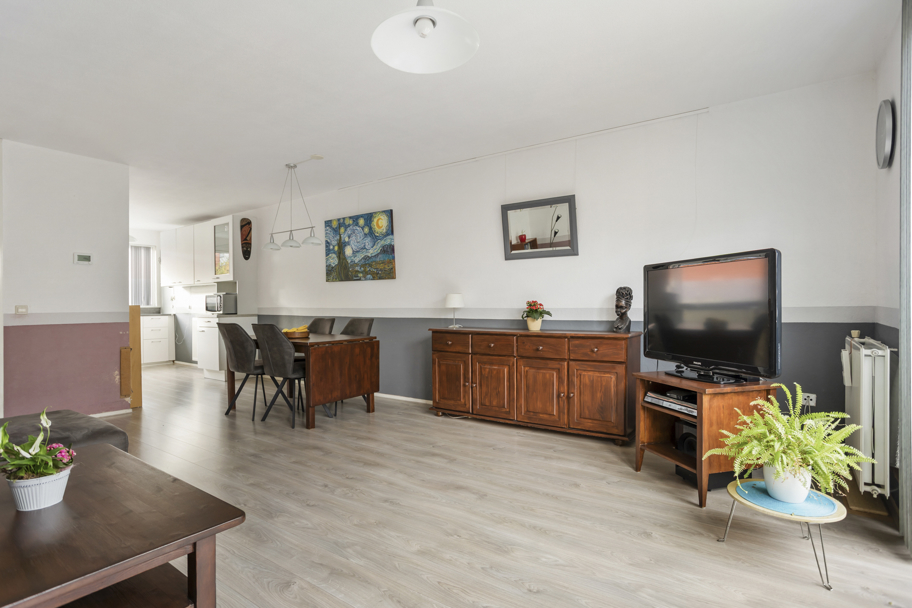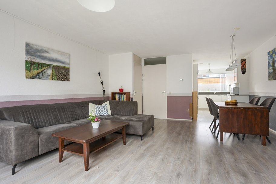 Zowel de woonkamer als de keuken hebben een verzorgde laminaatvloer en de hal heeft een Novilon-vloer met tegelpatroon.