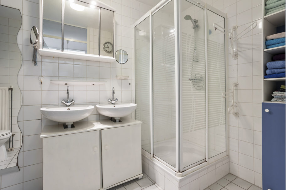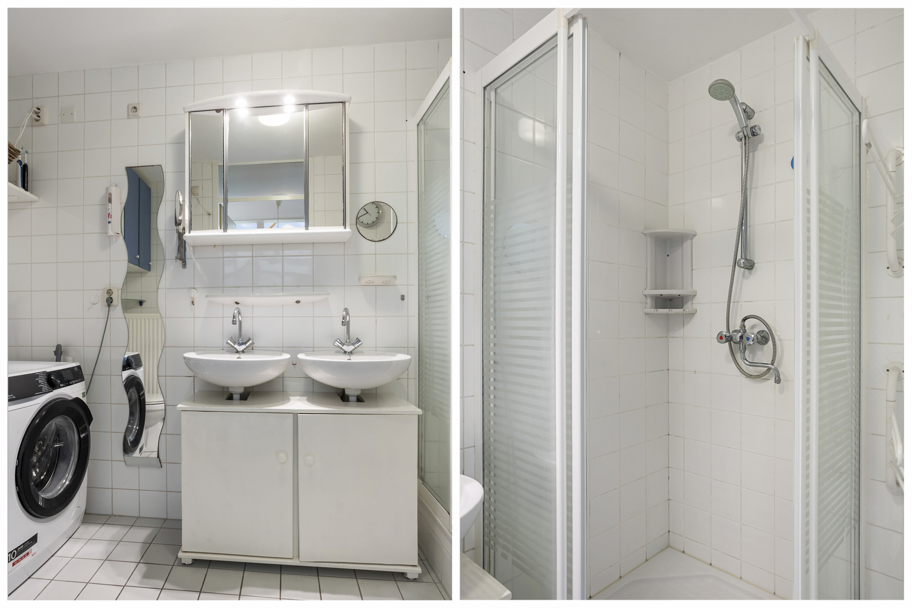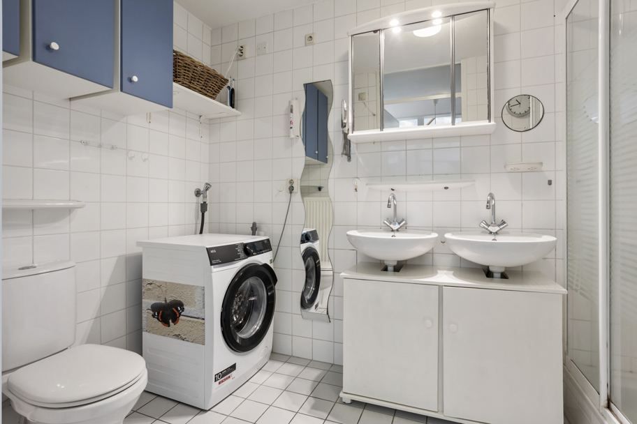 De tussengelegen eenvoudige badkamer is breed geheel betegeld met witte tegels, heeft een toilet, dubbele vaste wastafel met kastjes eronder en douchecabine. Ook is hier de opstelplaats voor de wasmachine.
